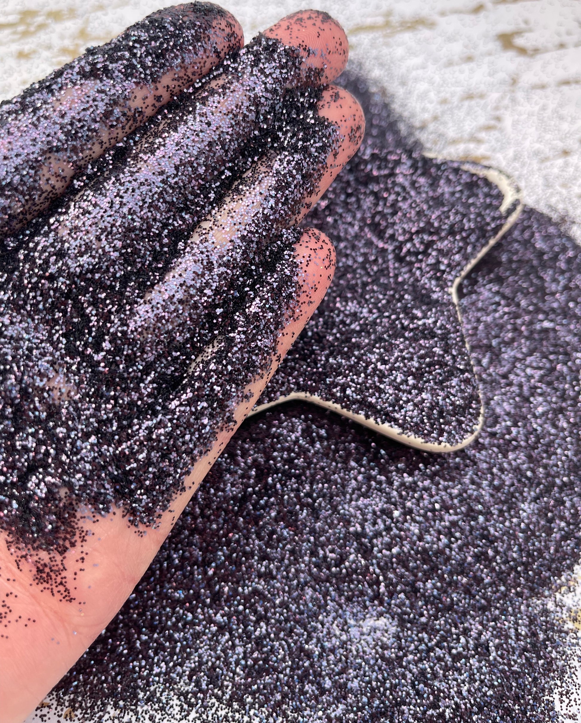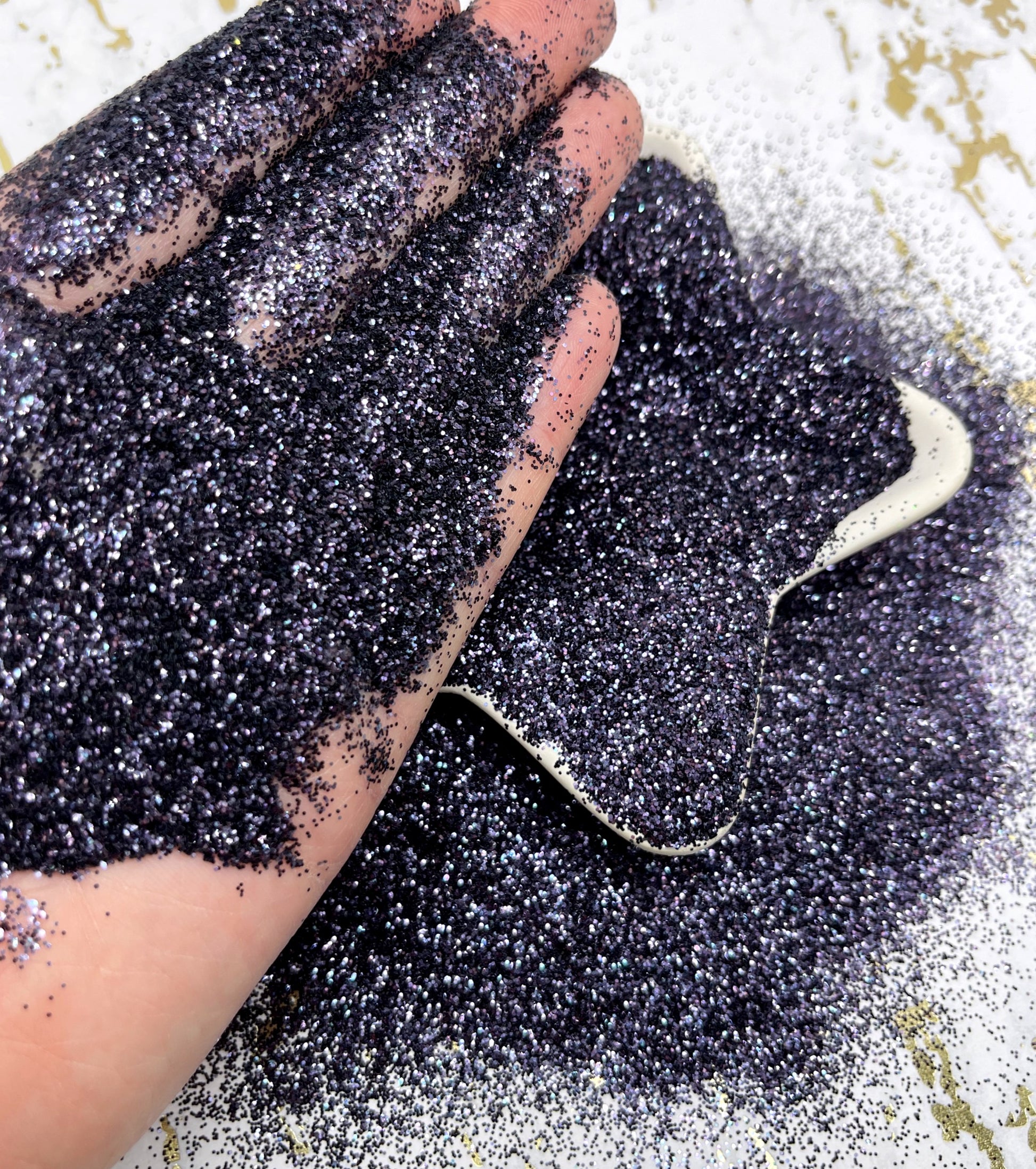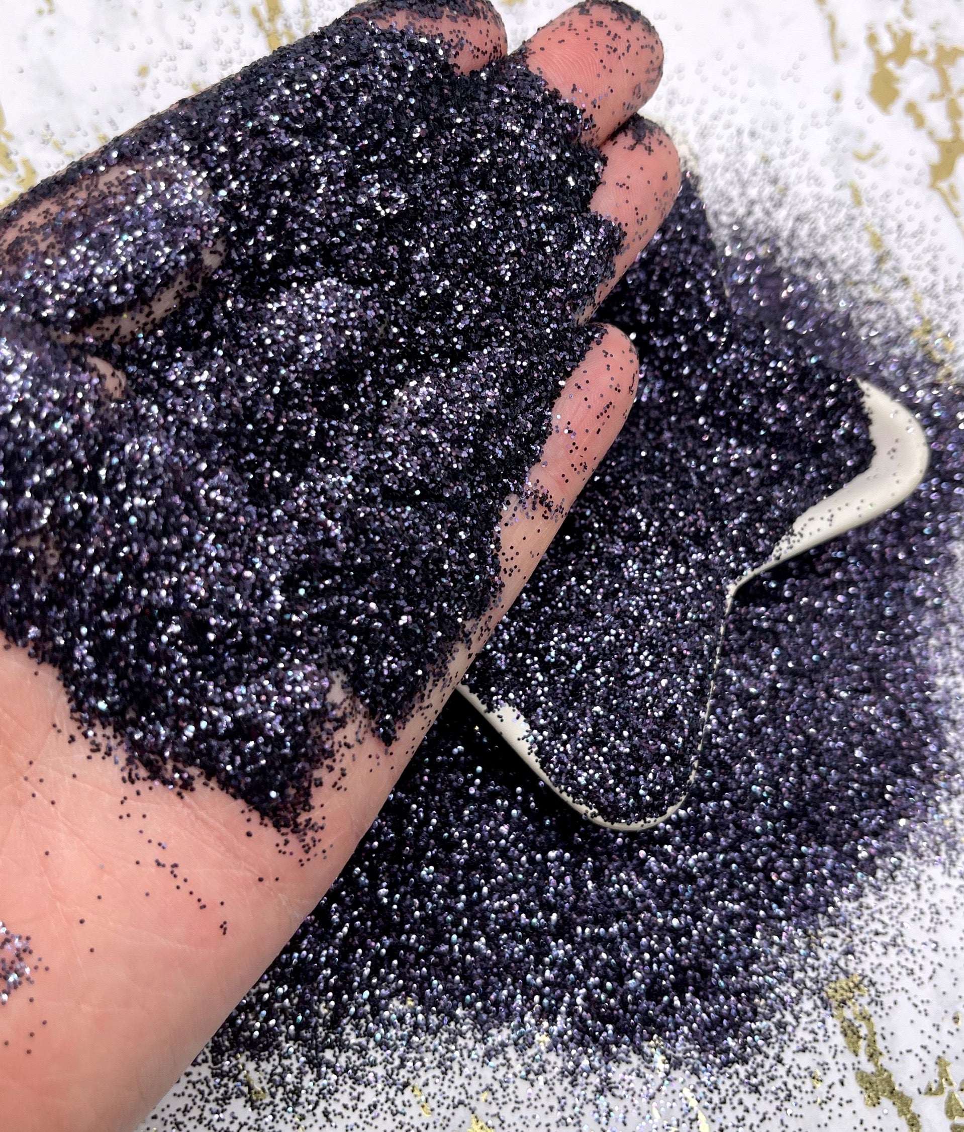 Abyss is an amazing black / deep charcoal gray solid metallic glitter. It has a slight purple undertone. See pics