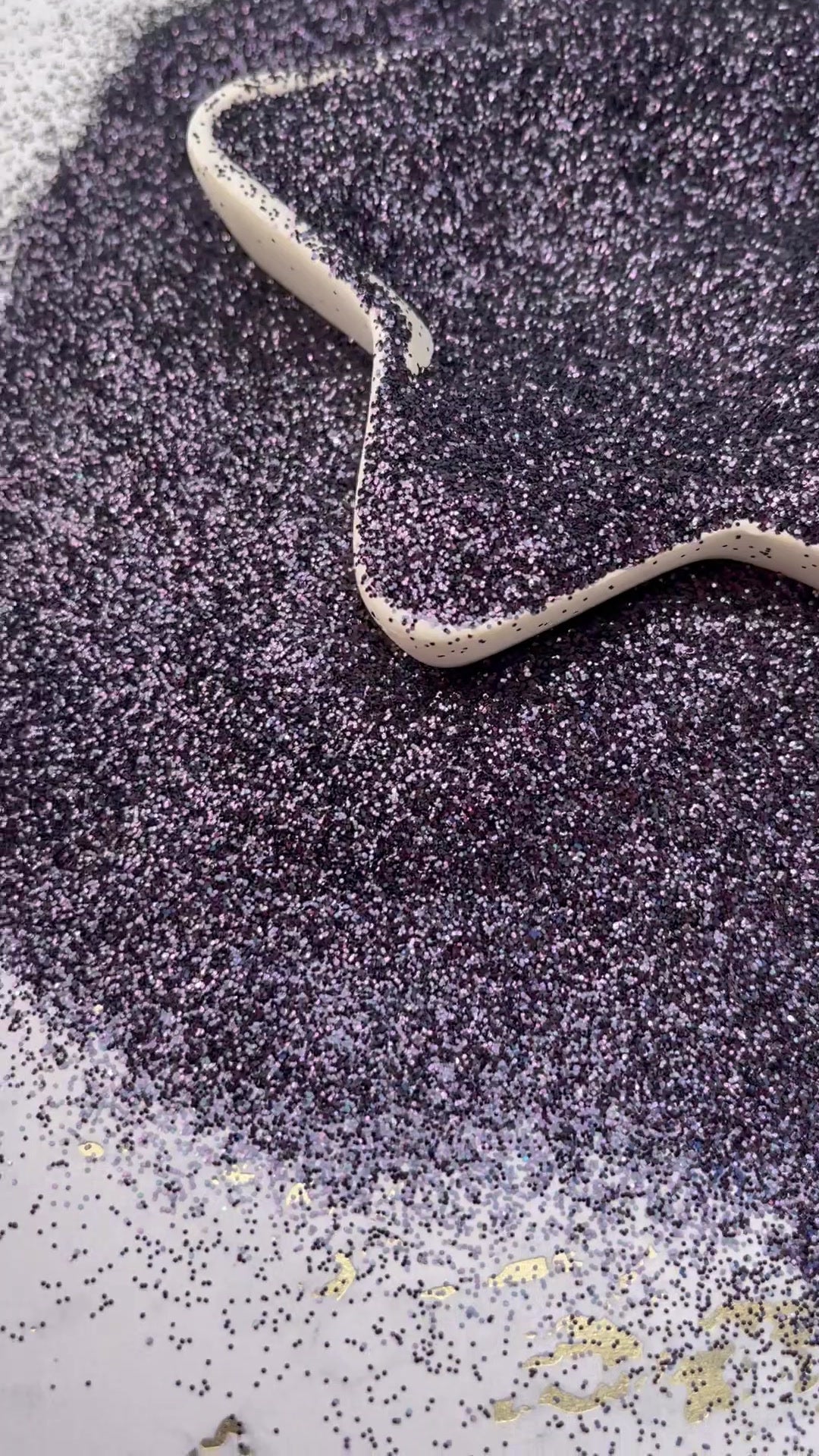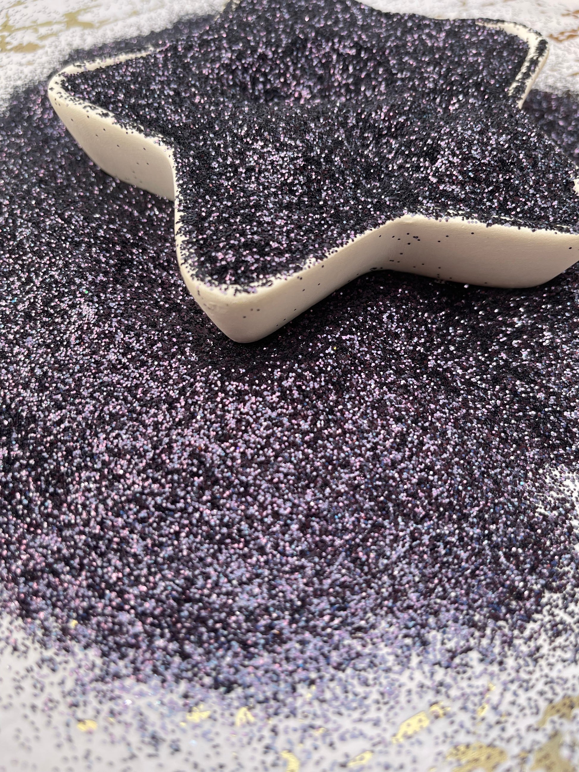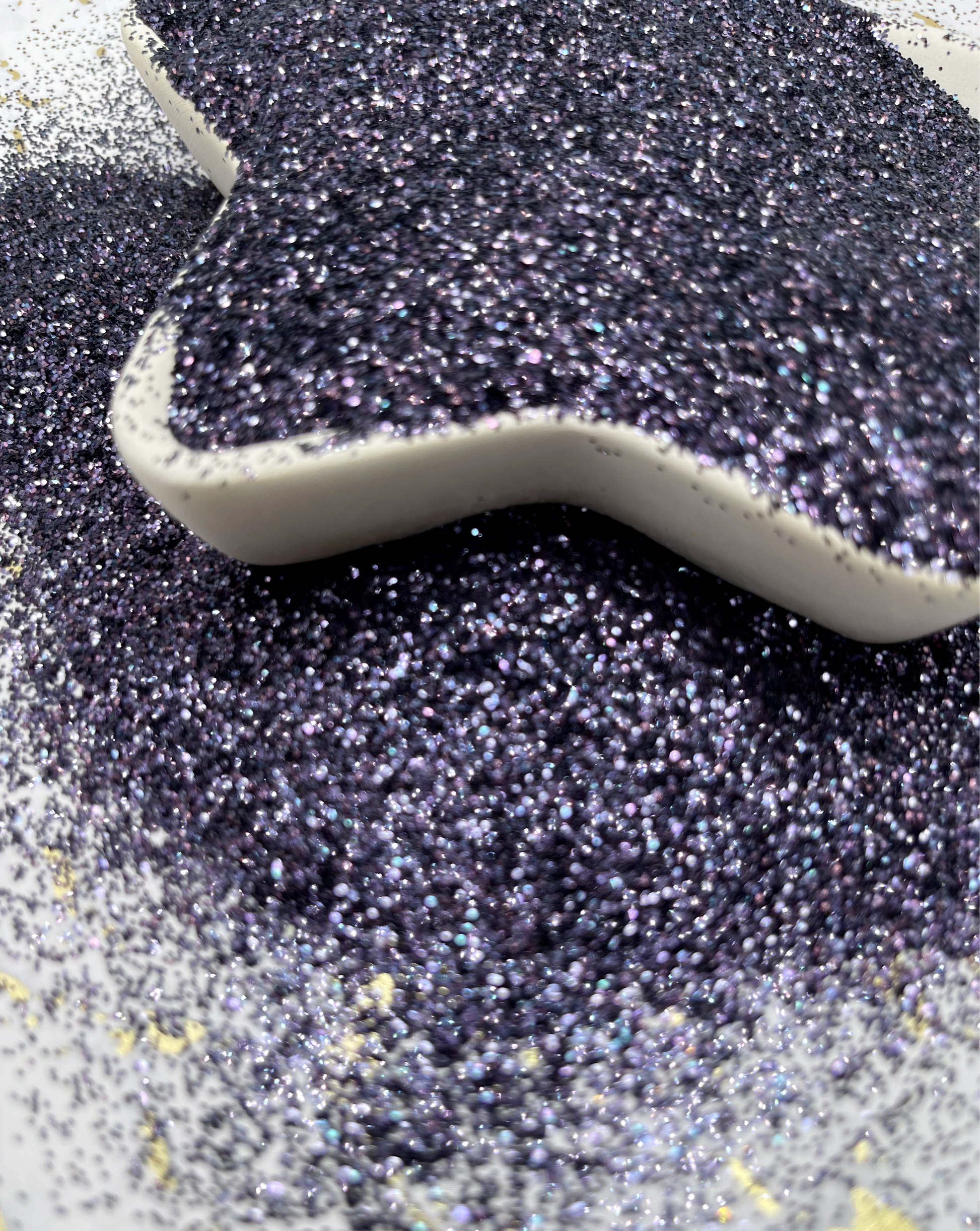 Abyss is an amazing black / deep charcoal gray solid metallic glitter. It has a slight purple undertone. See pics