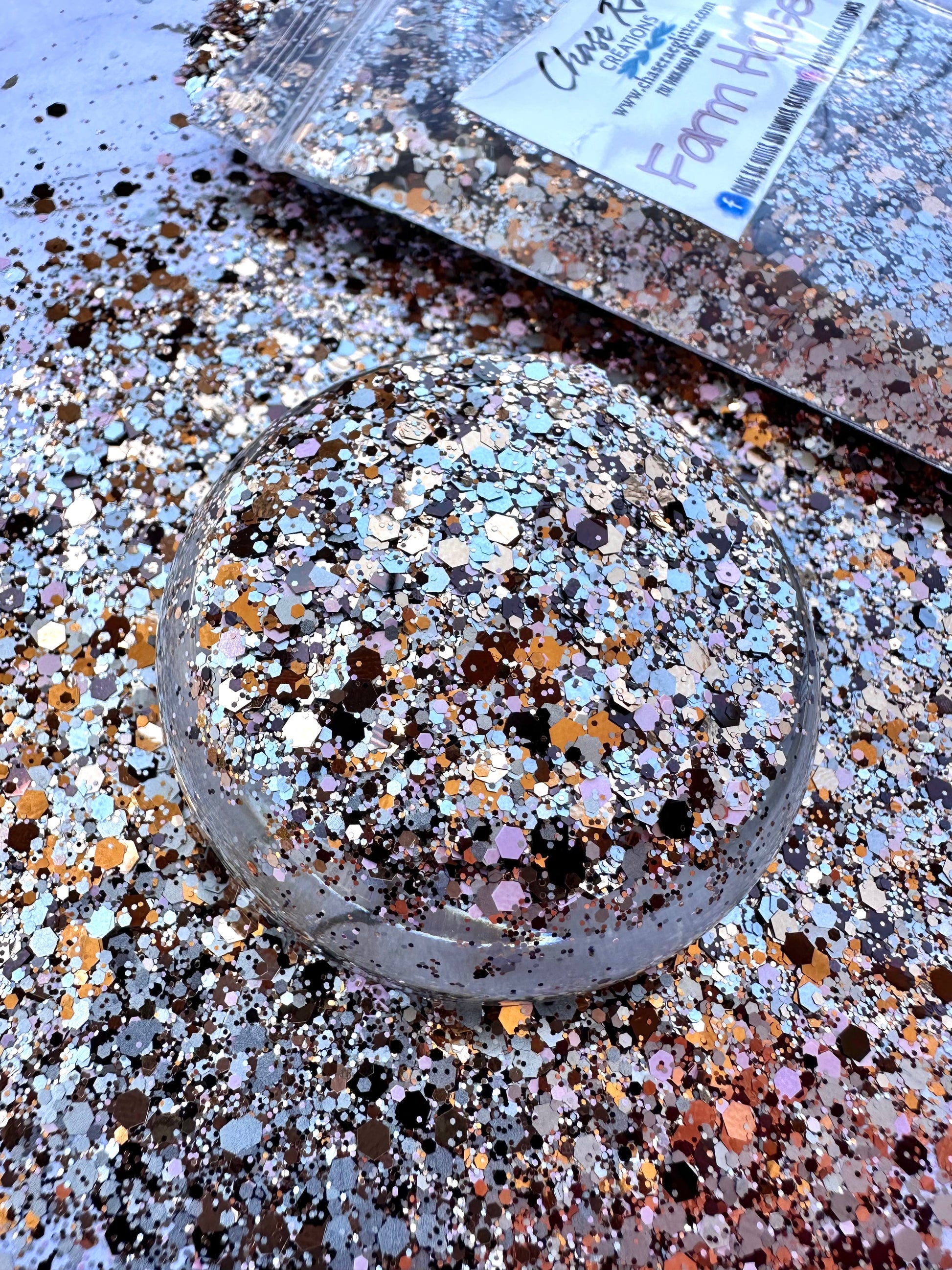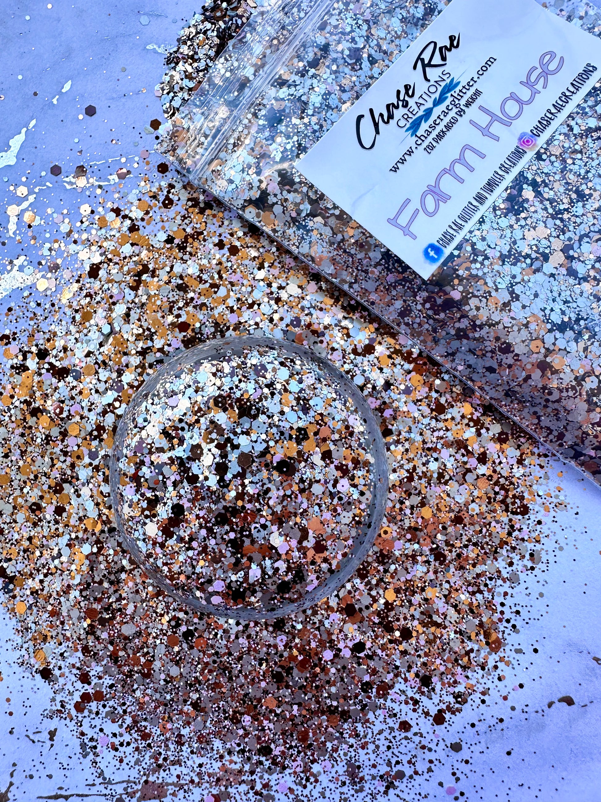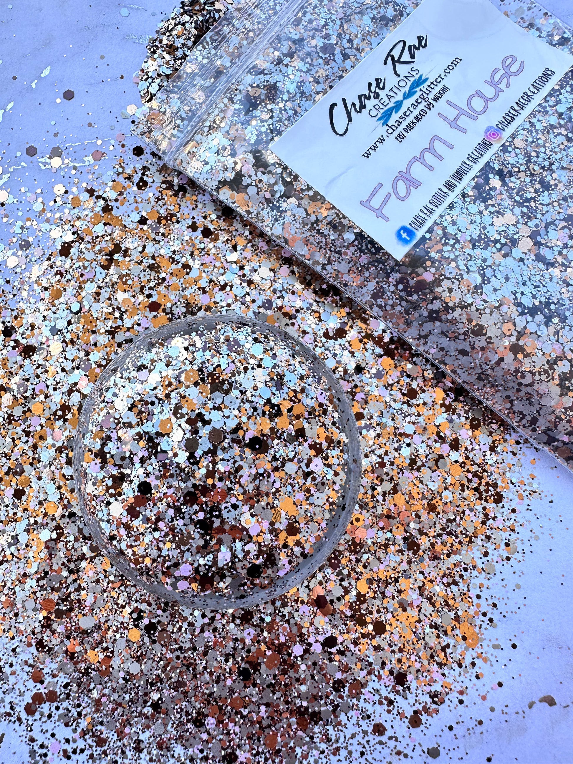 Farm House is a beautiful chunky mixed glitter with golden brown, dark brown, silver, and soft pink.