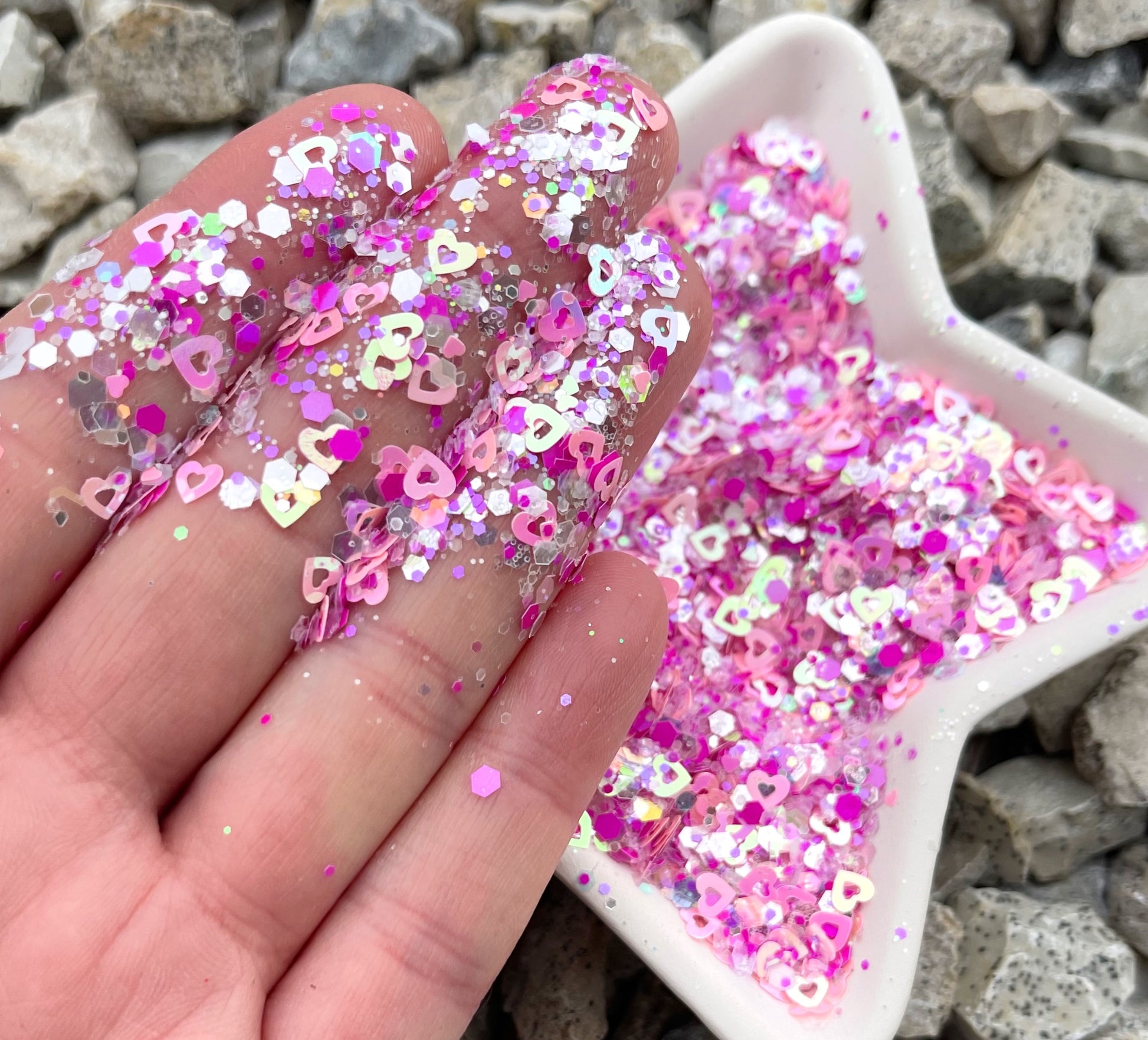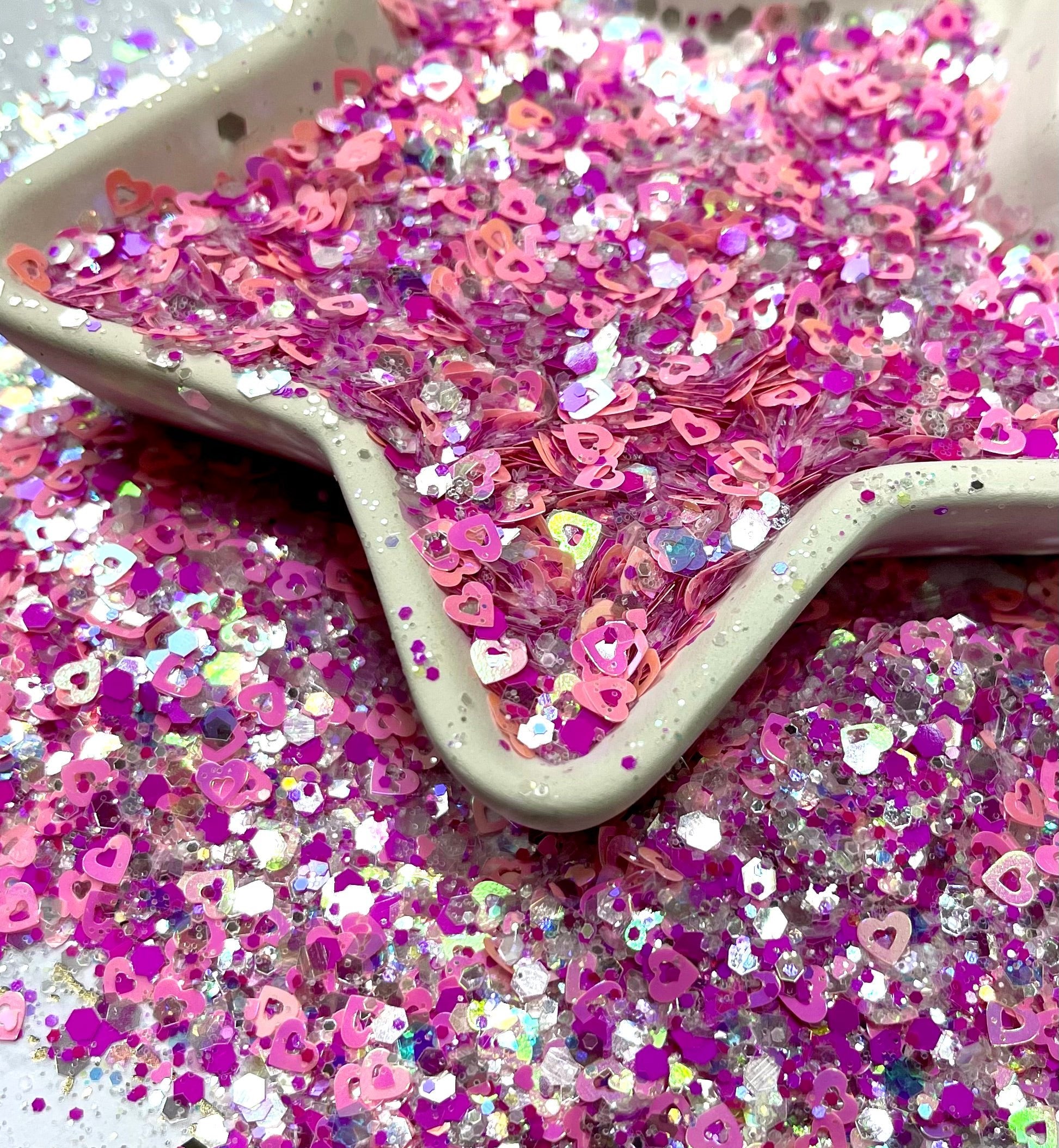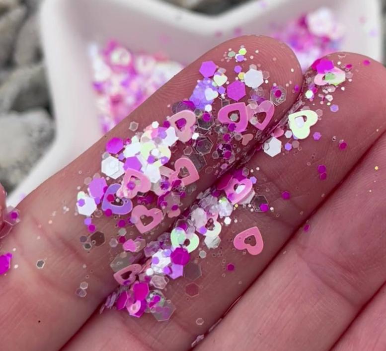 Be mine is the perfect Valentines Glitter. Beautiful iridescent hearts are mixed in with multi colored glitter.