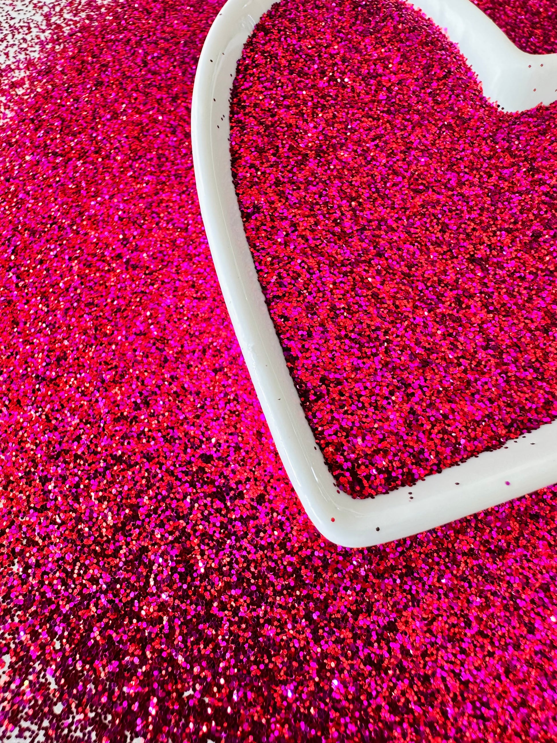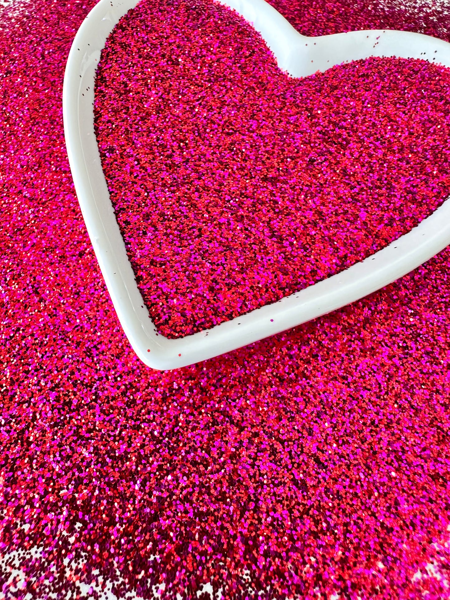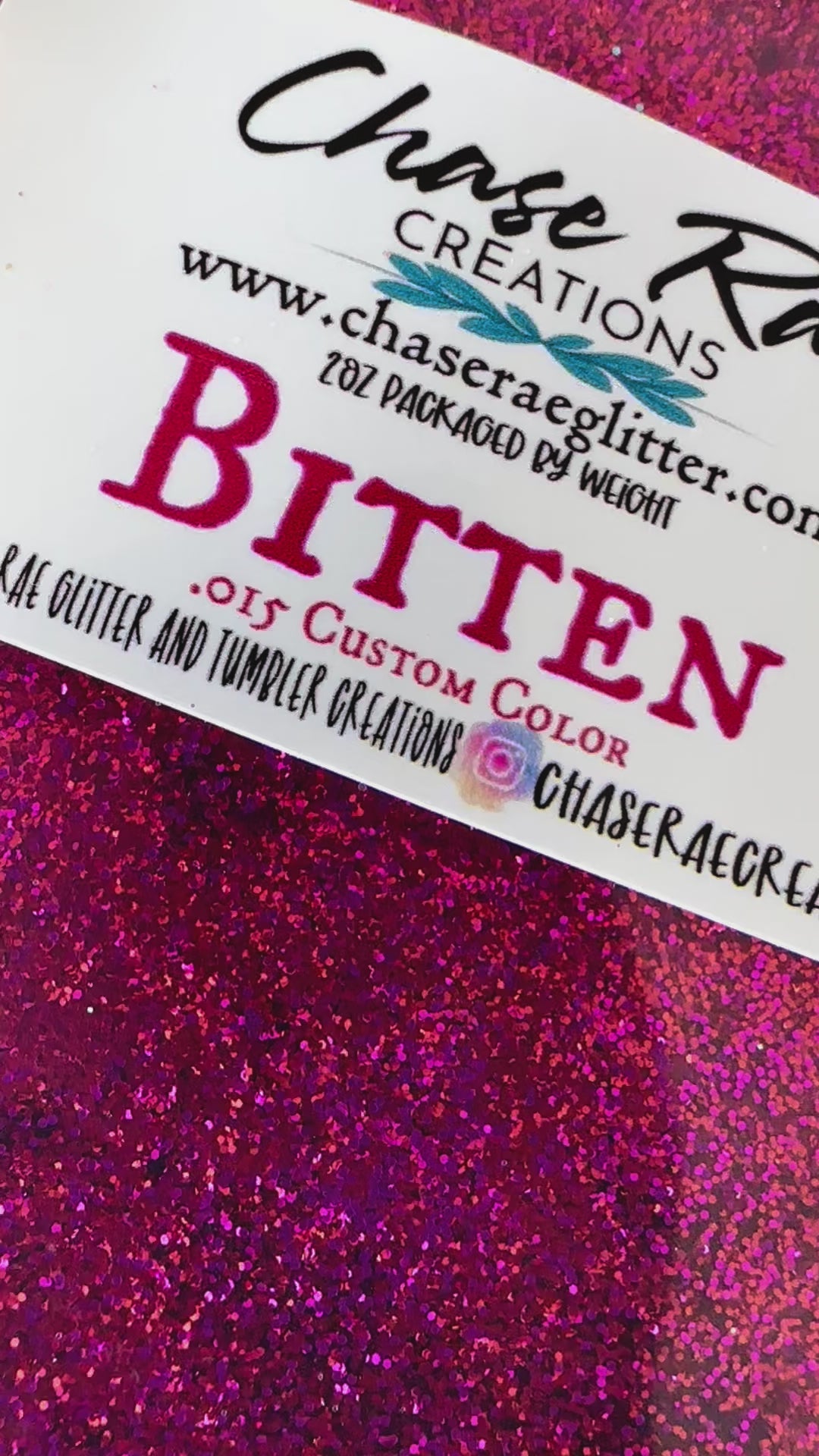 Bitten is a deep, pink to red metallic glitter. Deep magenta.