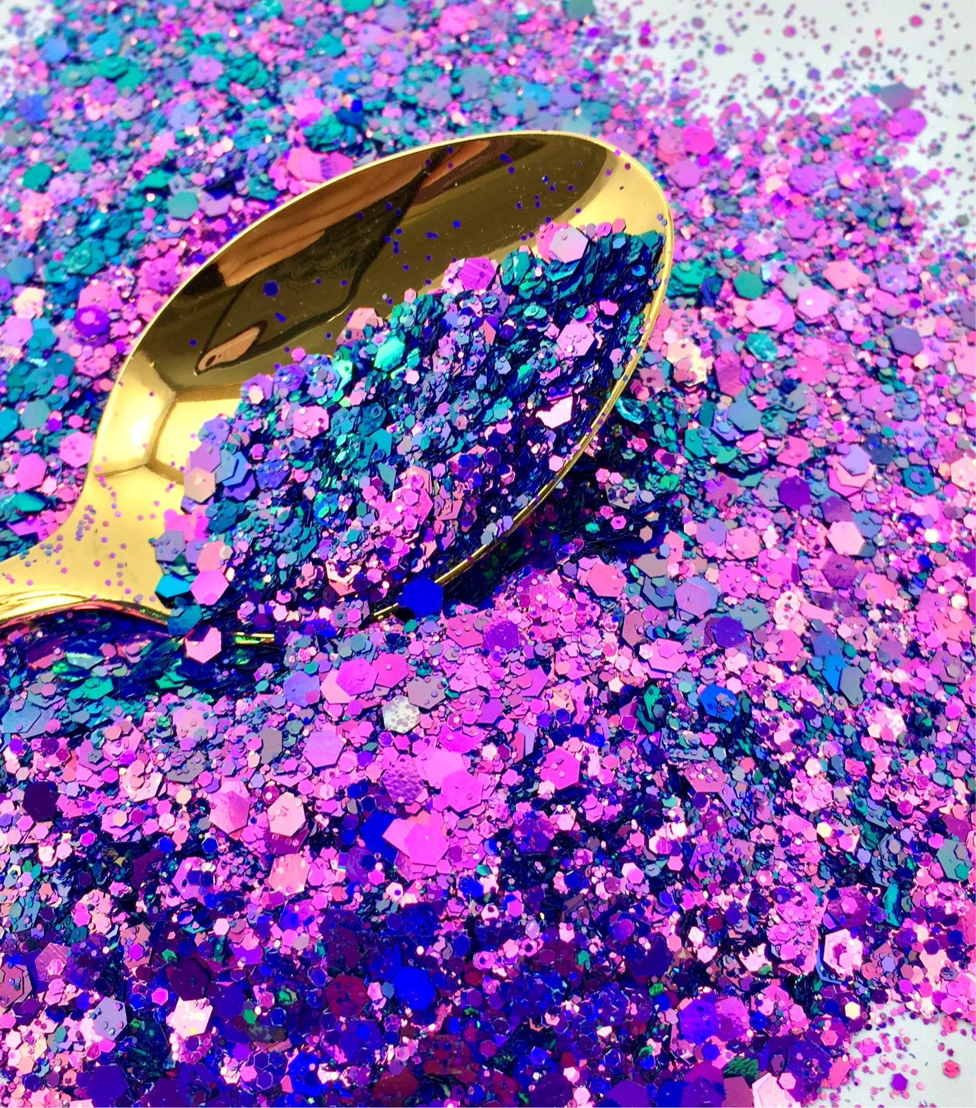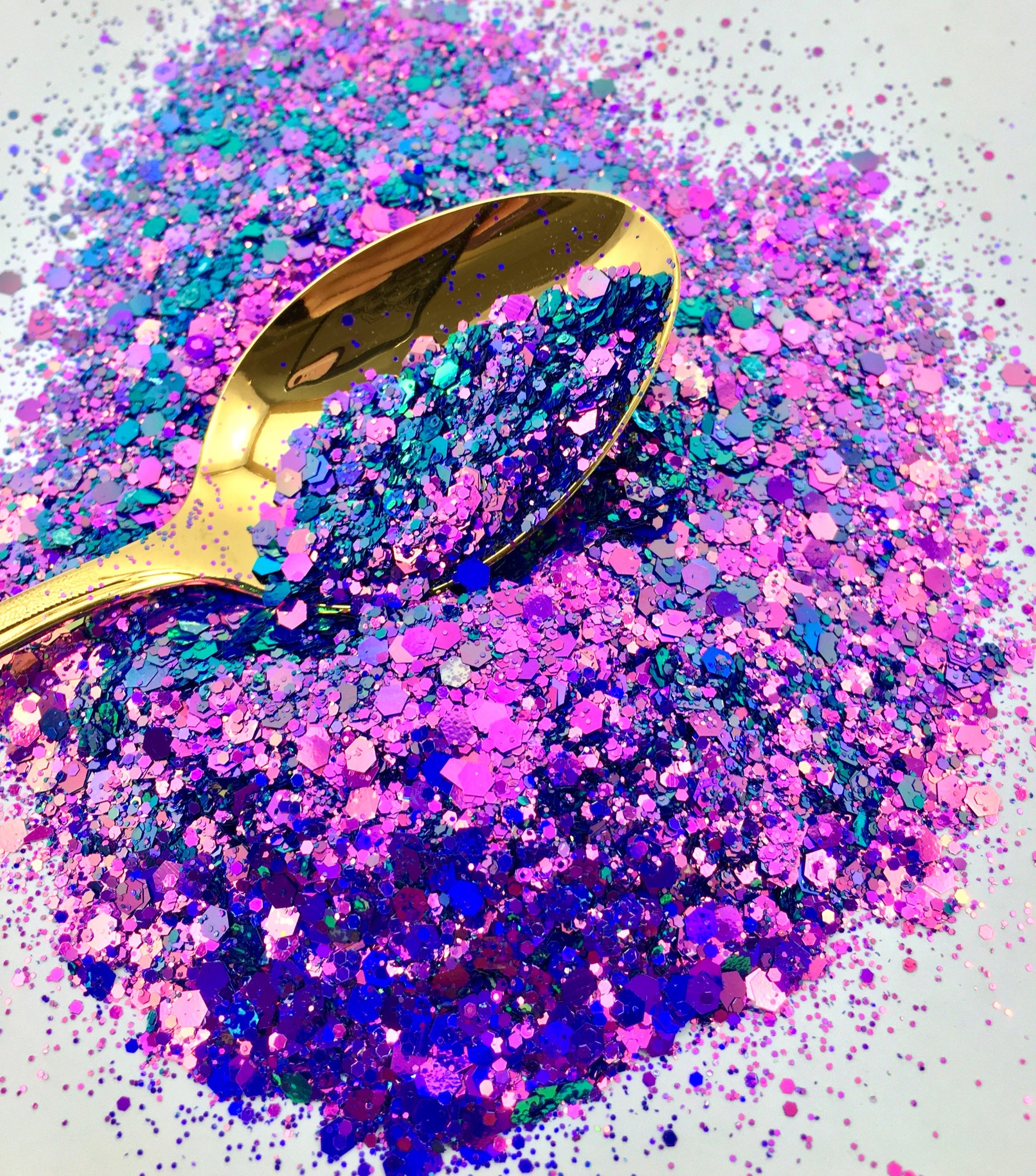 Pink and magenta with a teal shift. Chunky mix. All metallic and high sparkle. Truly a beautiful color shifting glitter!