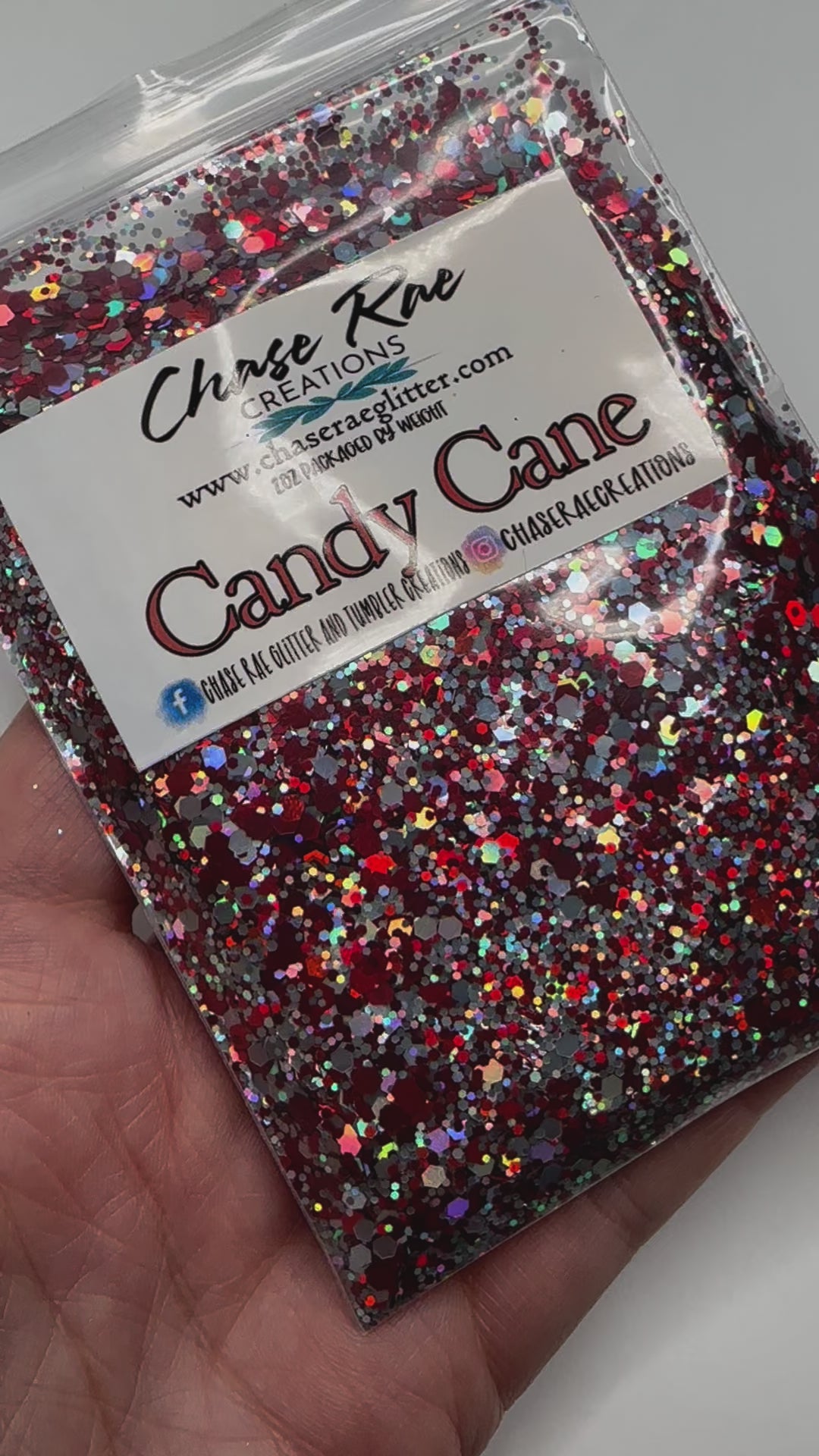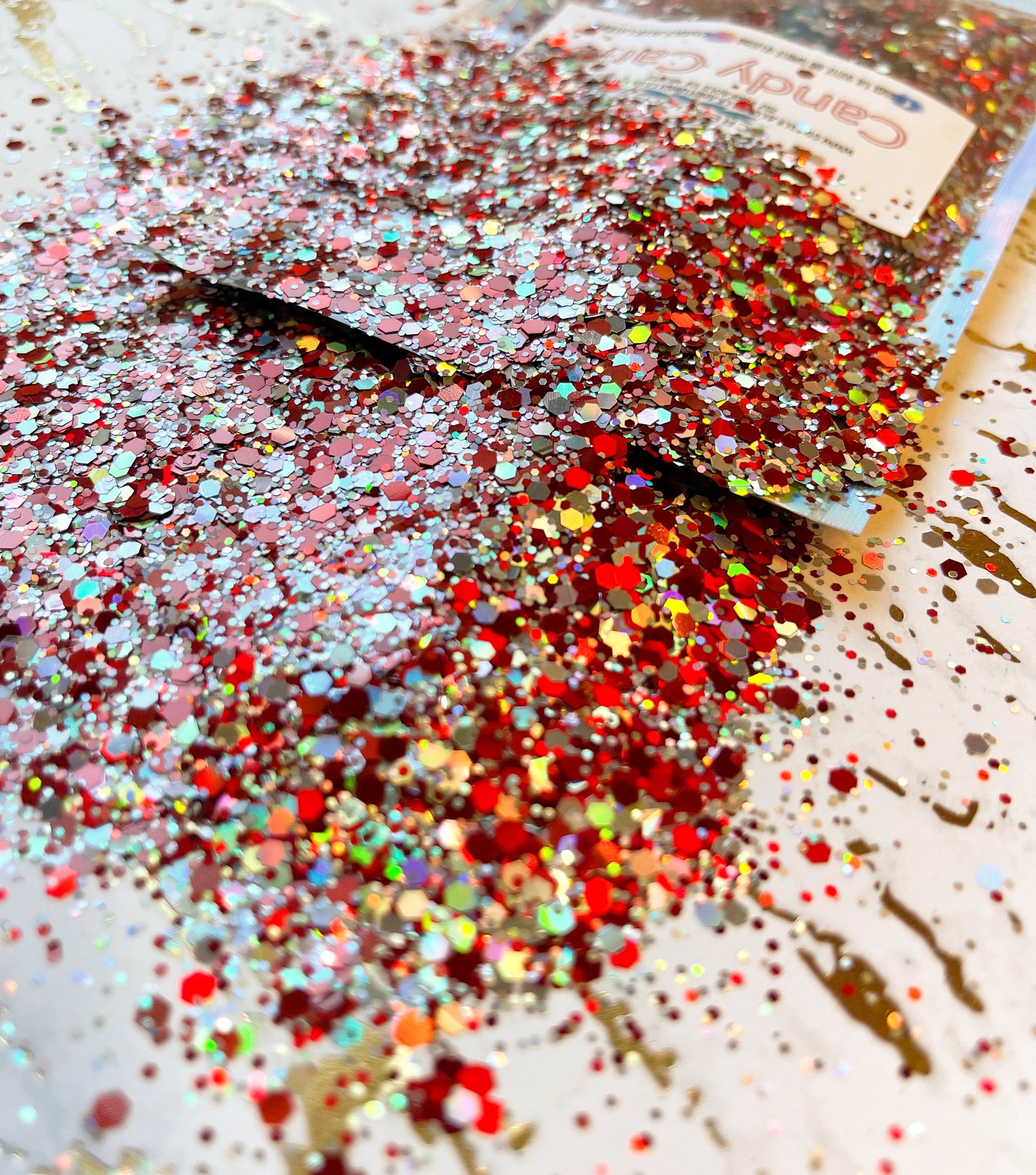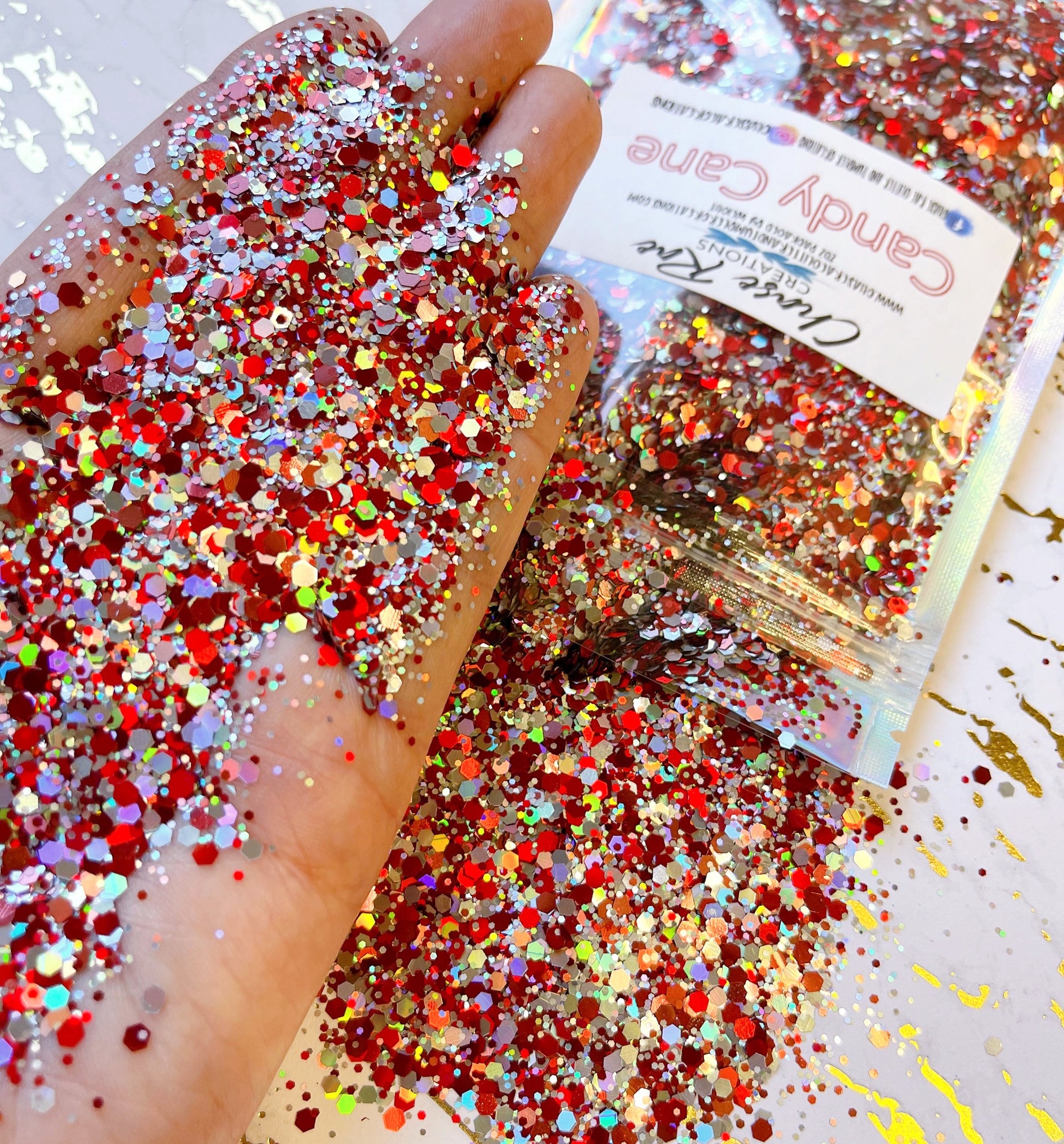 Candy Cane is a beautiful red and silver holographic chunky mix.