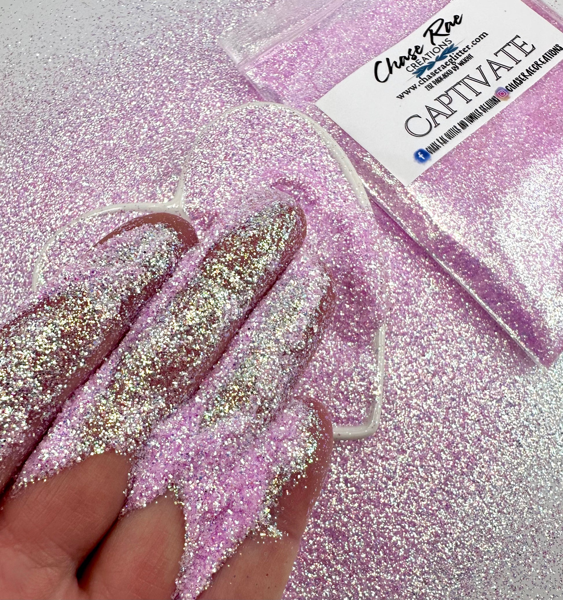 Captivate is an iridescent, soft, pink to purple glitter. Semi translucent and high sparkle.