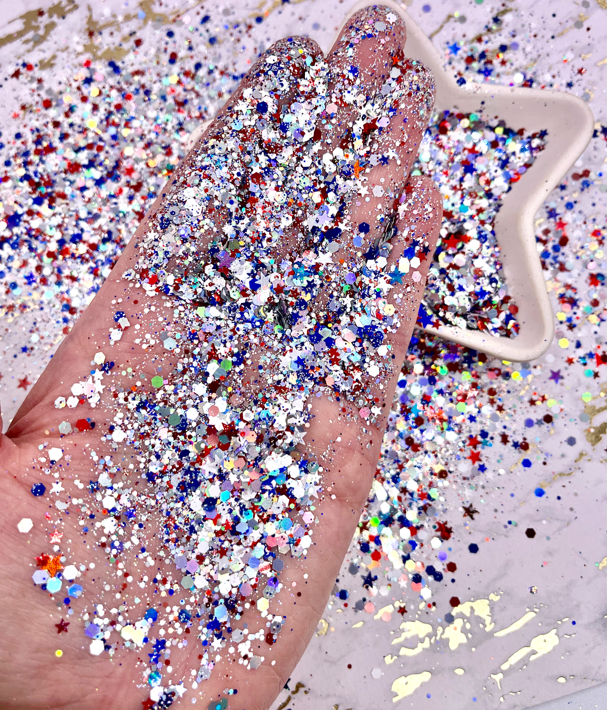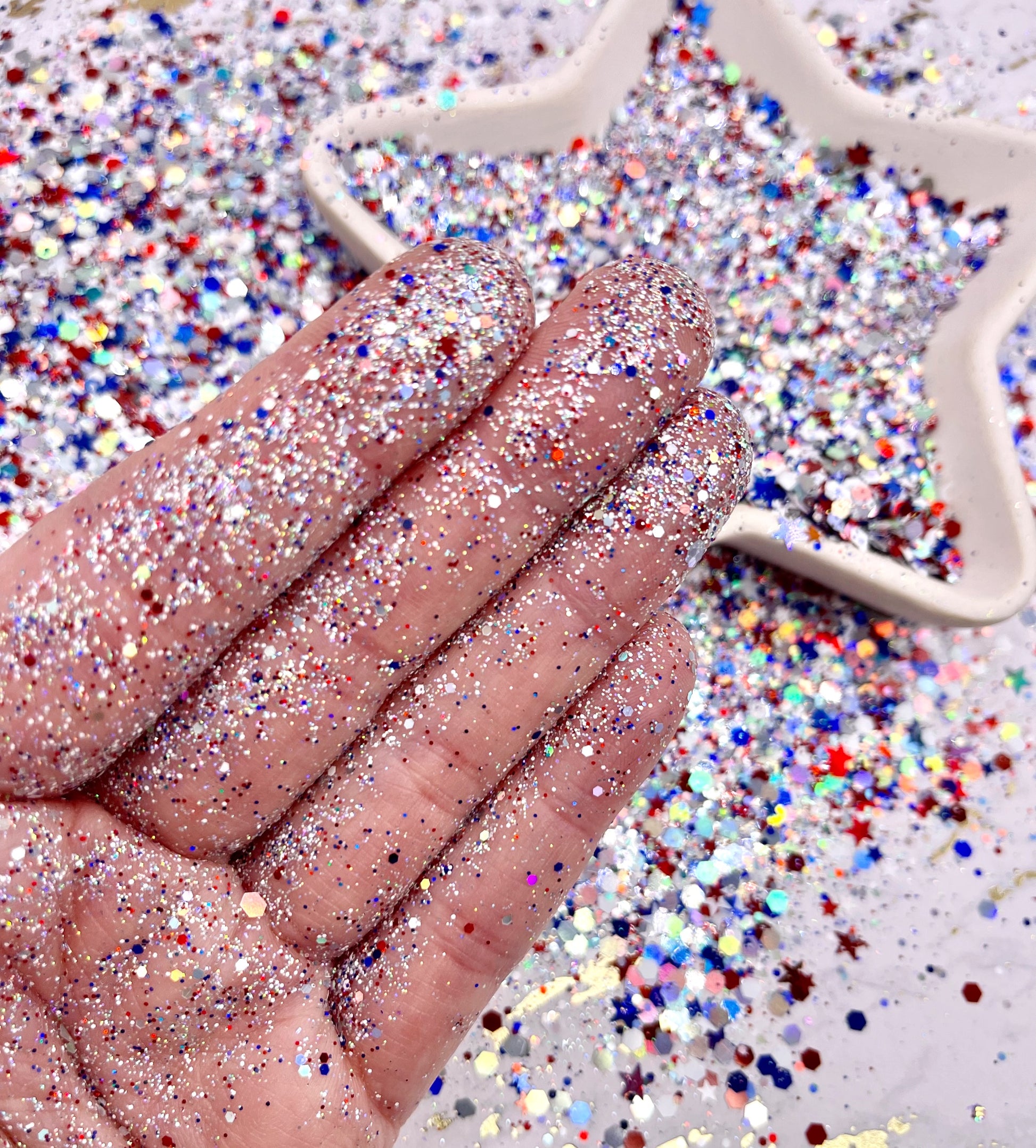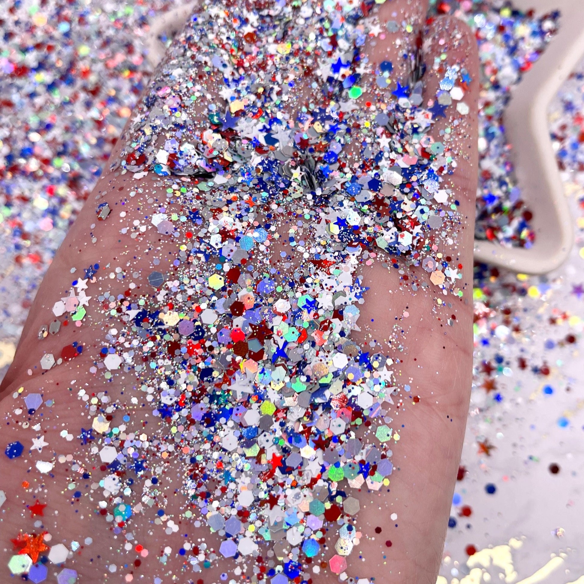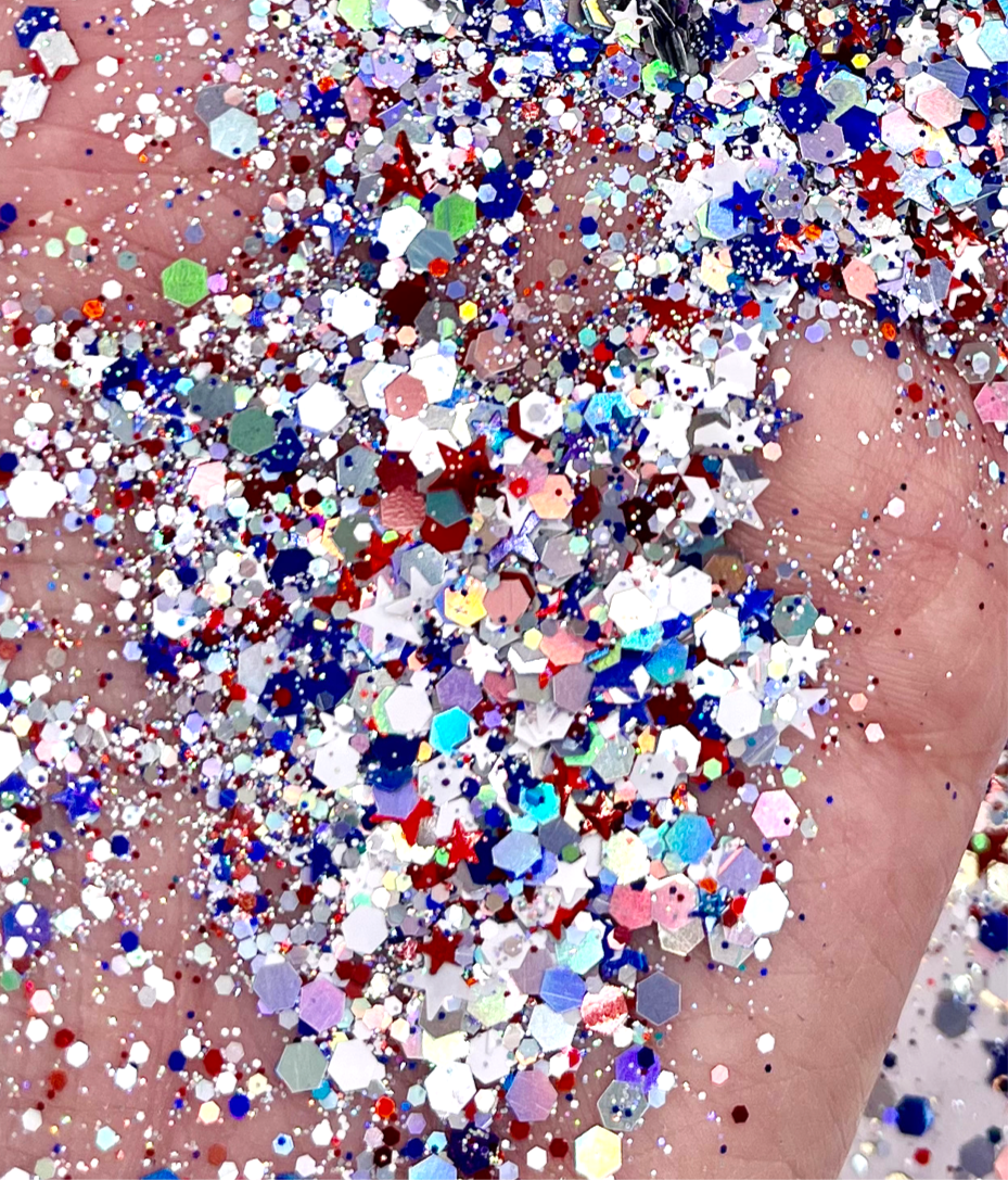 Centennial is the perfect patriotic mix. Red, blue, silver holographic plus stars. The fine silver holographic provides excellent coverage!