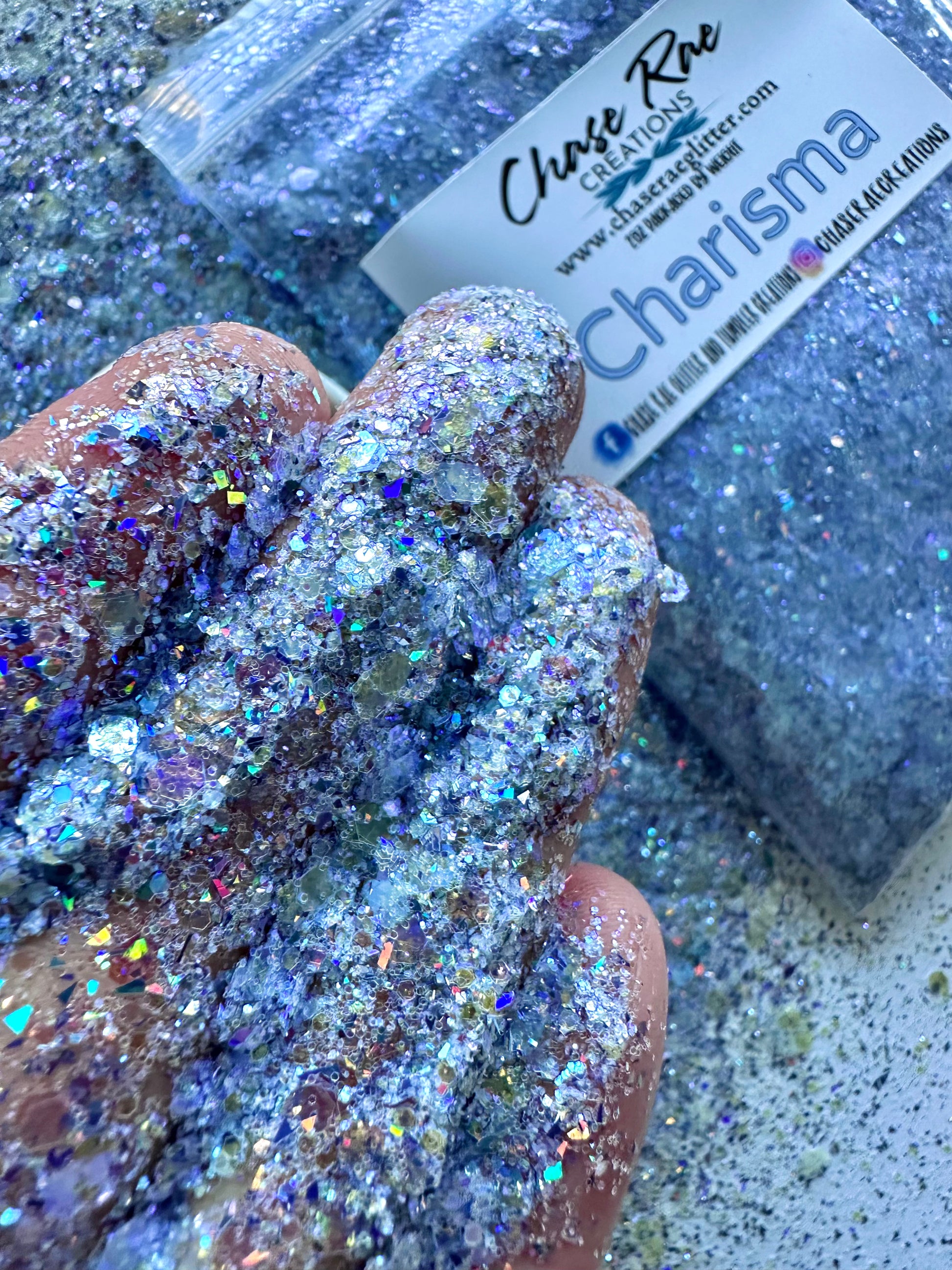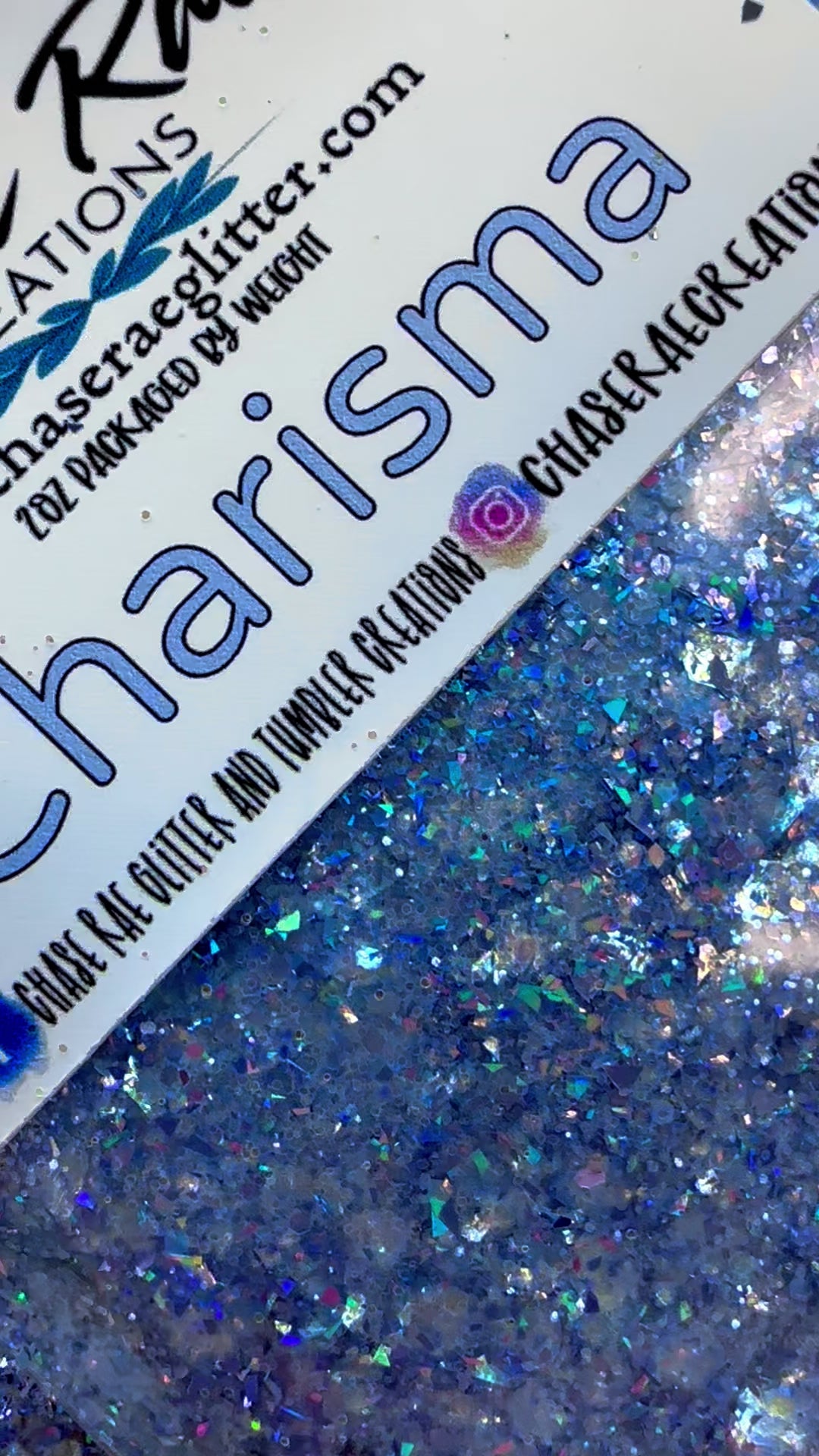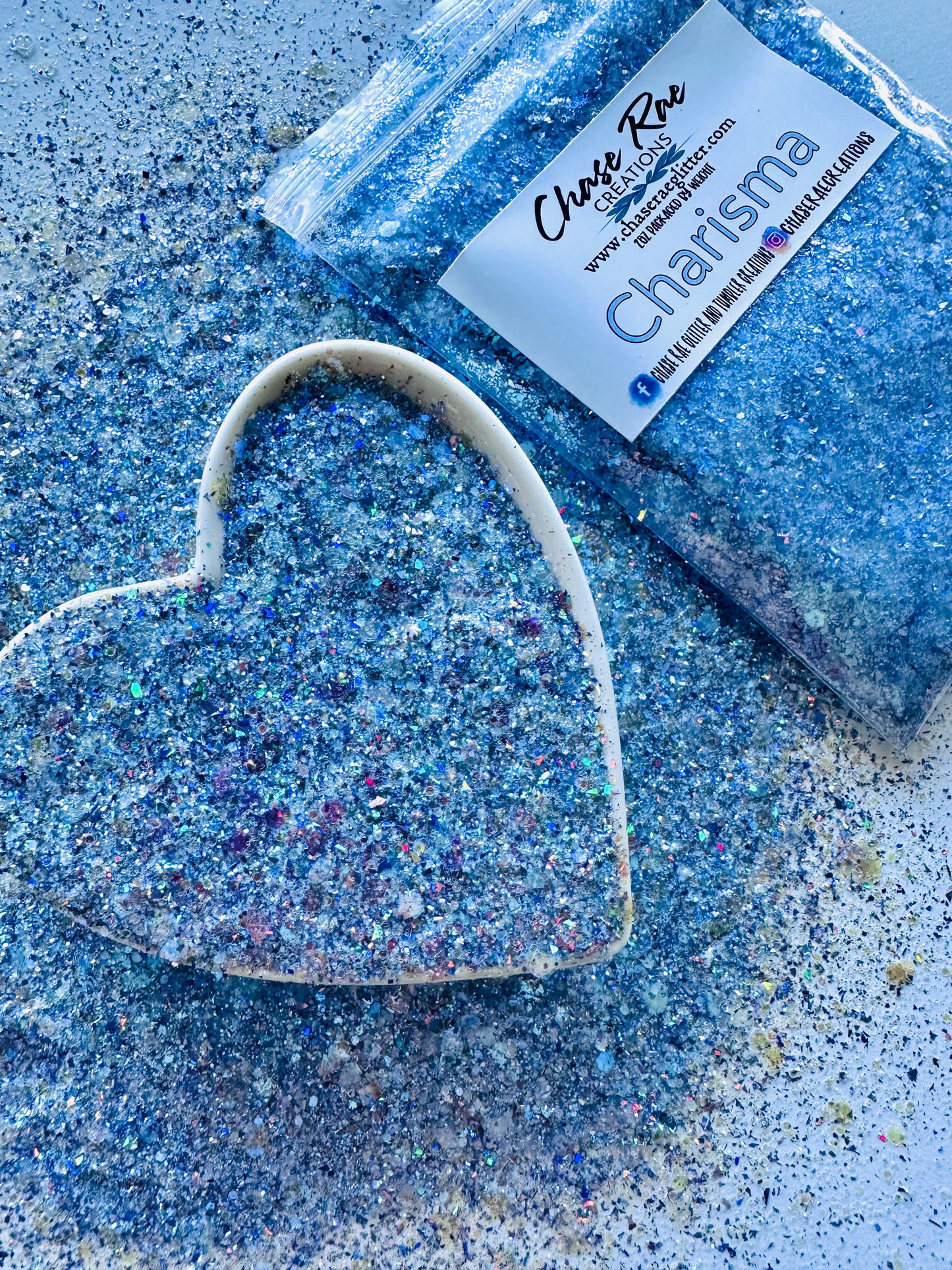 Charisma is a unique chunky mix. Is it blue? Is it purple? It all depends on how you look at it! Semi translucent.