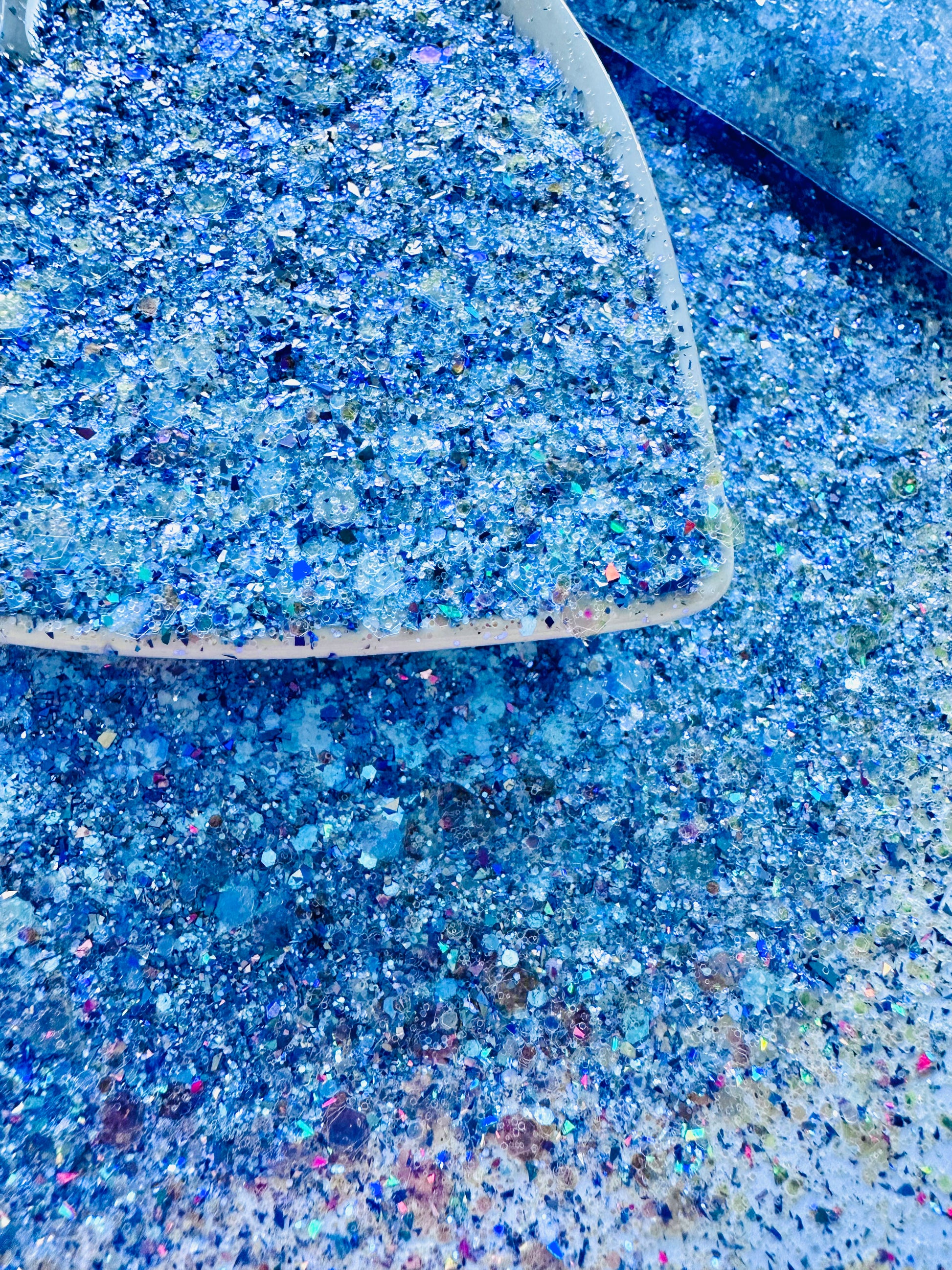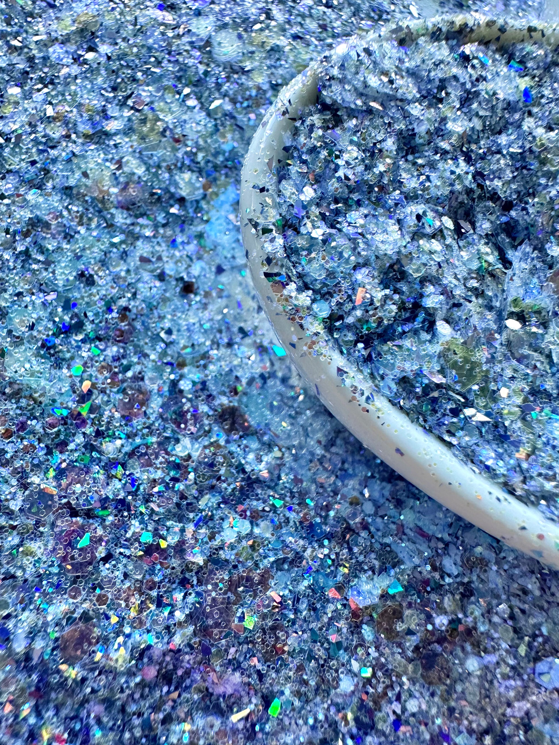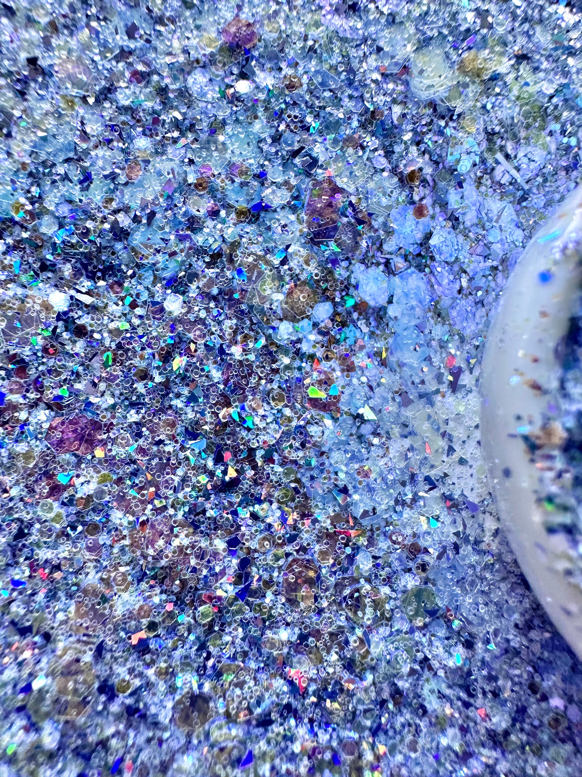 Charisma is a unique chunky mix. Is it blue? Is it purple? It all depends on how you look at it! Semi translucent.