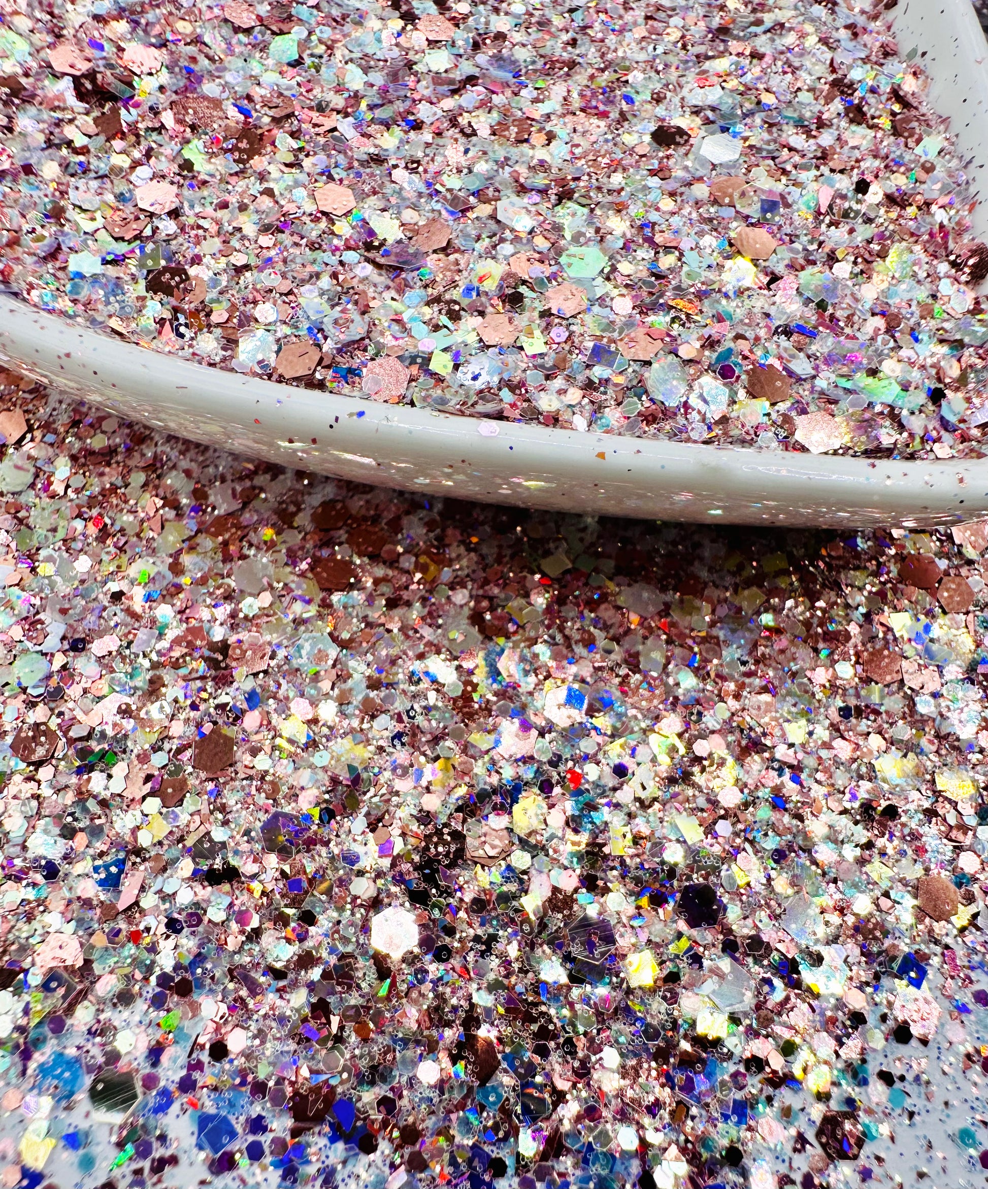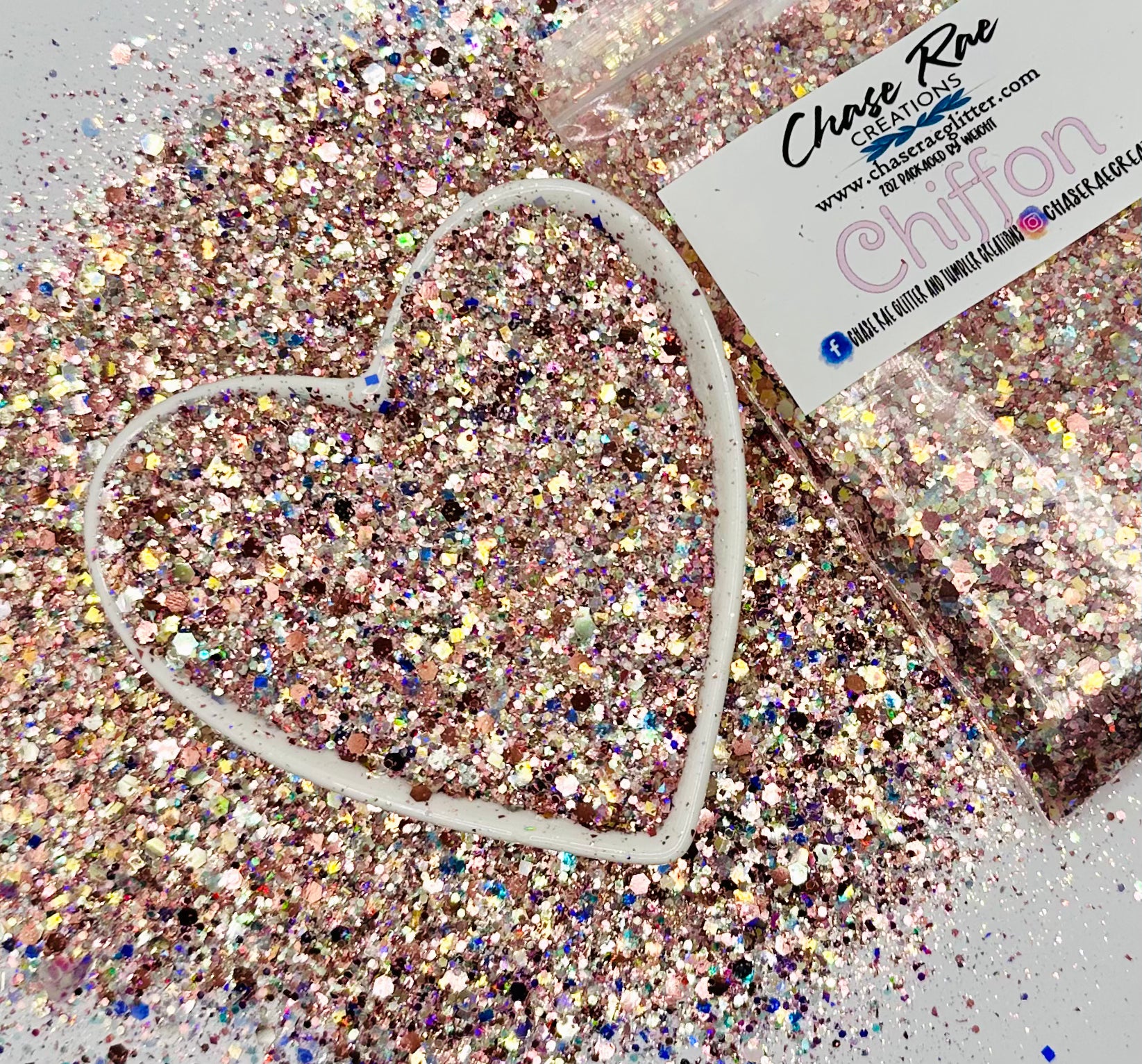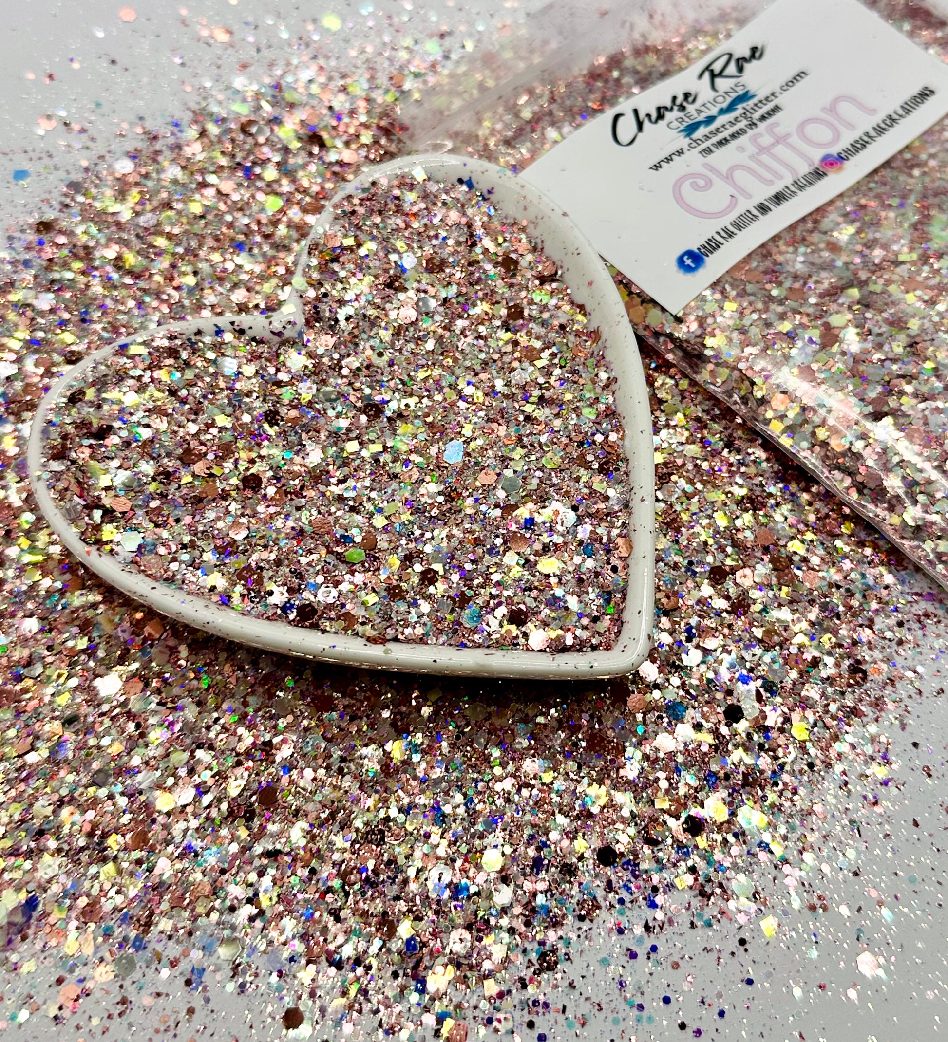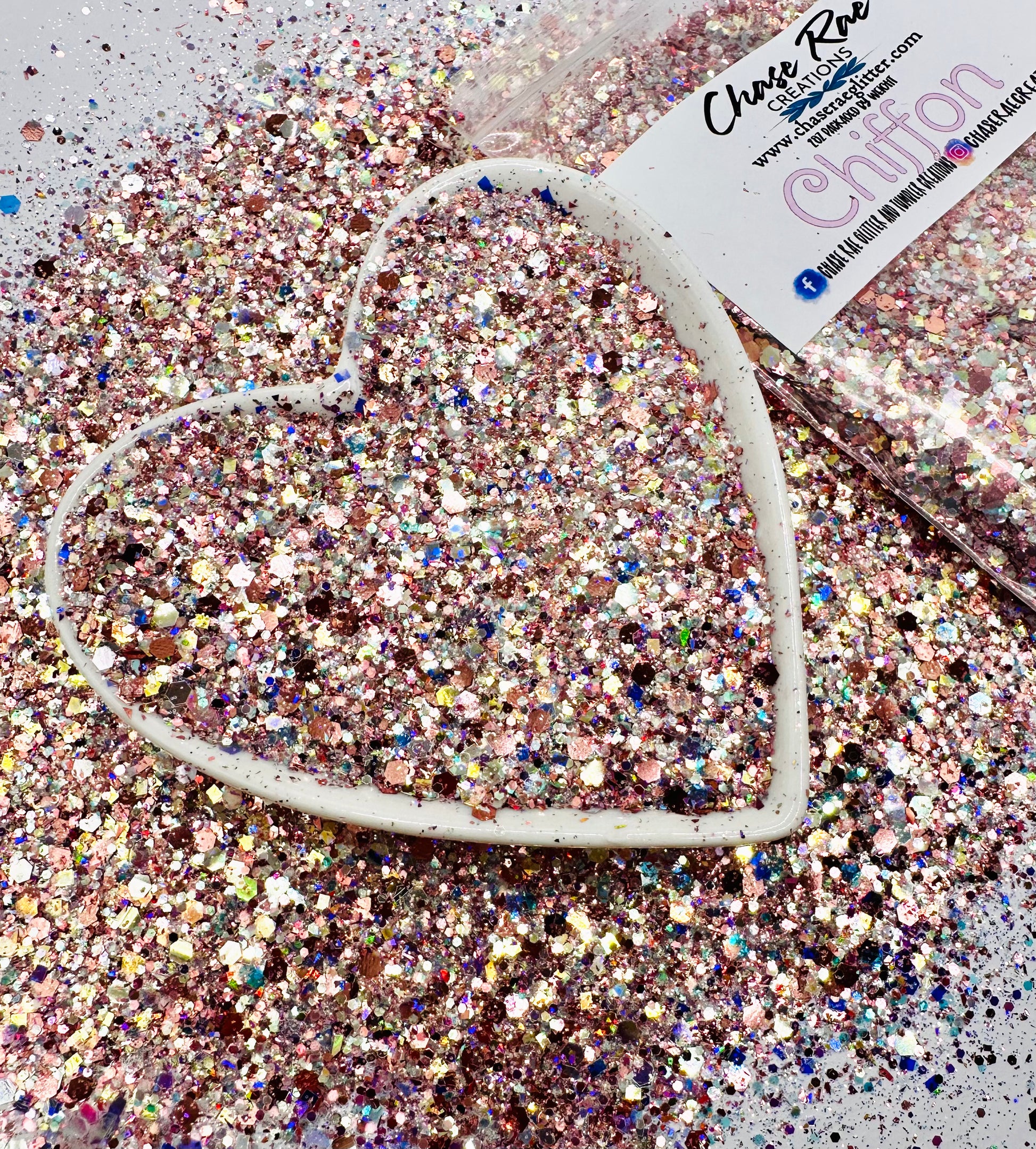 Chiffon is a Rose Gold and opal chunky mix. Along with the usual hexagonal shape, there are some smaller square cuts. It also has a slight holographic sparkle!