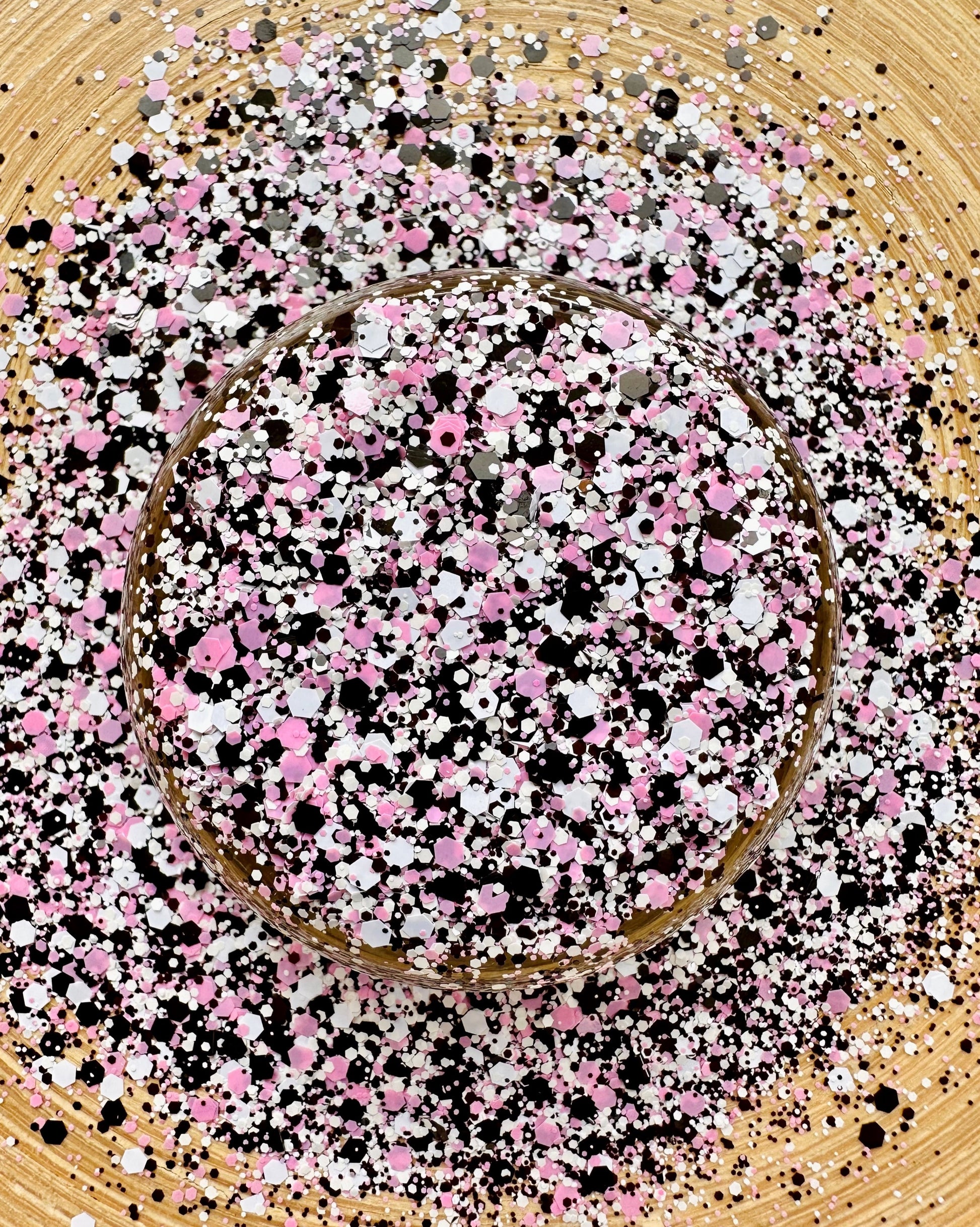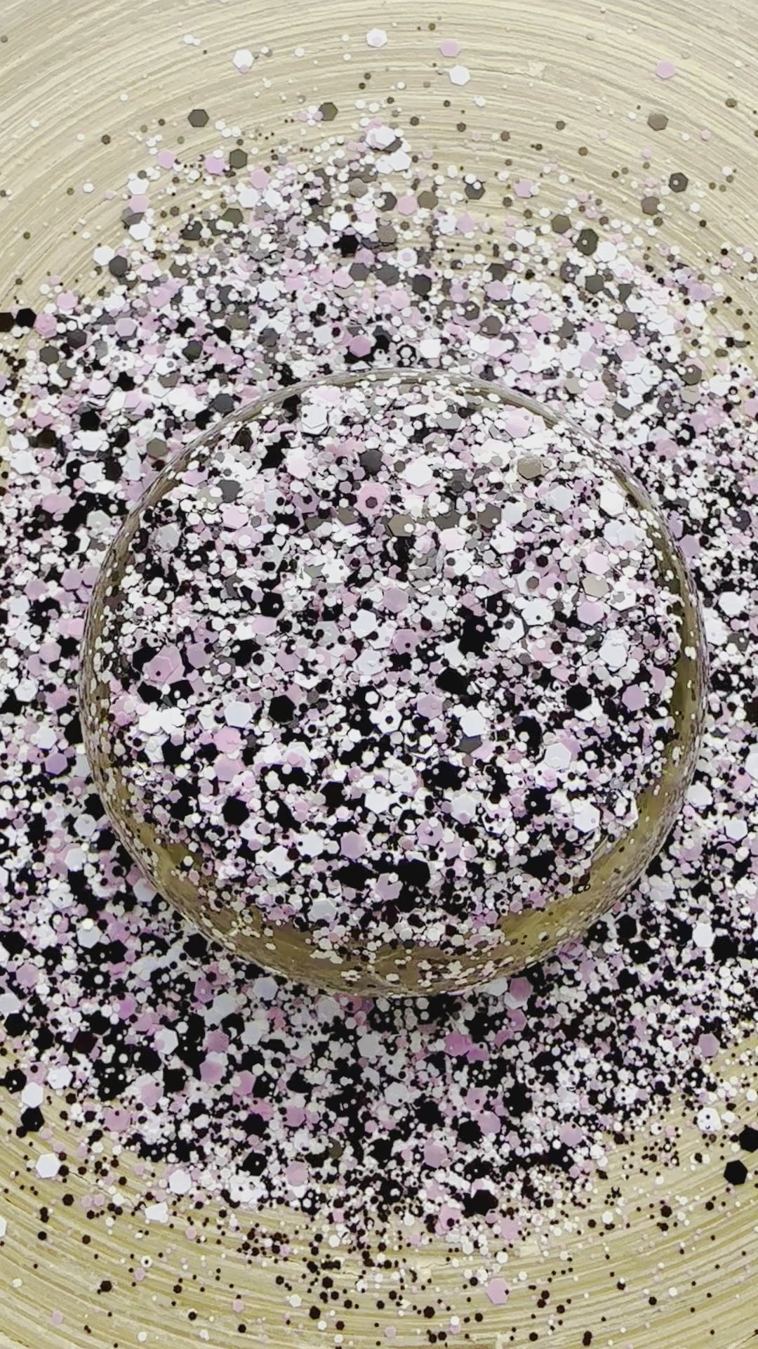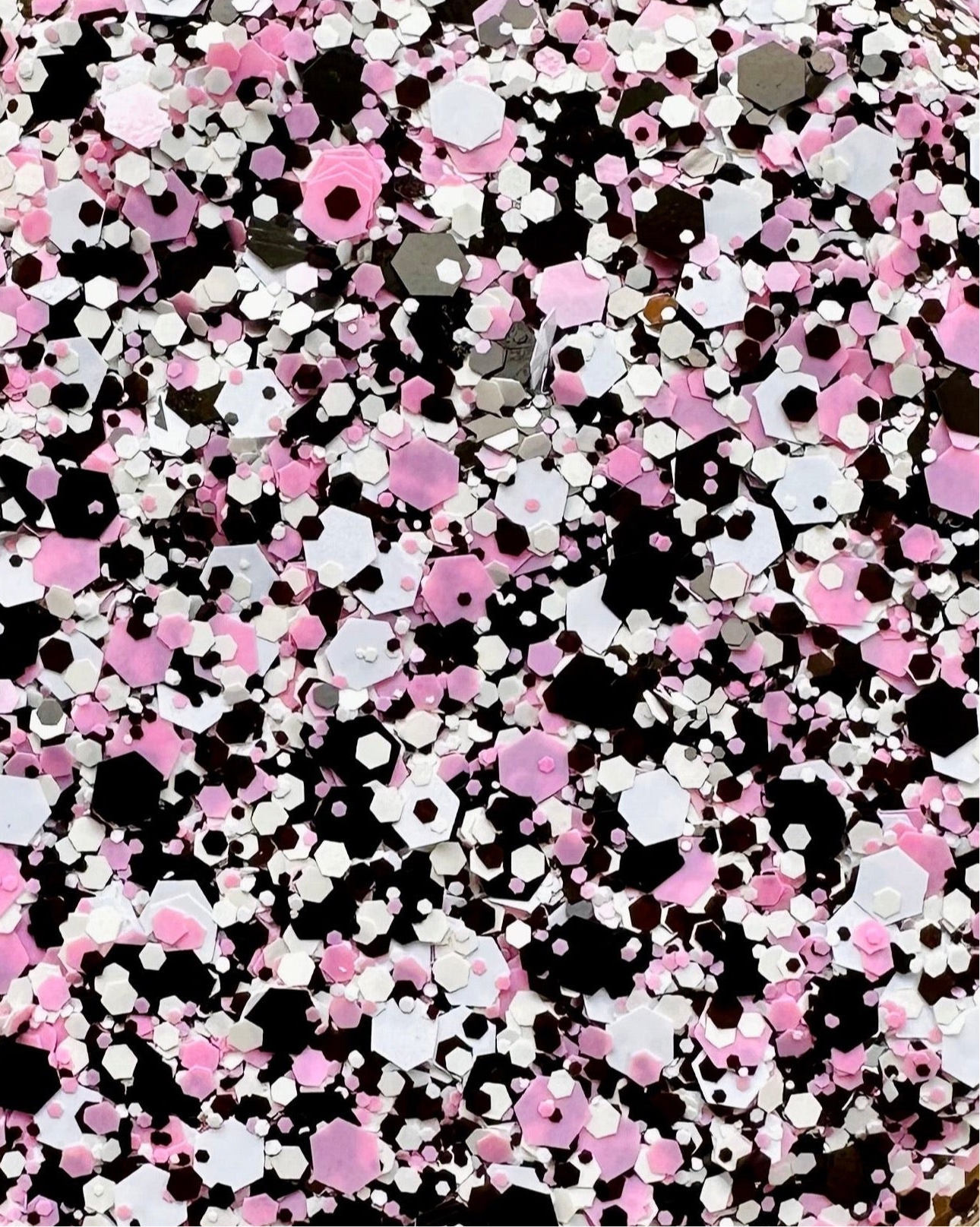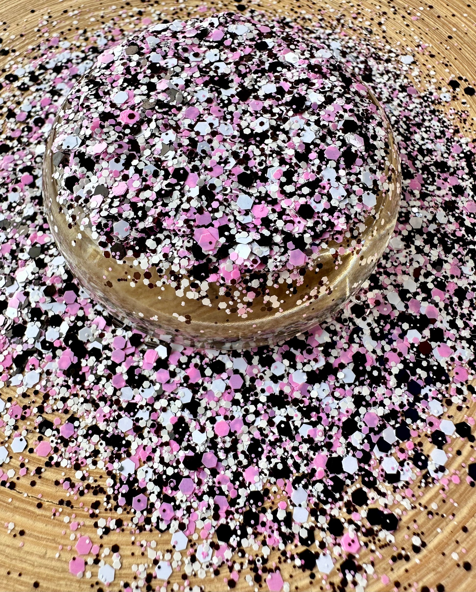 Clawdeen is a gorgeous chunky mix of black, white, and a baby pink. Solid color with a pearl sheen.