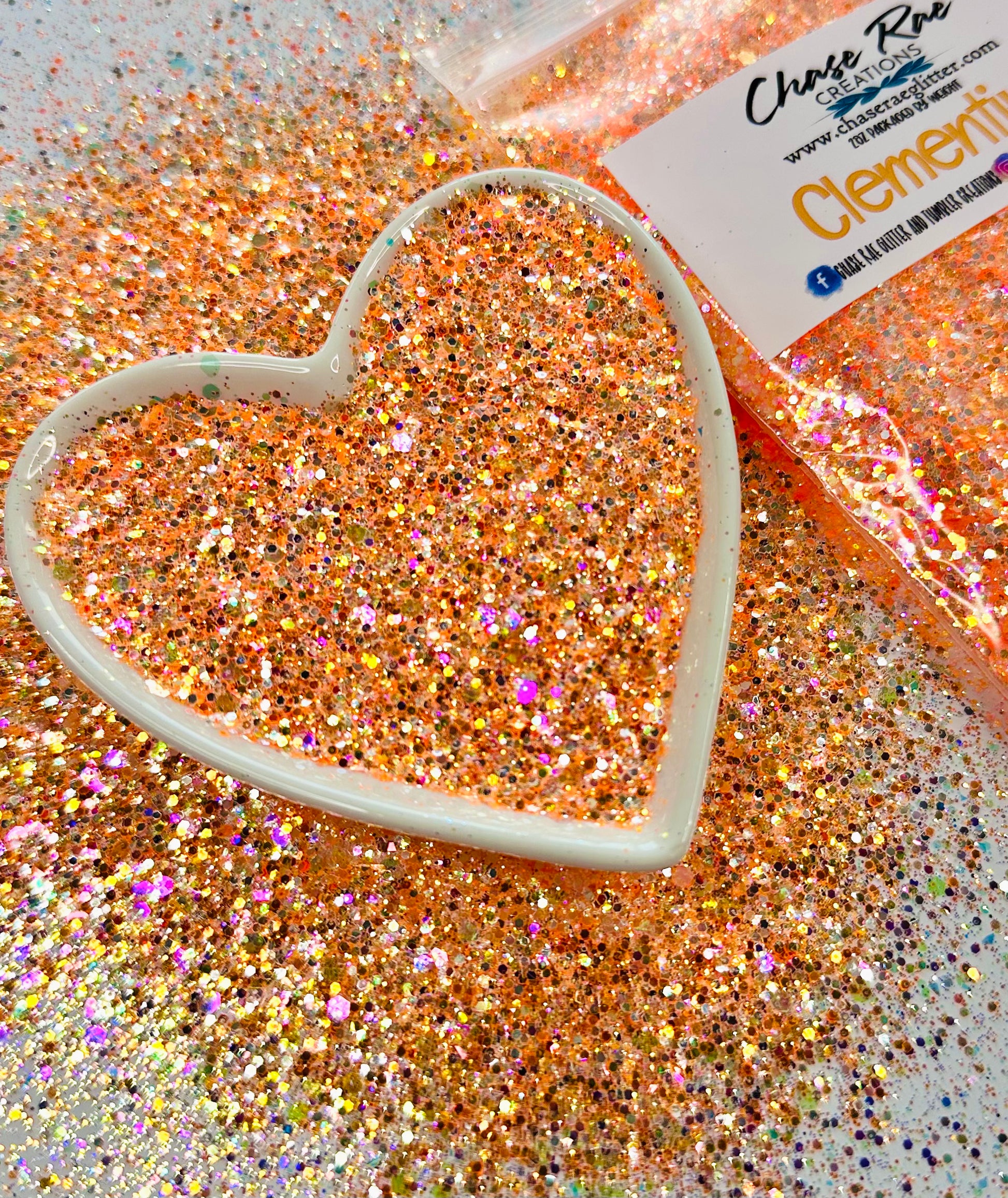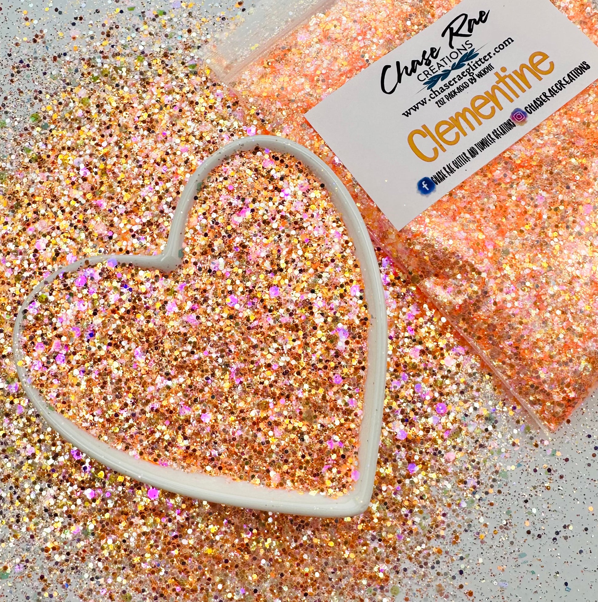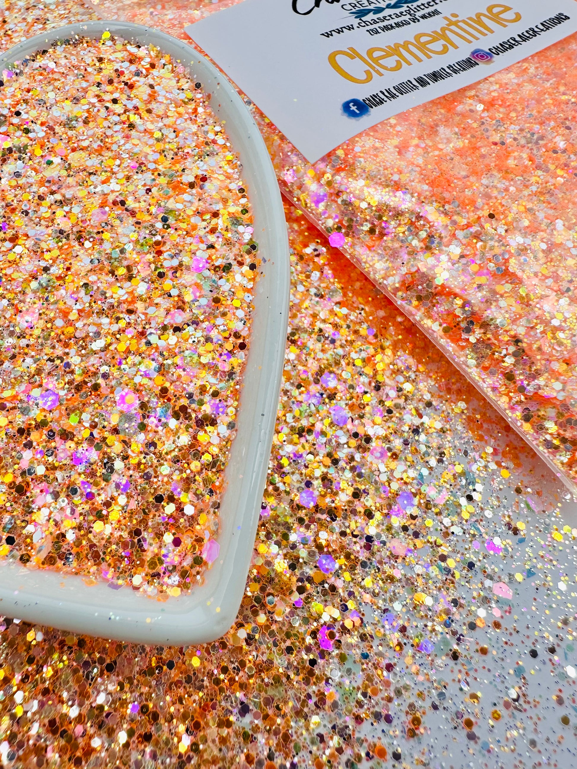 Clementine is a gorgeous, opal orange. It has some pink sparkle! A Bright and fun glitter mix