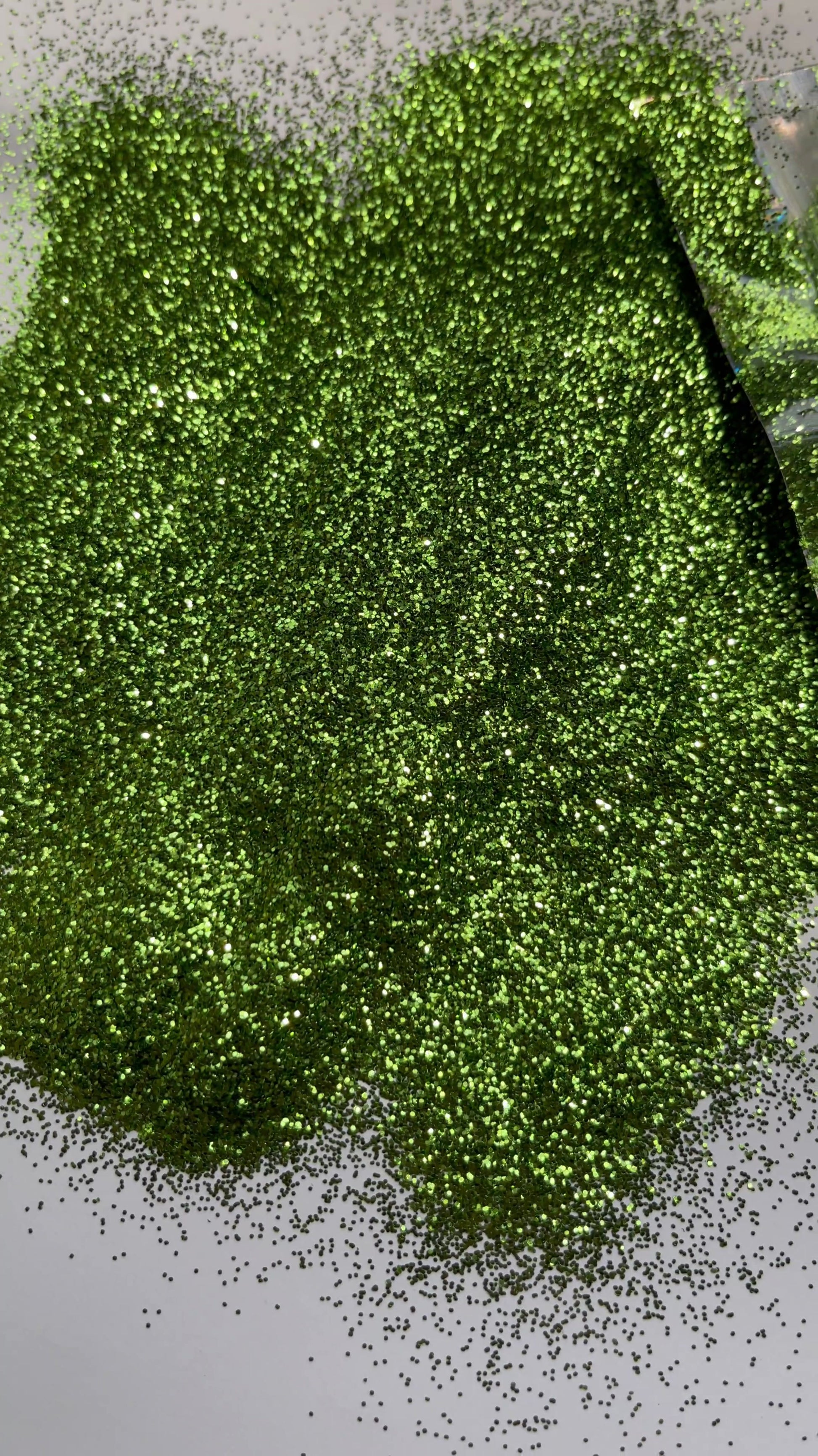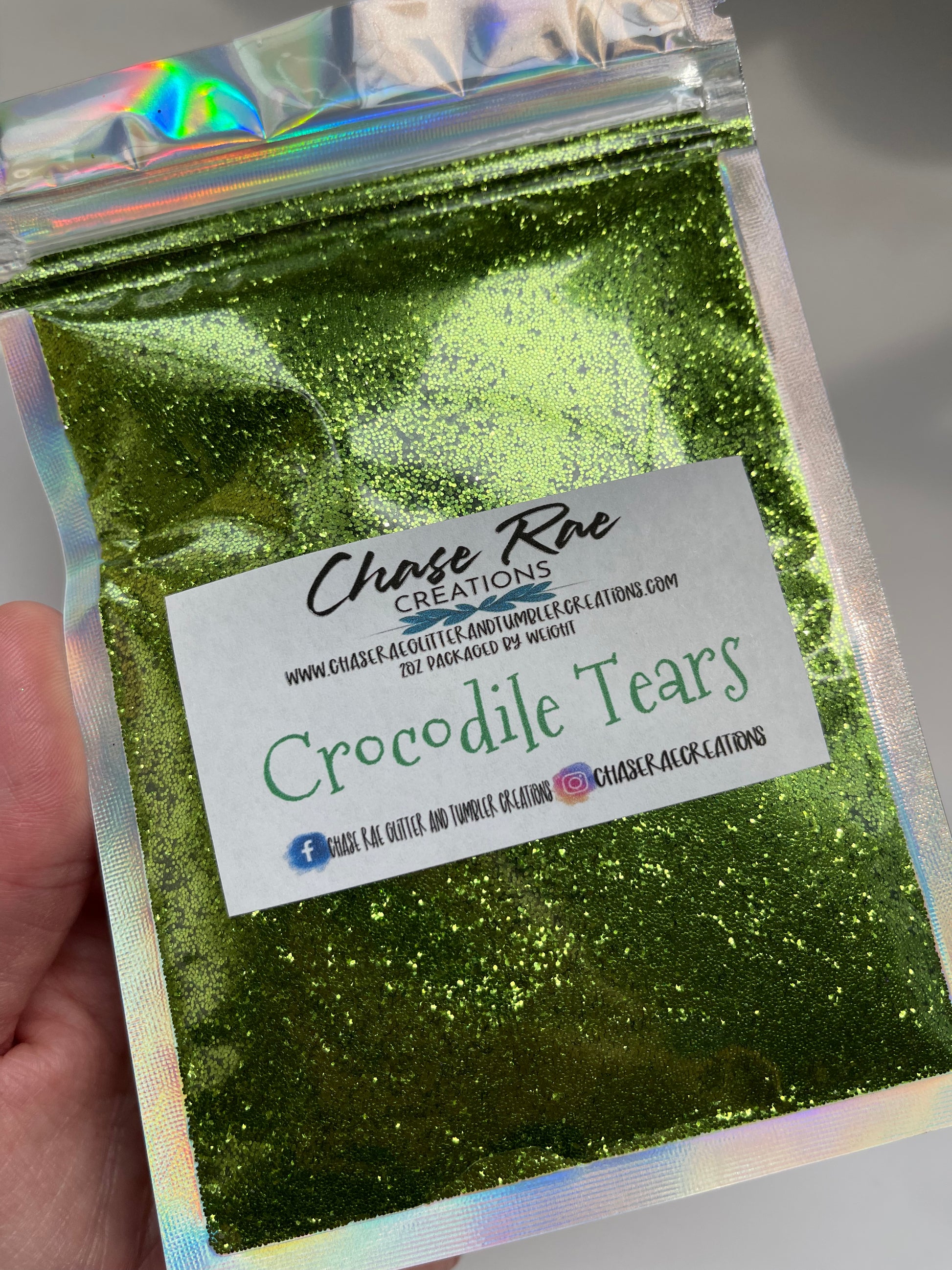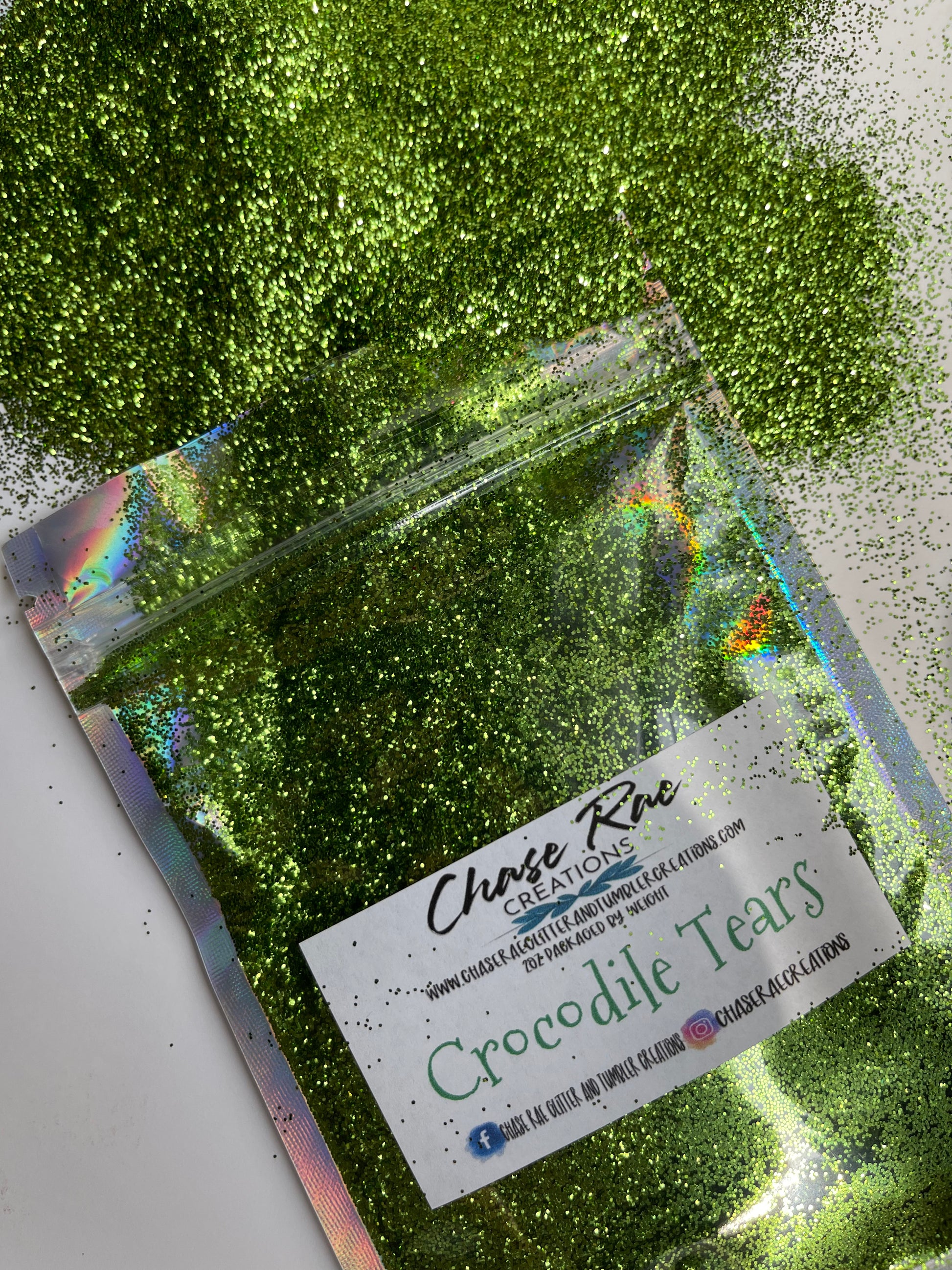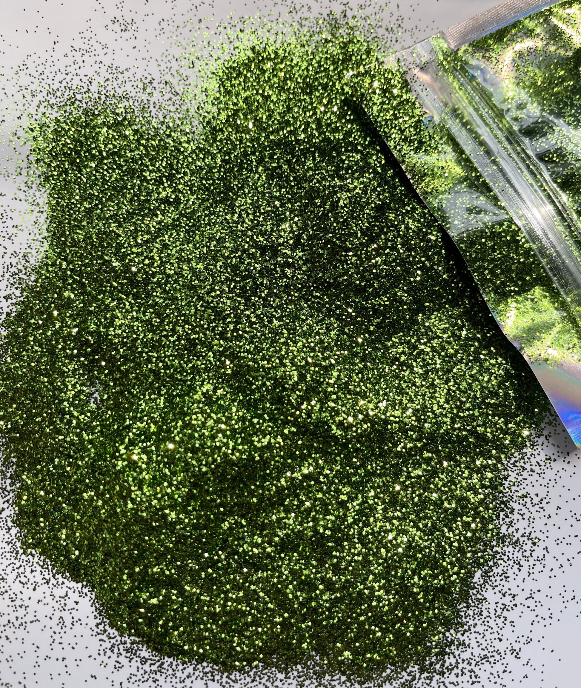 Crocodile Tears is a solid color metallic glitter. Rich, warm, mossy green in color.