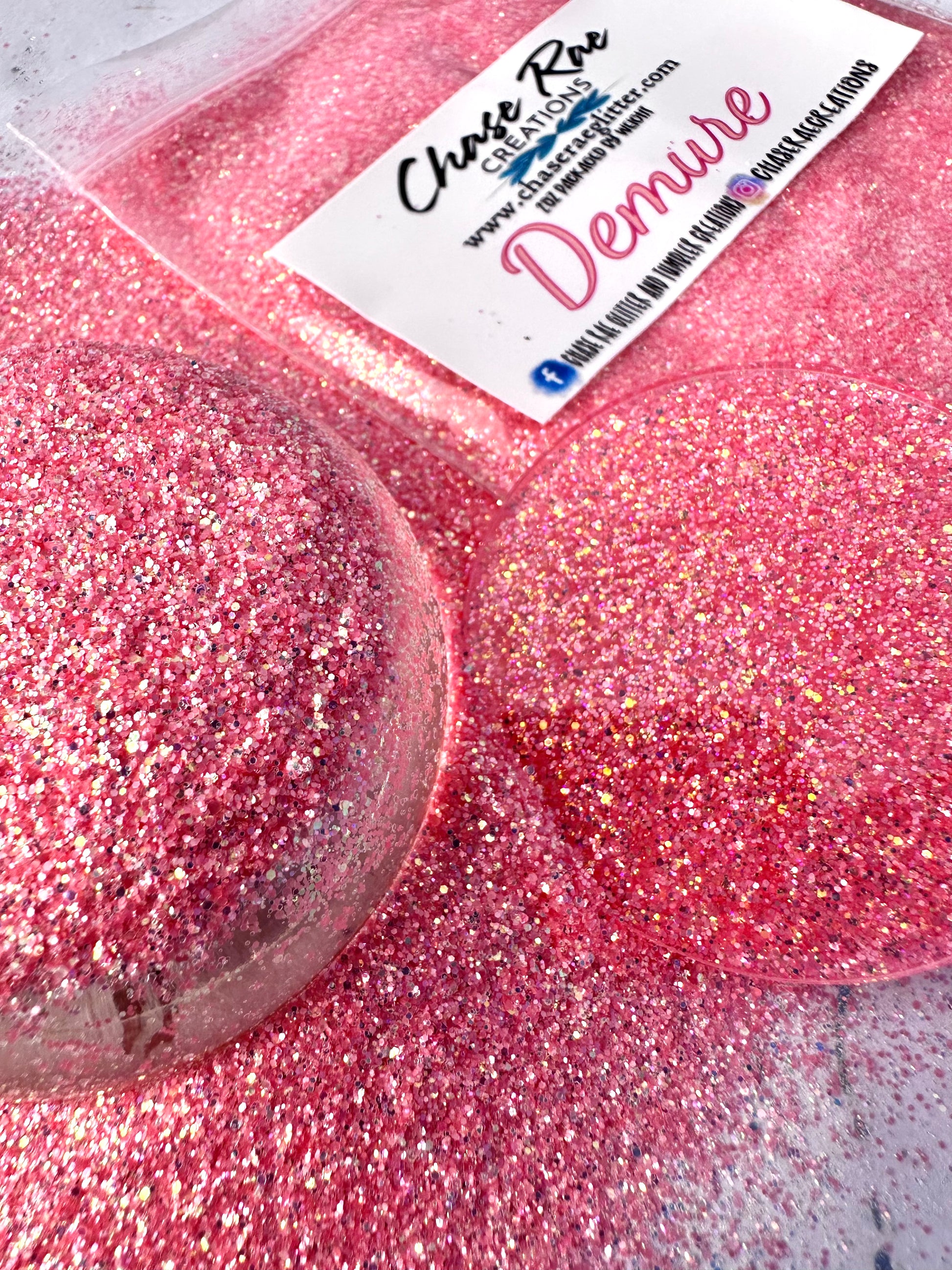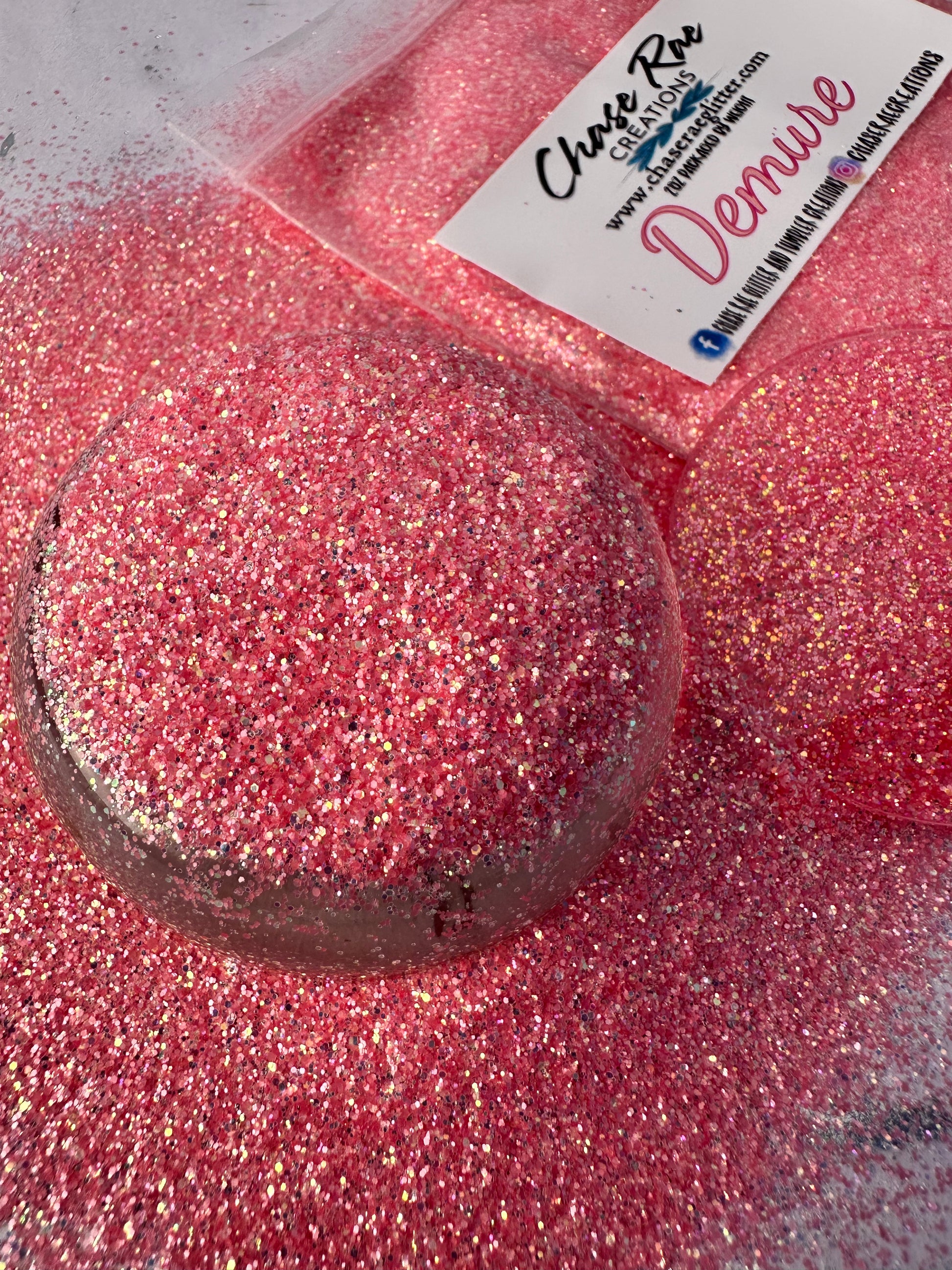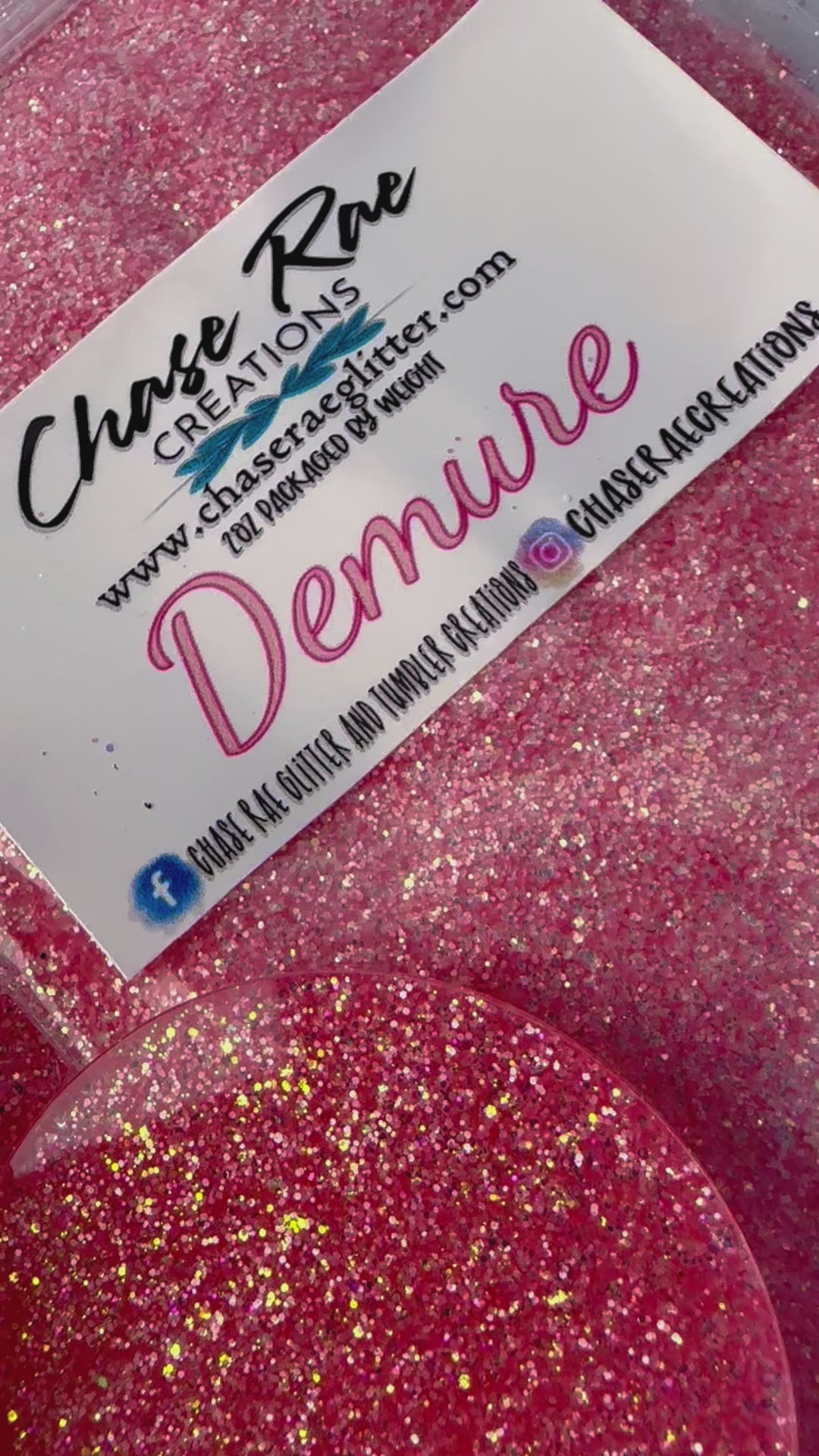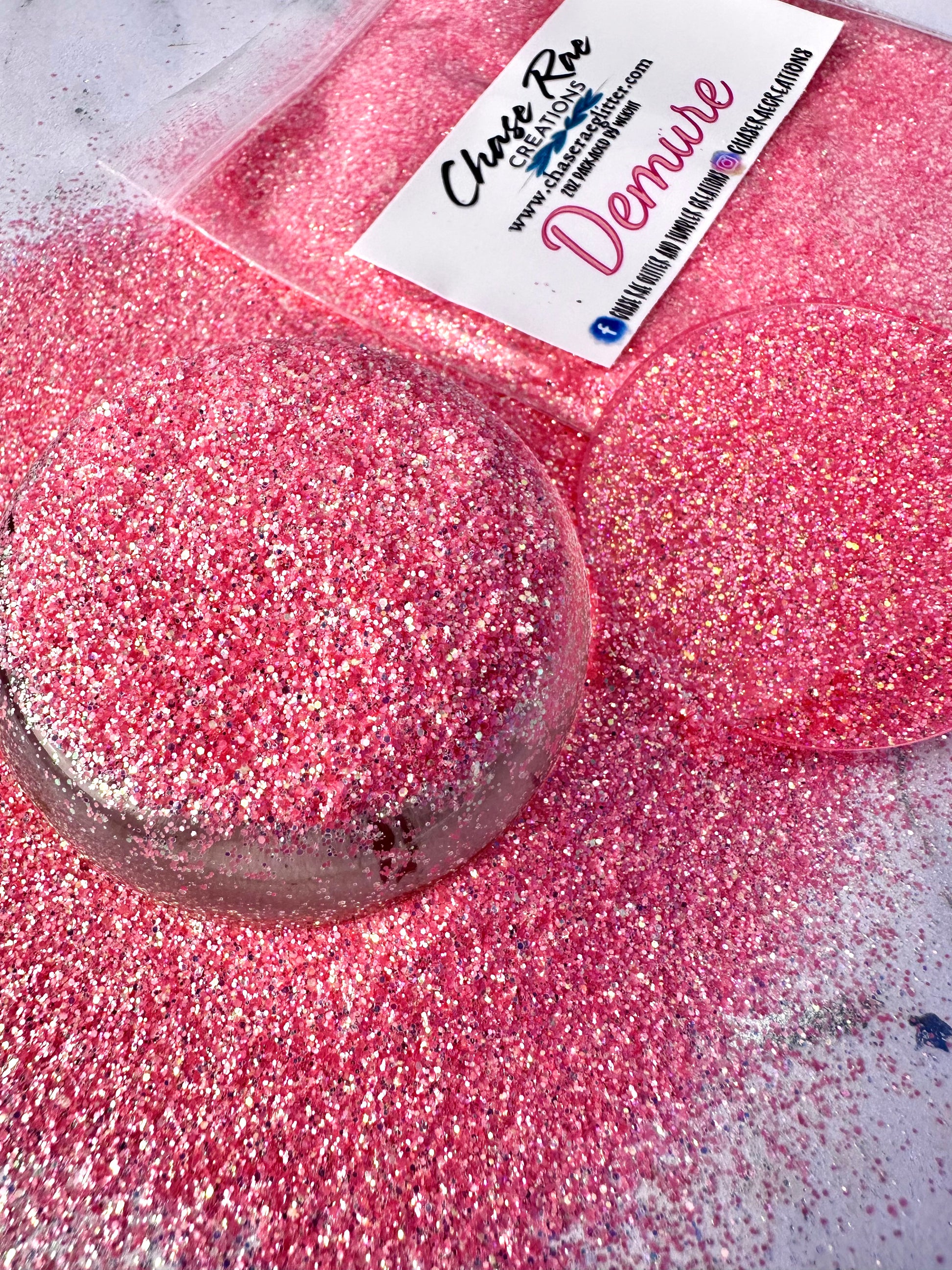 Demure is a semi transparent soft pink glitter. This one has some solid pearl pieces and a beautiful rainbow iridescence with opals.