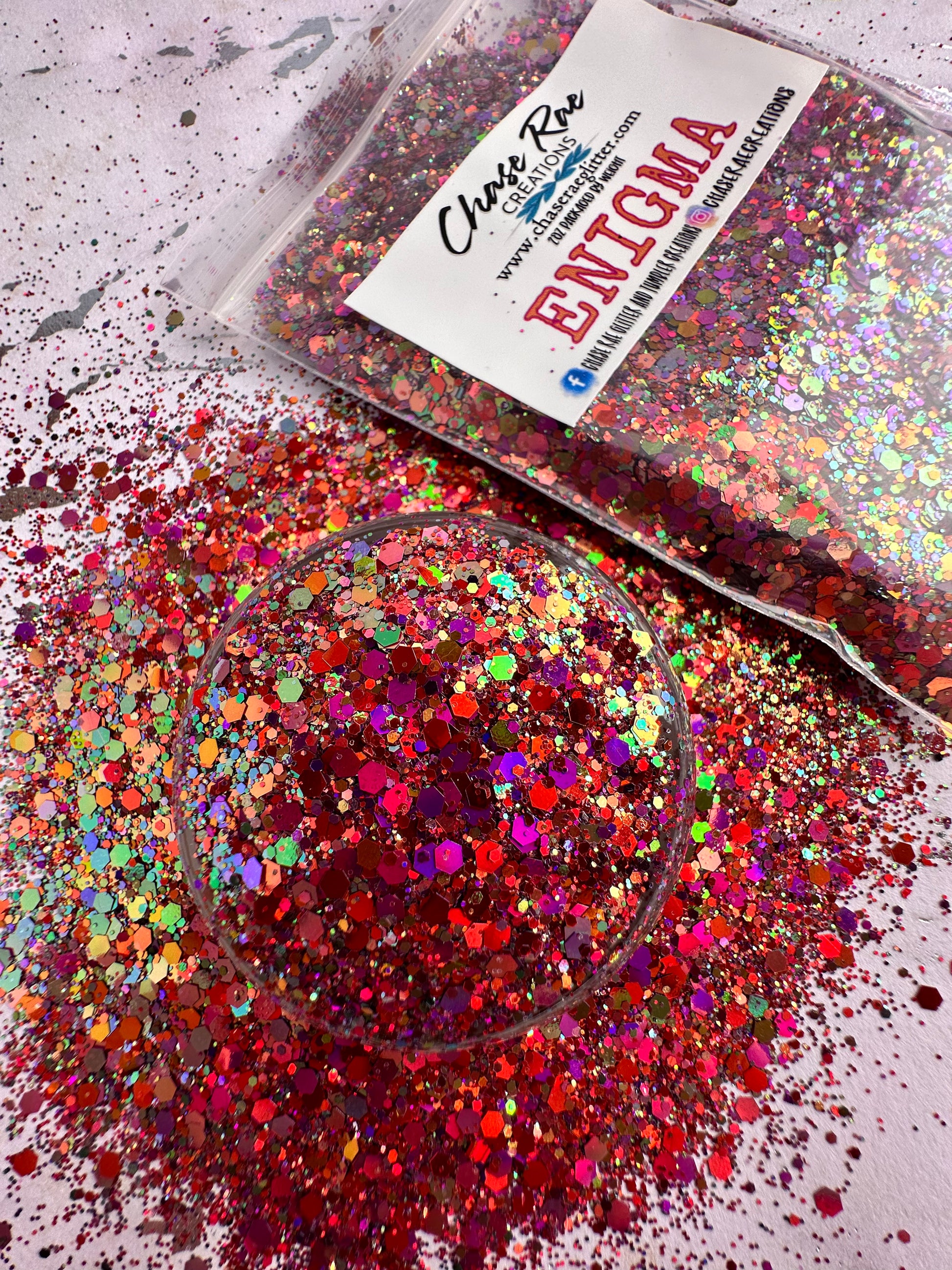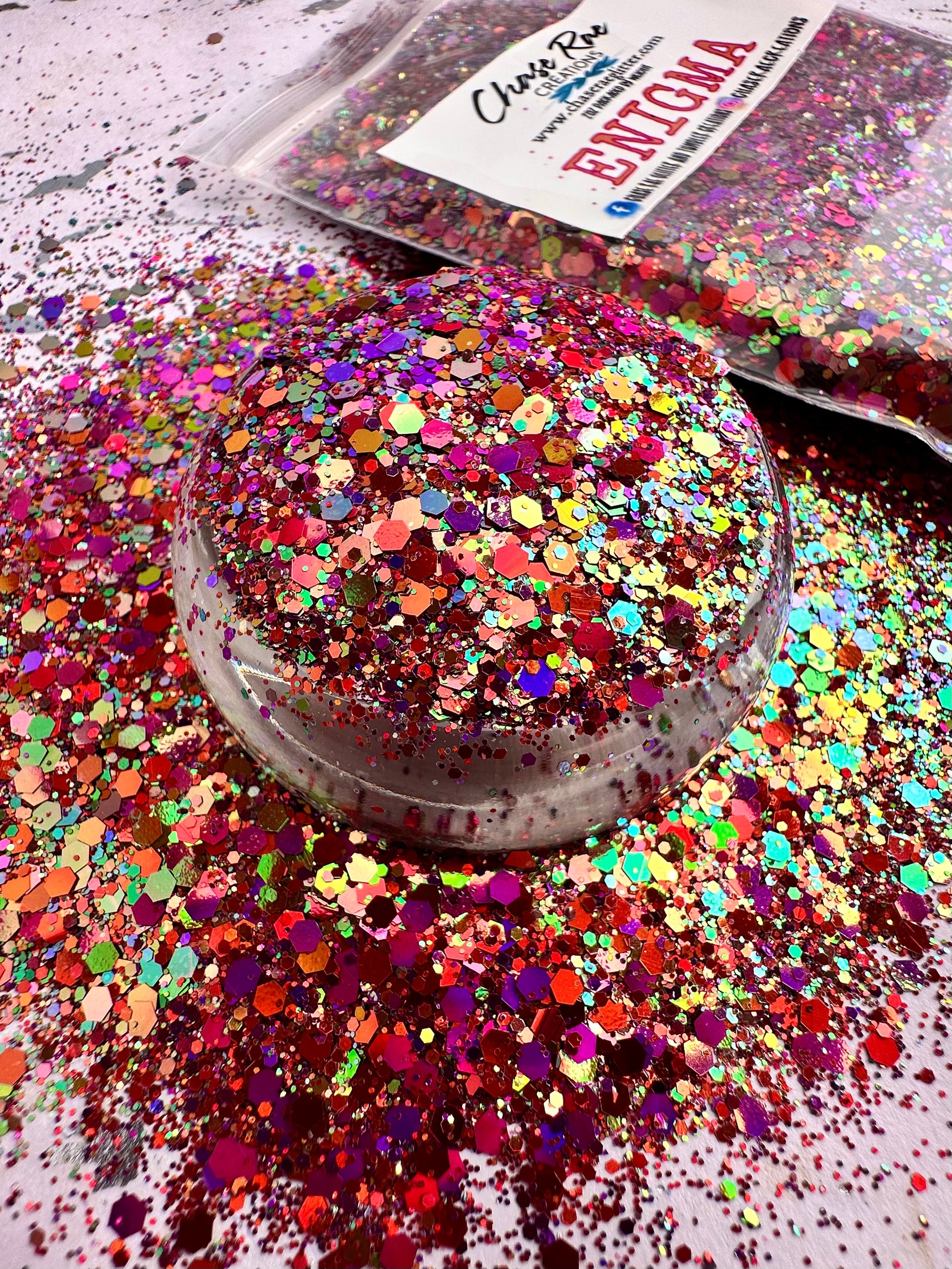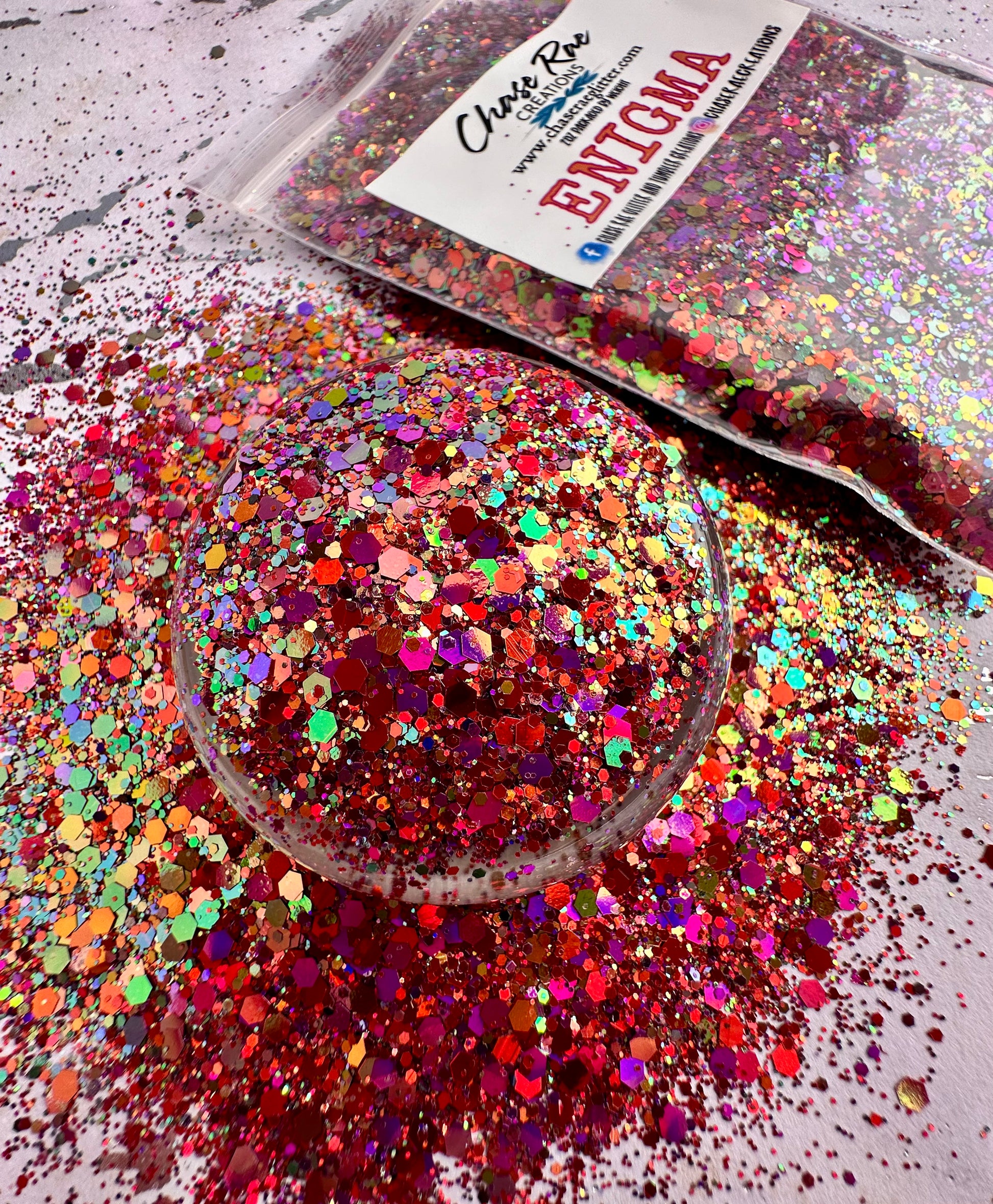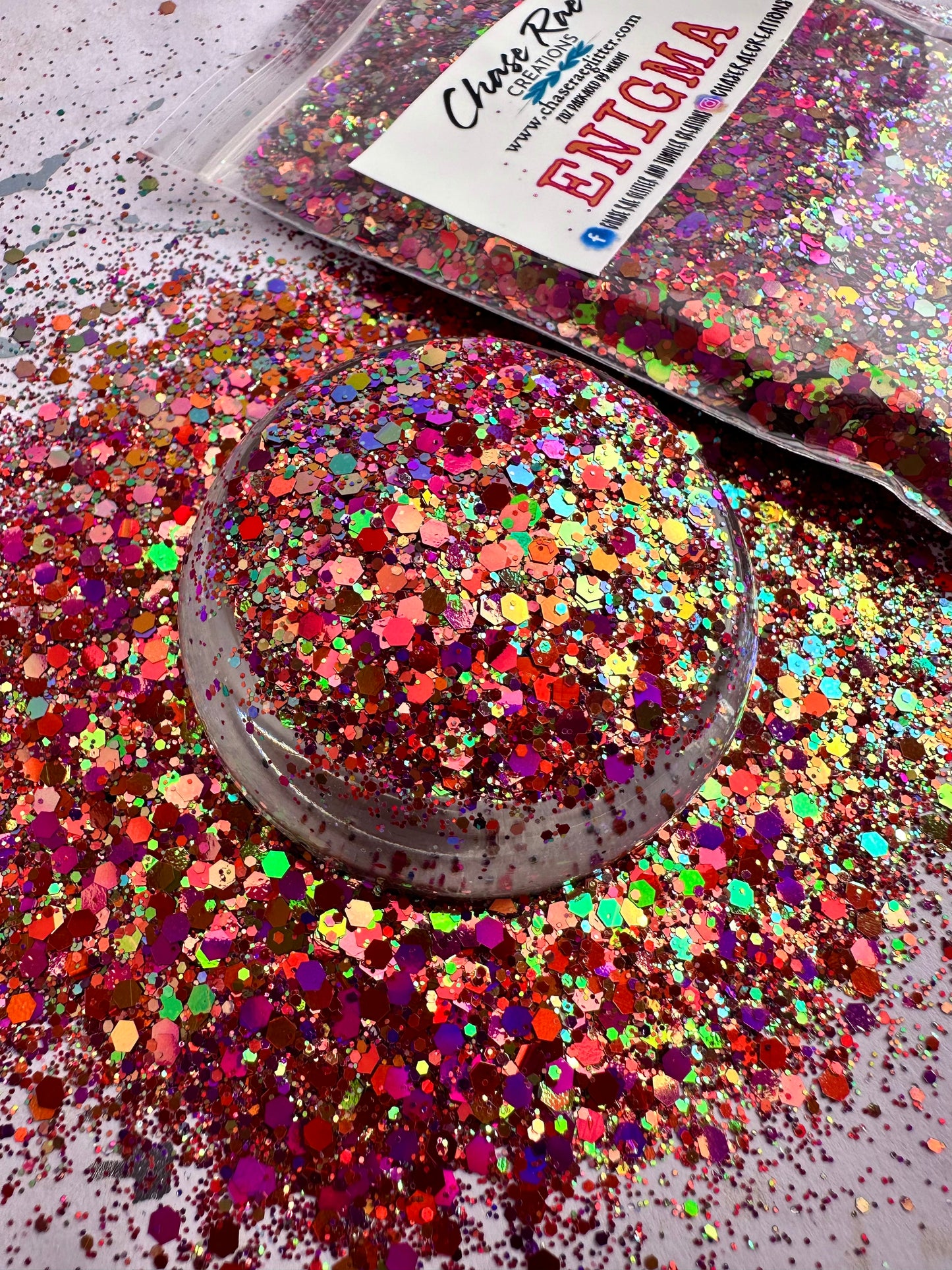 Enigma is an interesting, chunky mix glitter. Orange, green and pink in high sparkle, make this one perfect for Halloween!