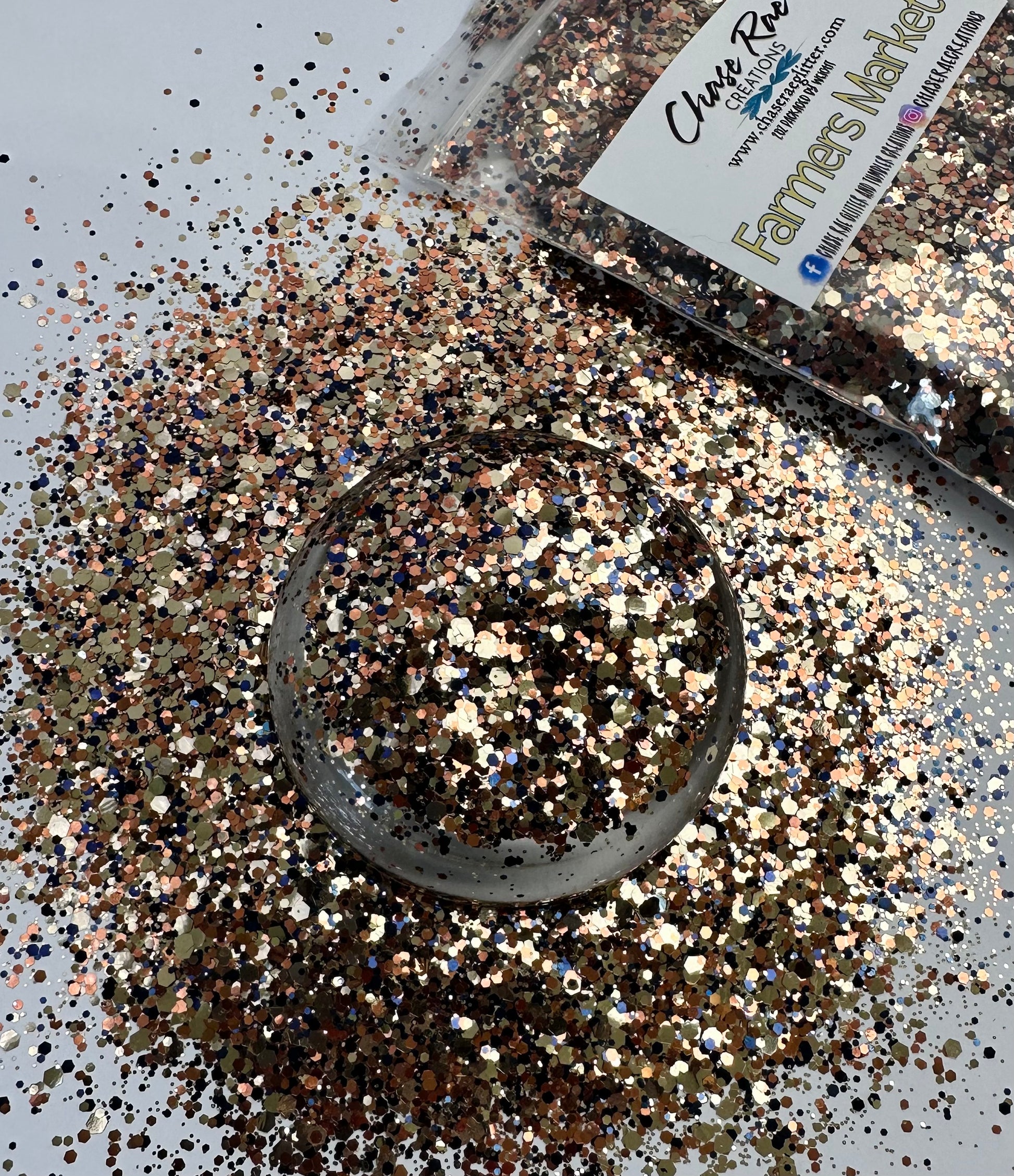 Farmers Market is a mini chunky mix. Gold, copper, and a navy blue make up this beautiful mix! Perfect for Fall!