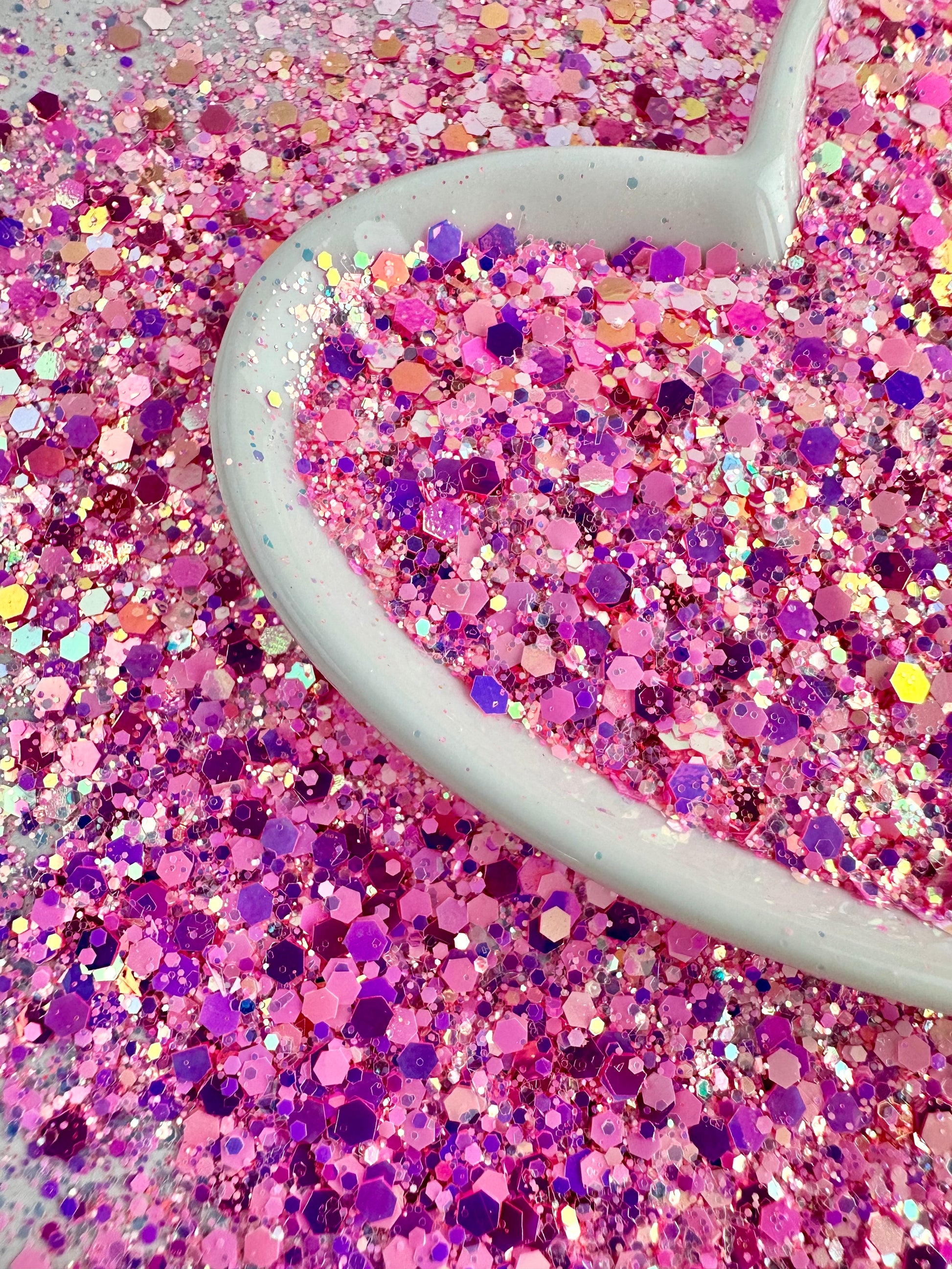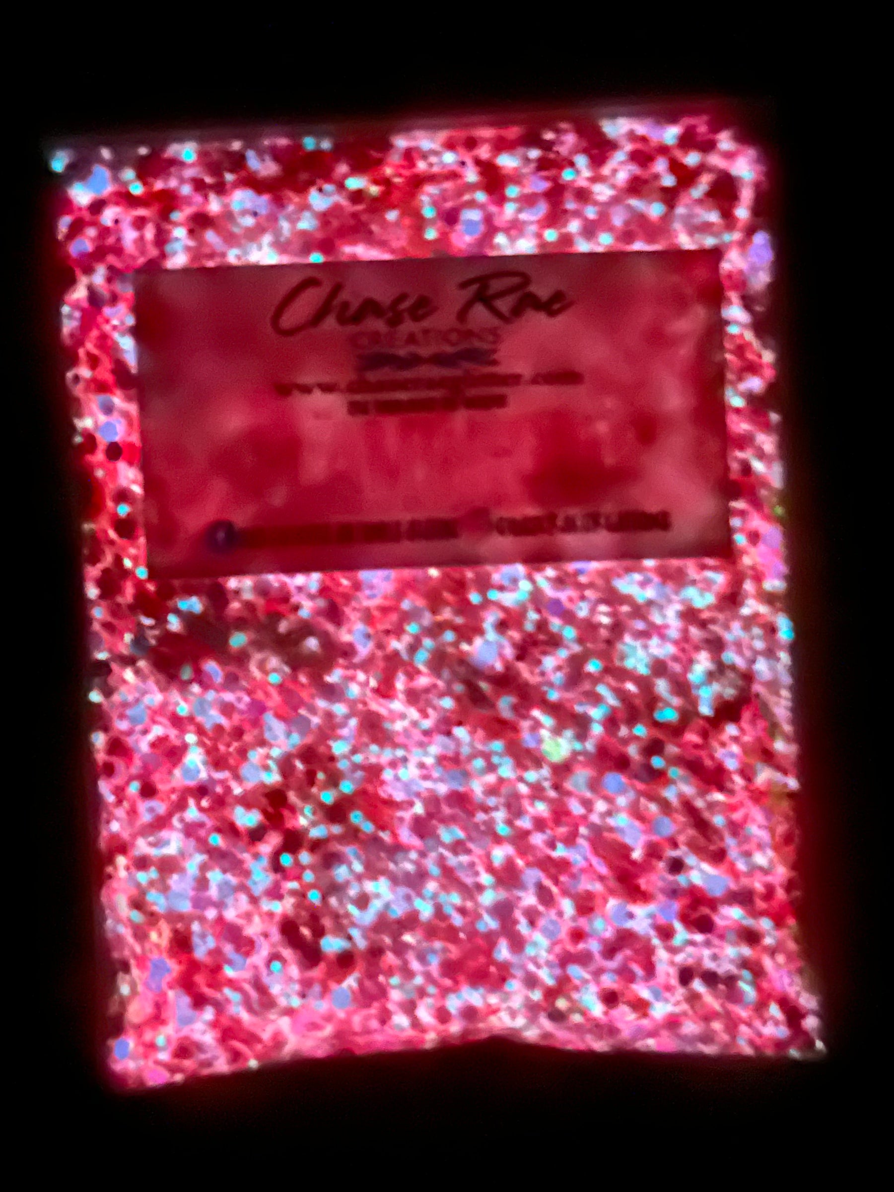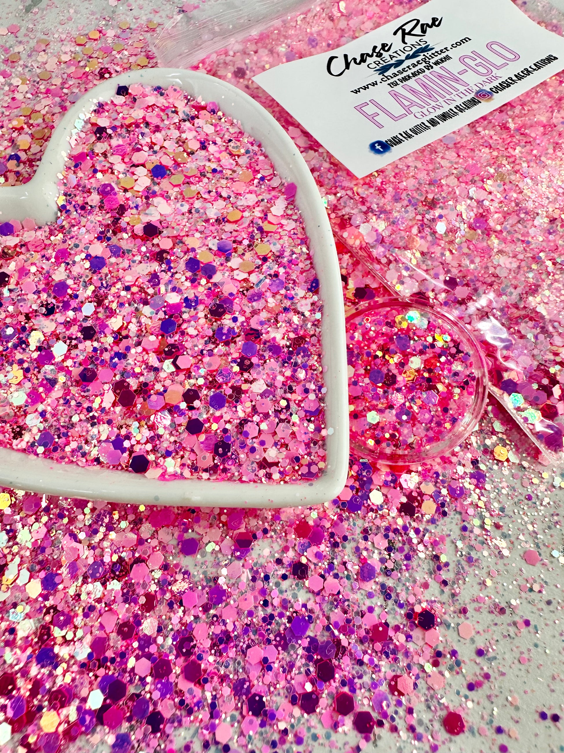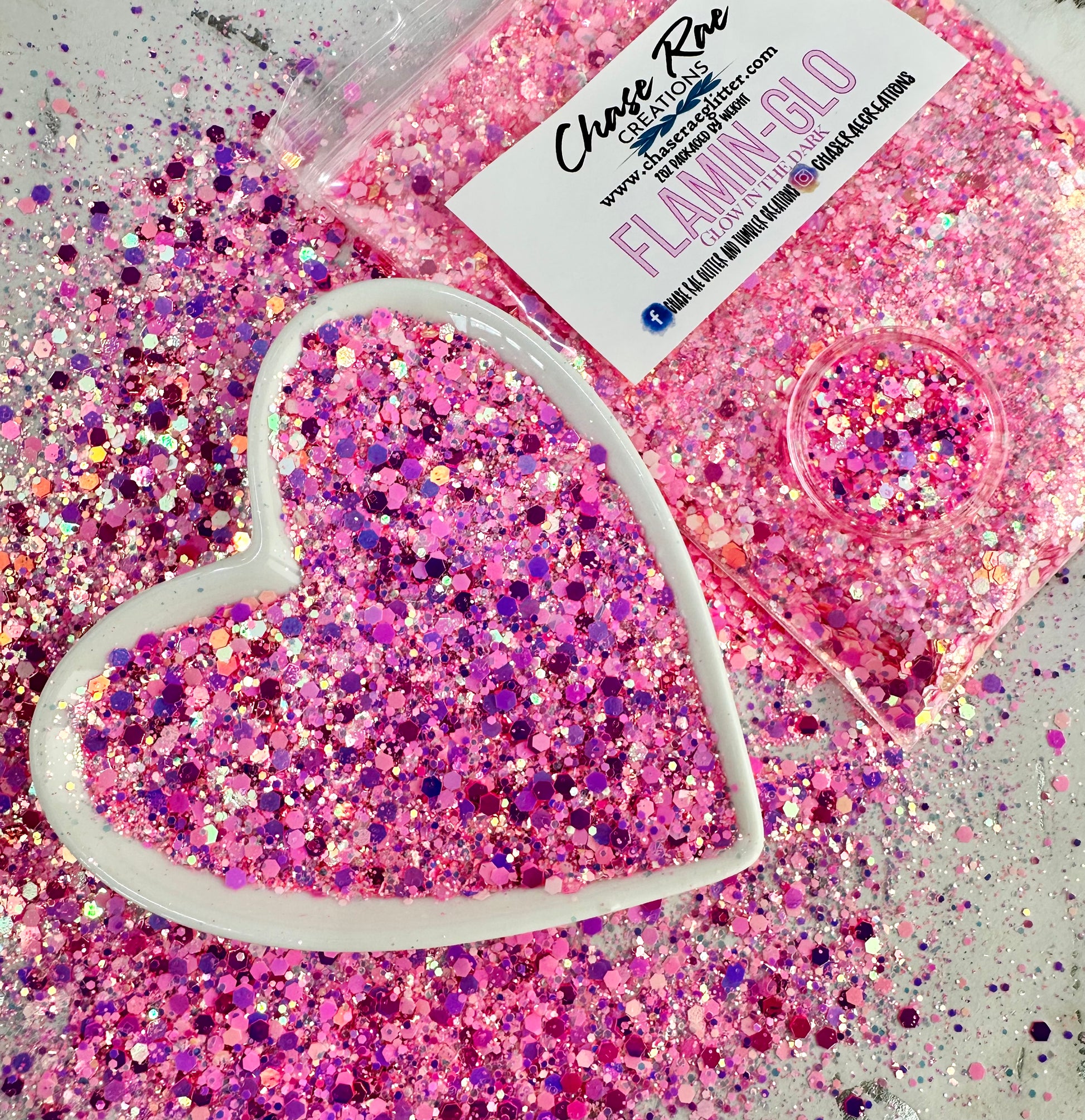 Flamin-glo is a gorgeous, pink, glow in the dark Chunky mix. High sparkle!