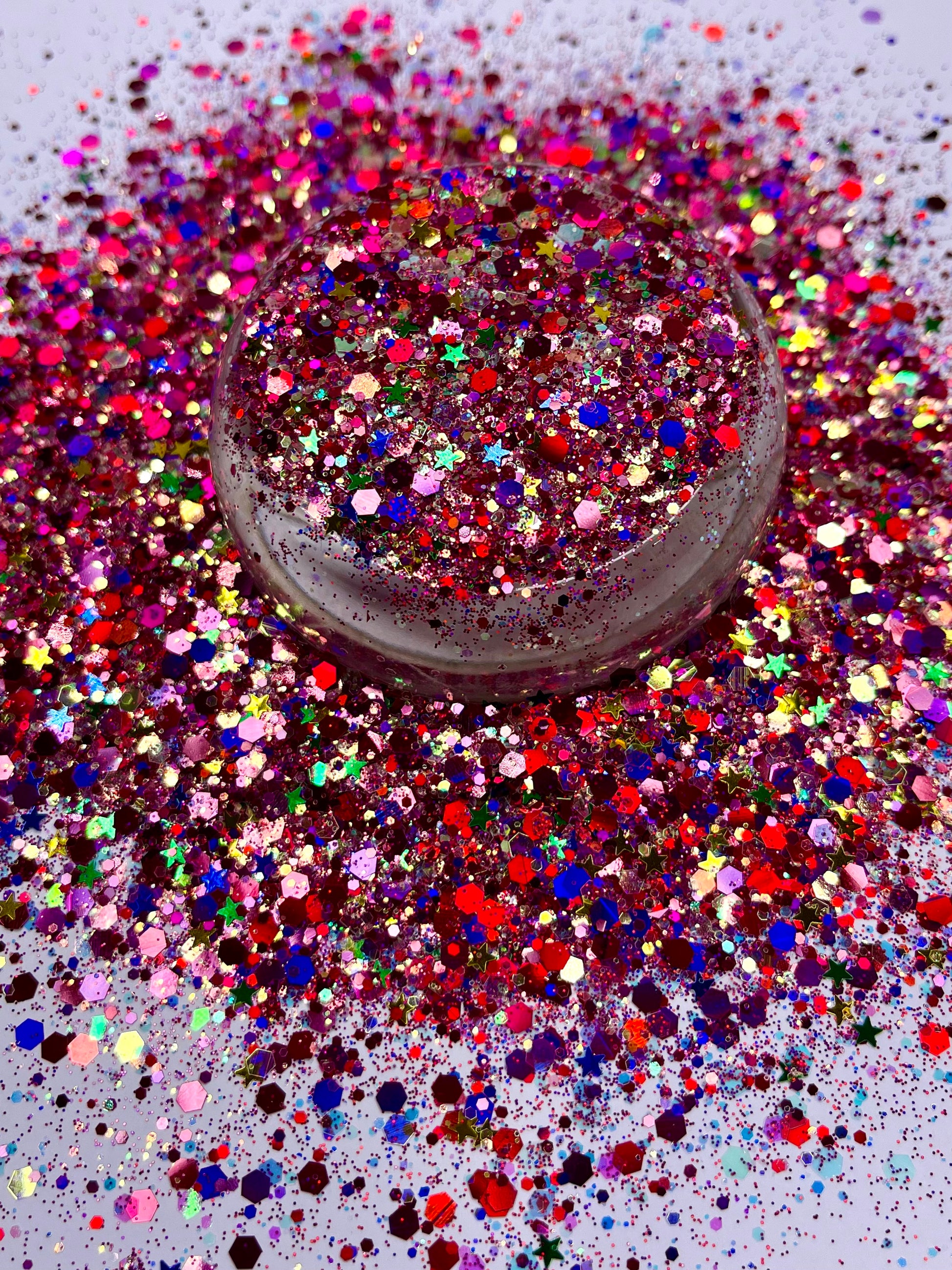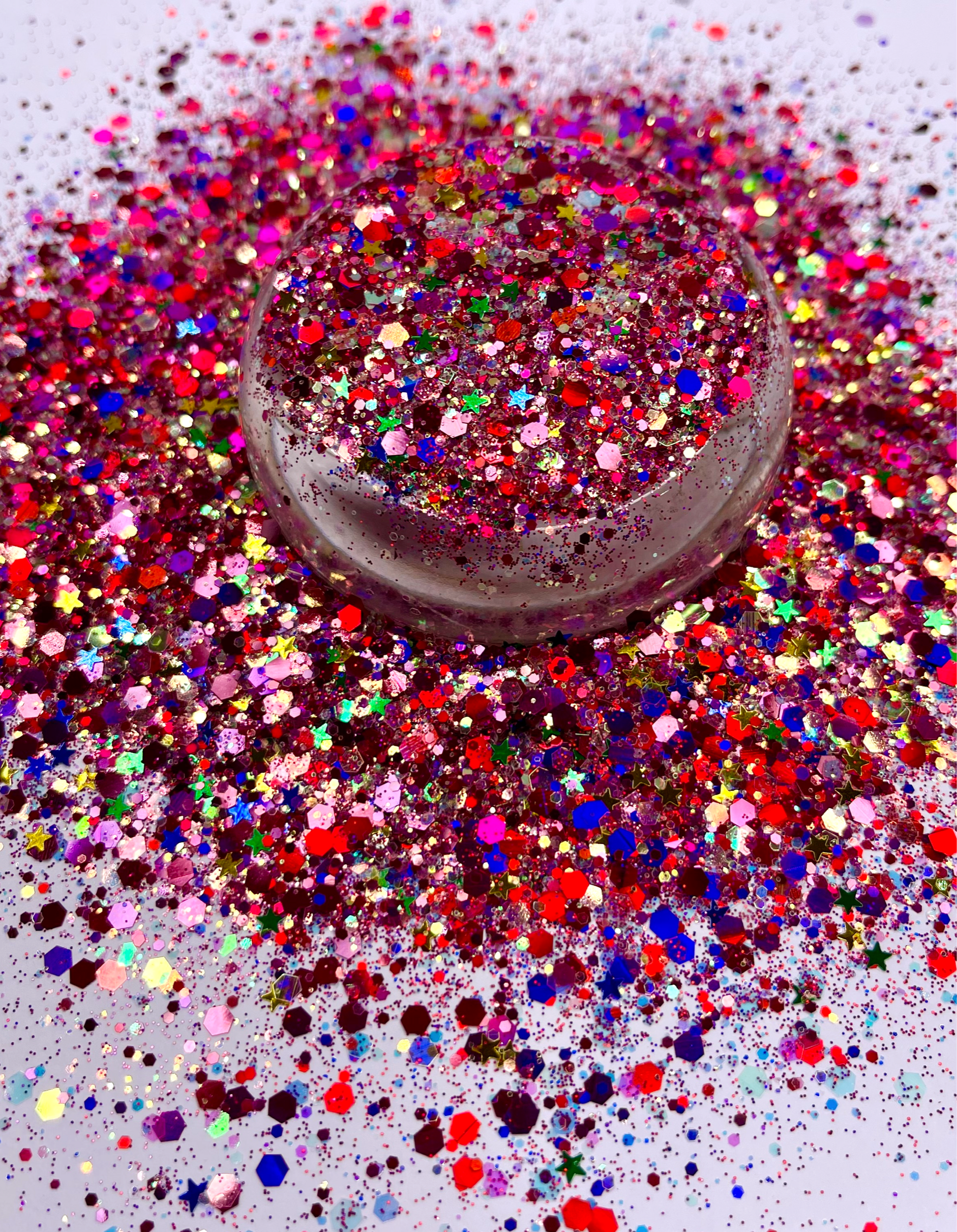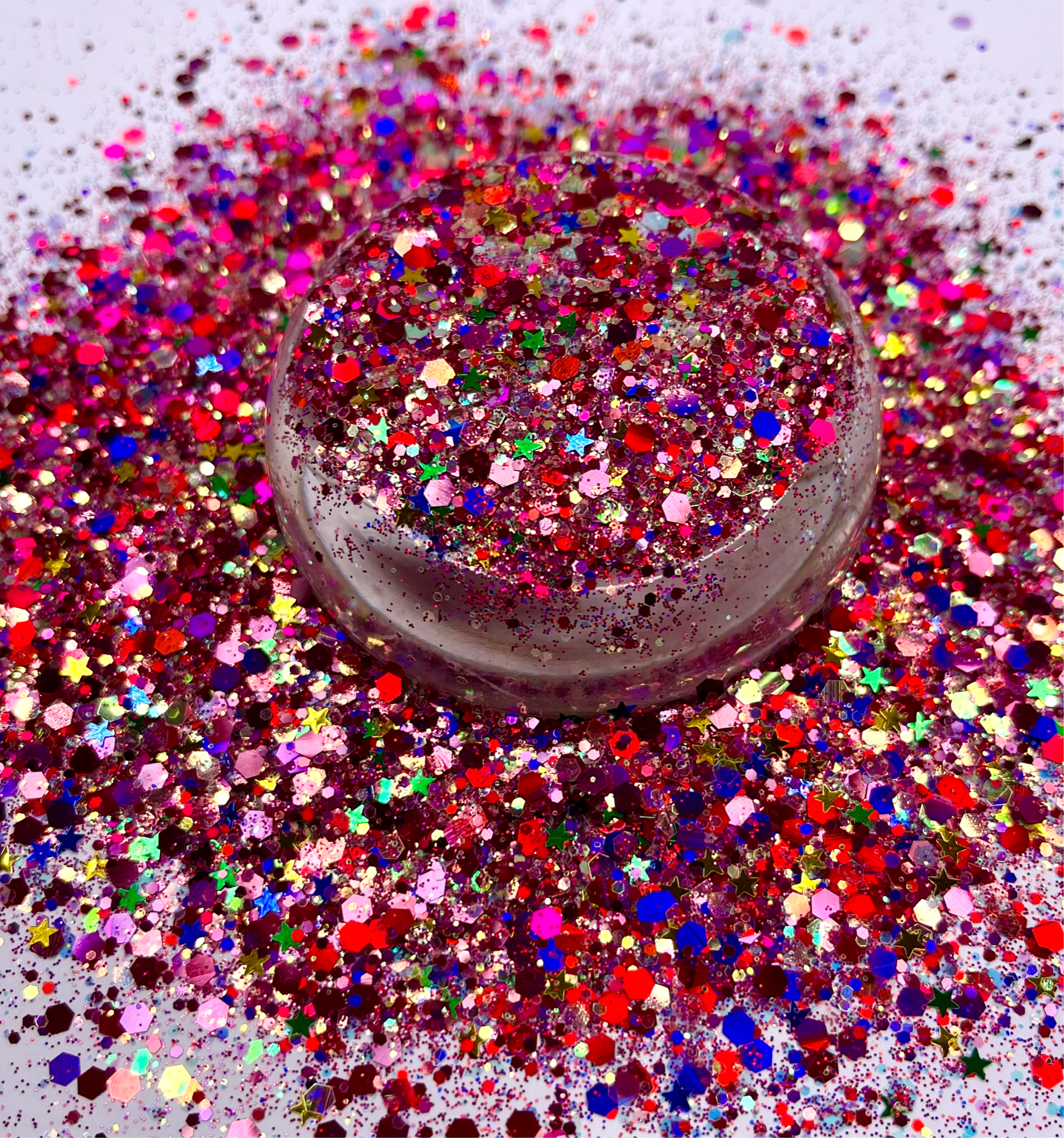 Fruitcake is a gorgeous chunky mix. Hot fuchsia, gold, green, pink and stars.