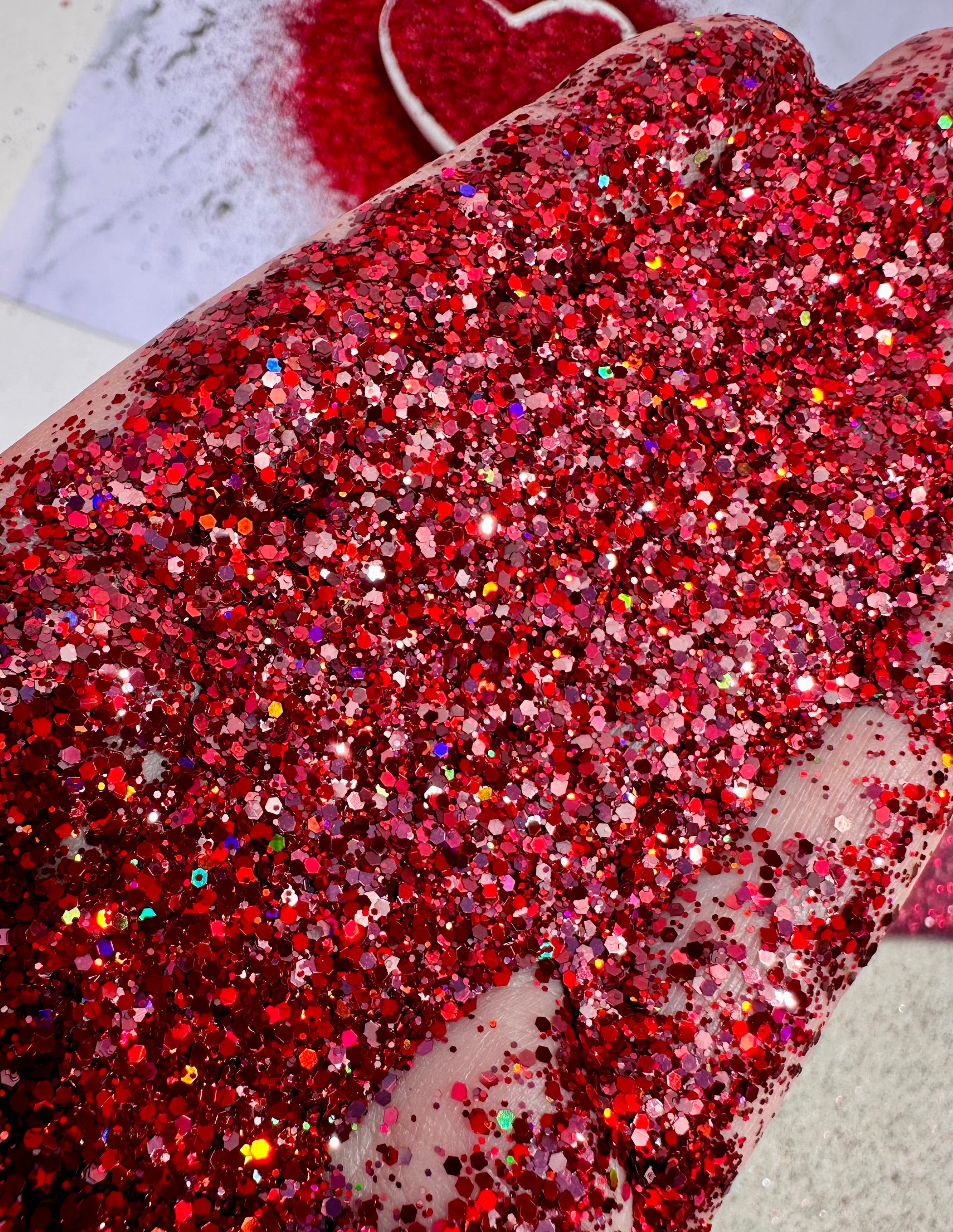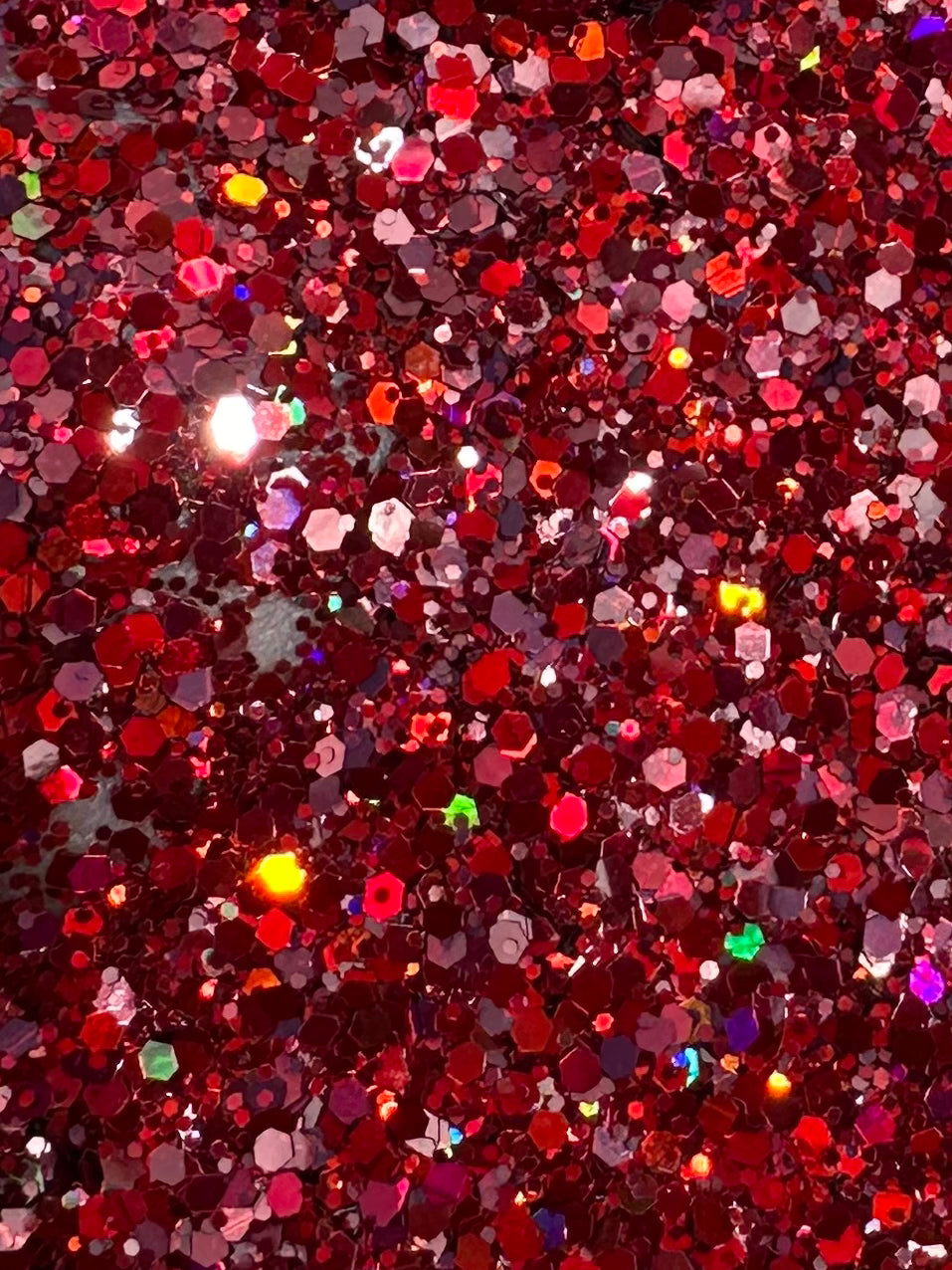 Gash is a holographic, deep red glitter. All metallic and high sparkle.