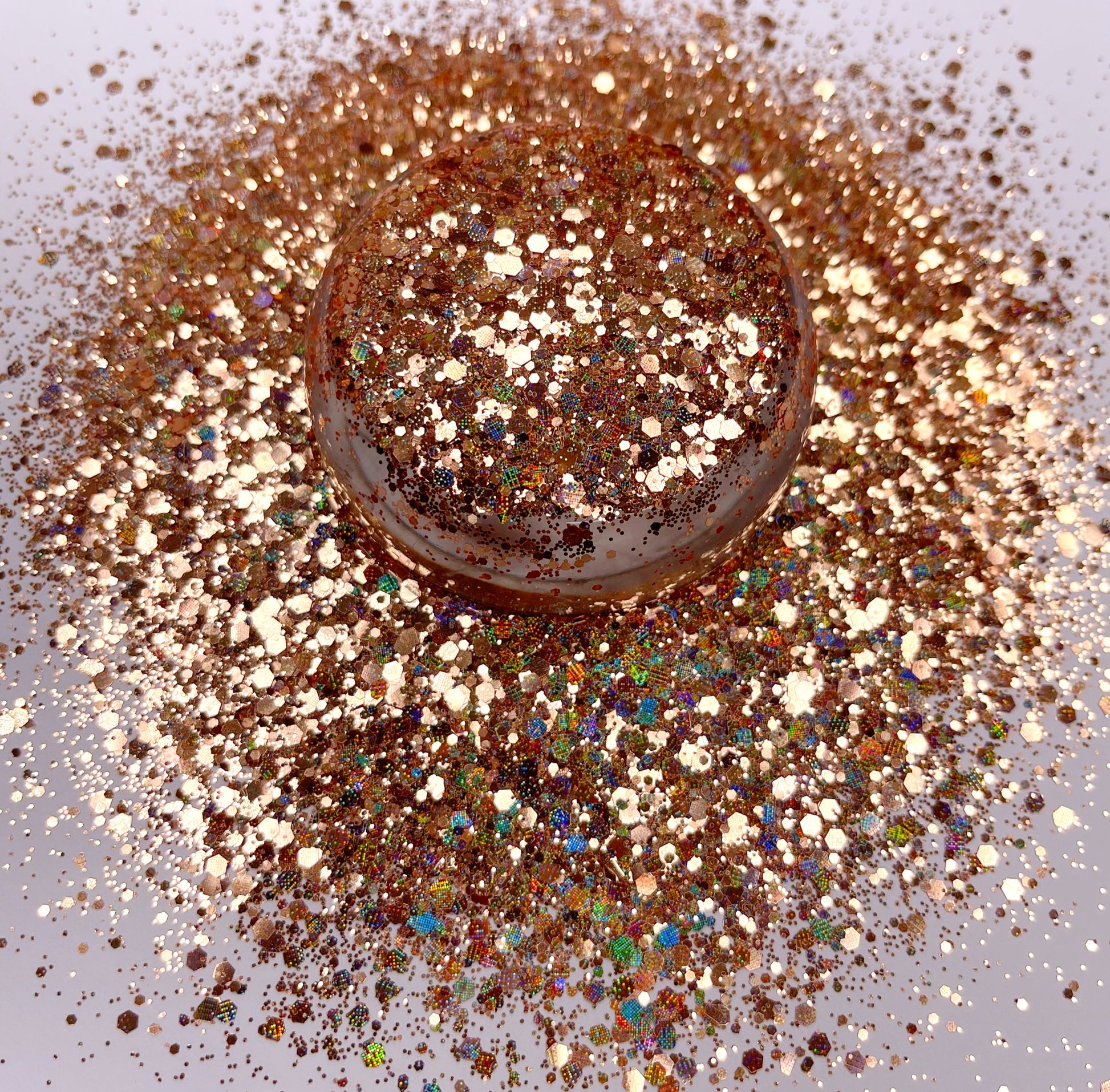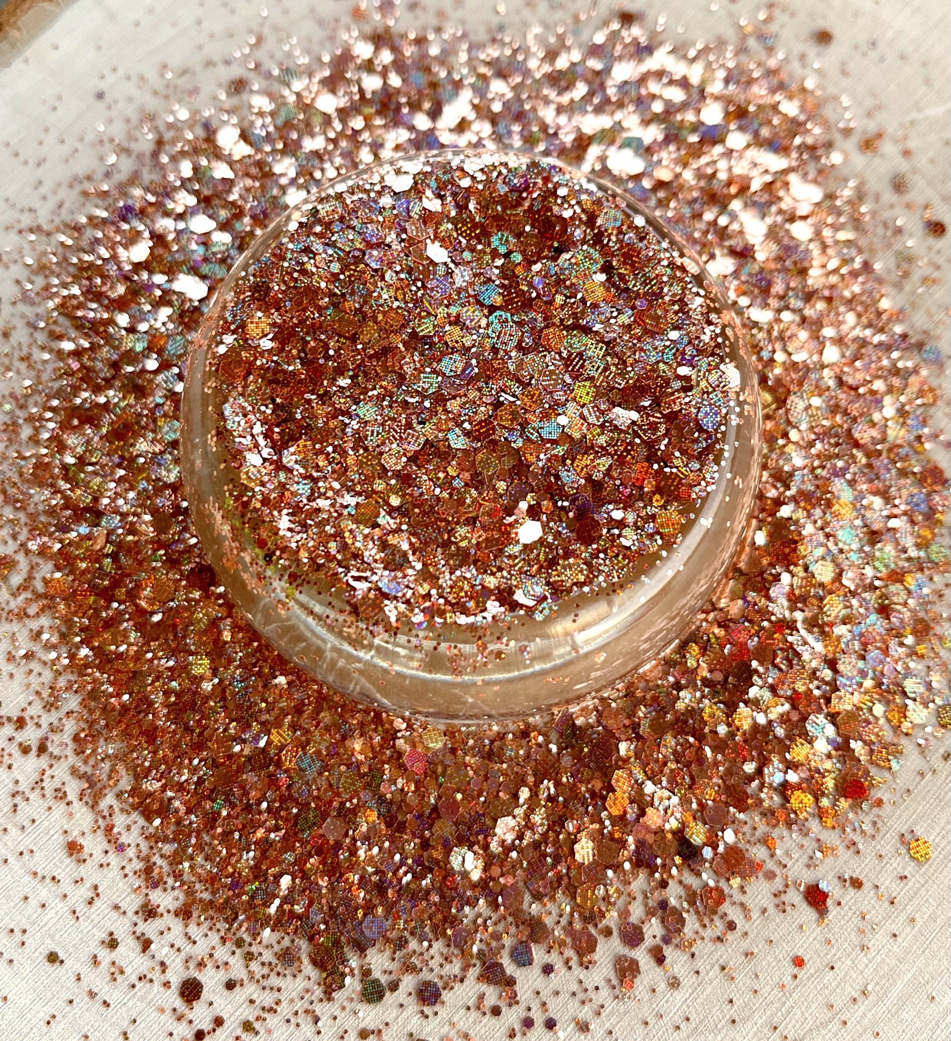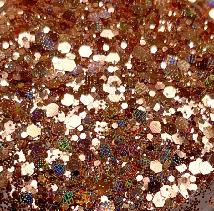 Gingerbread is a holographic chunky mix. Warm copper in color. Notice how each piece looks to be texturized! Yet extremely soft and lightweight.