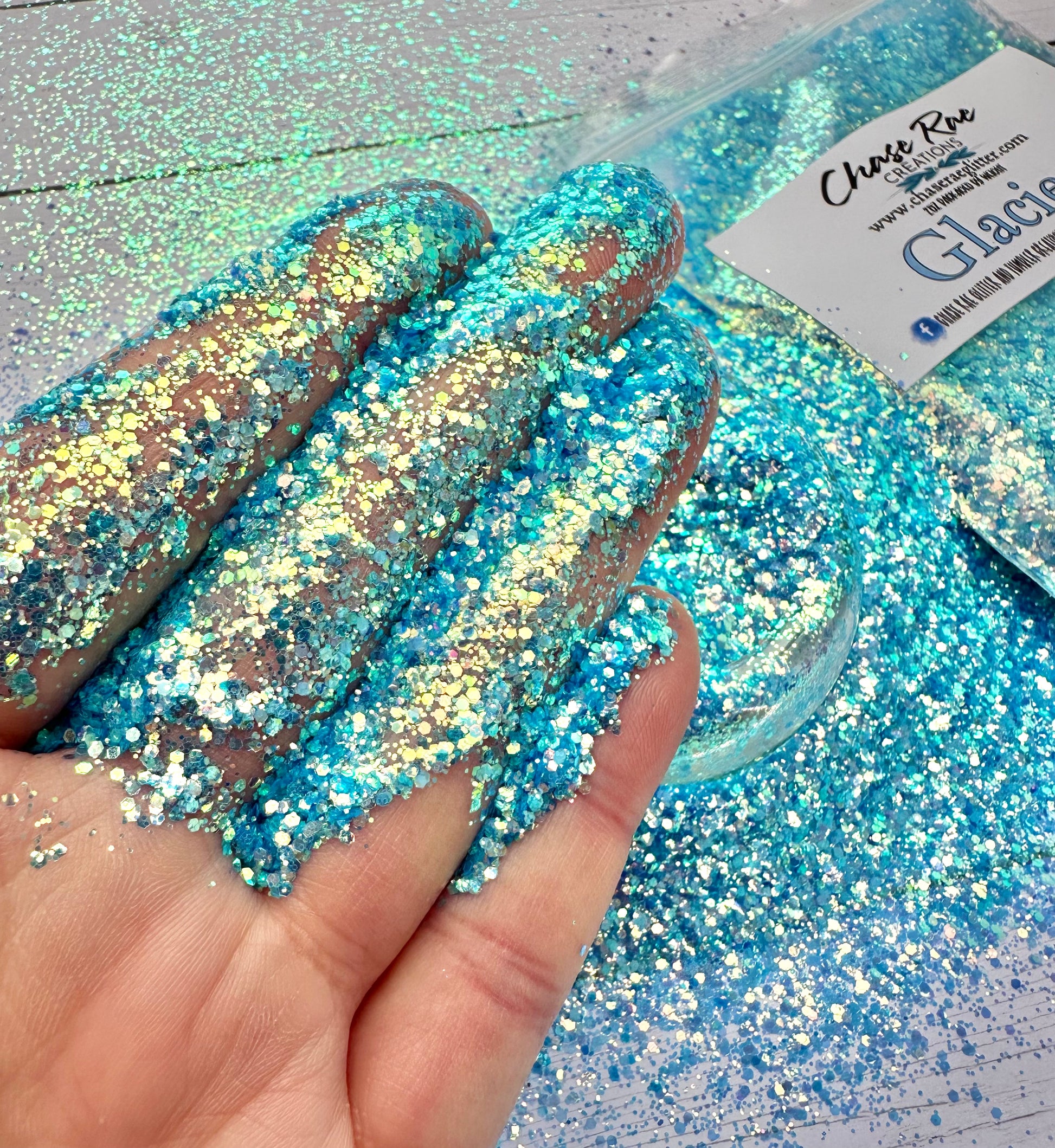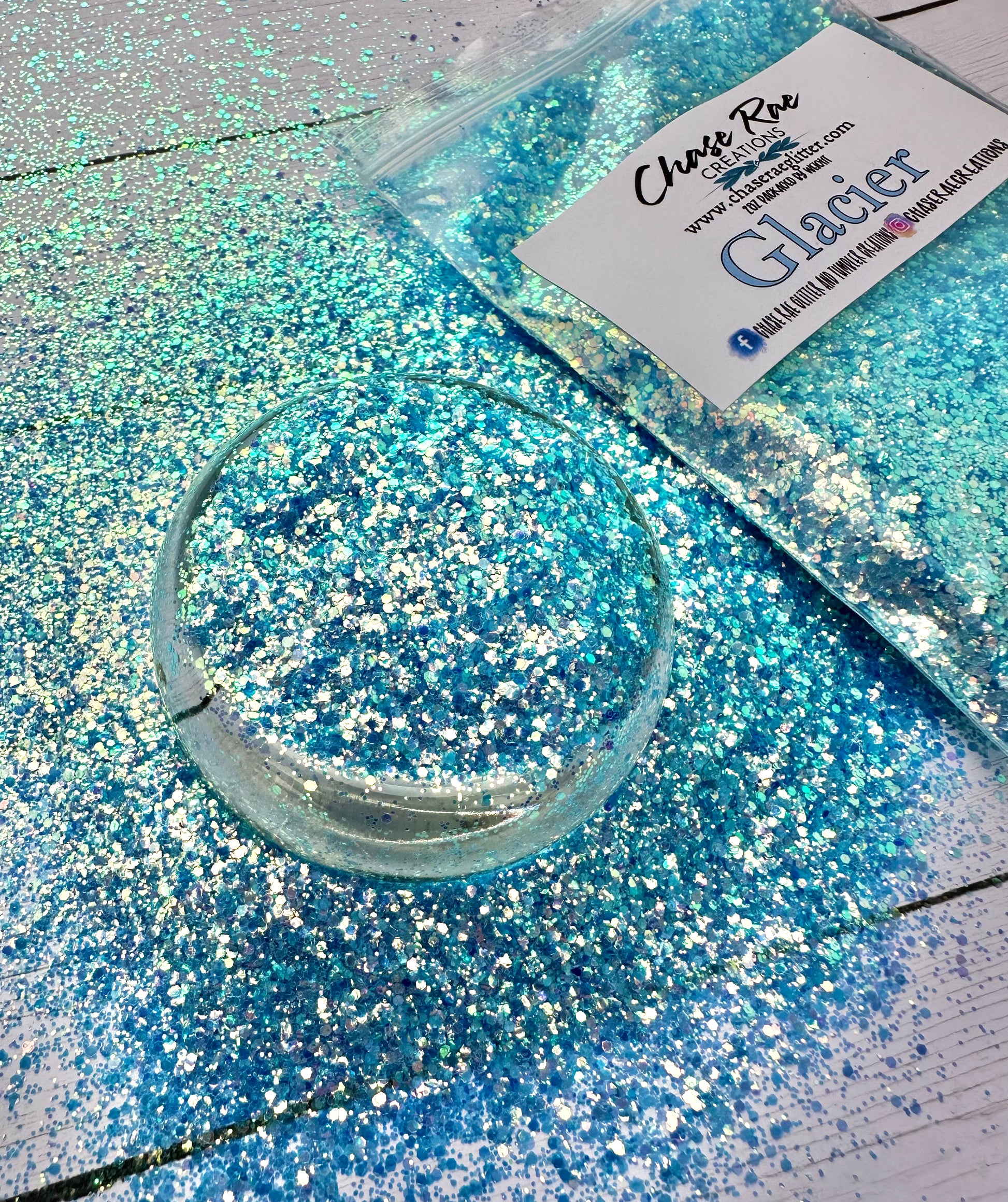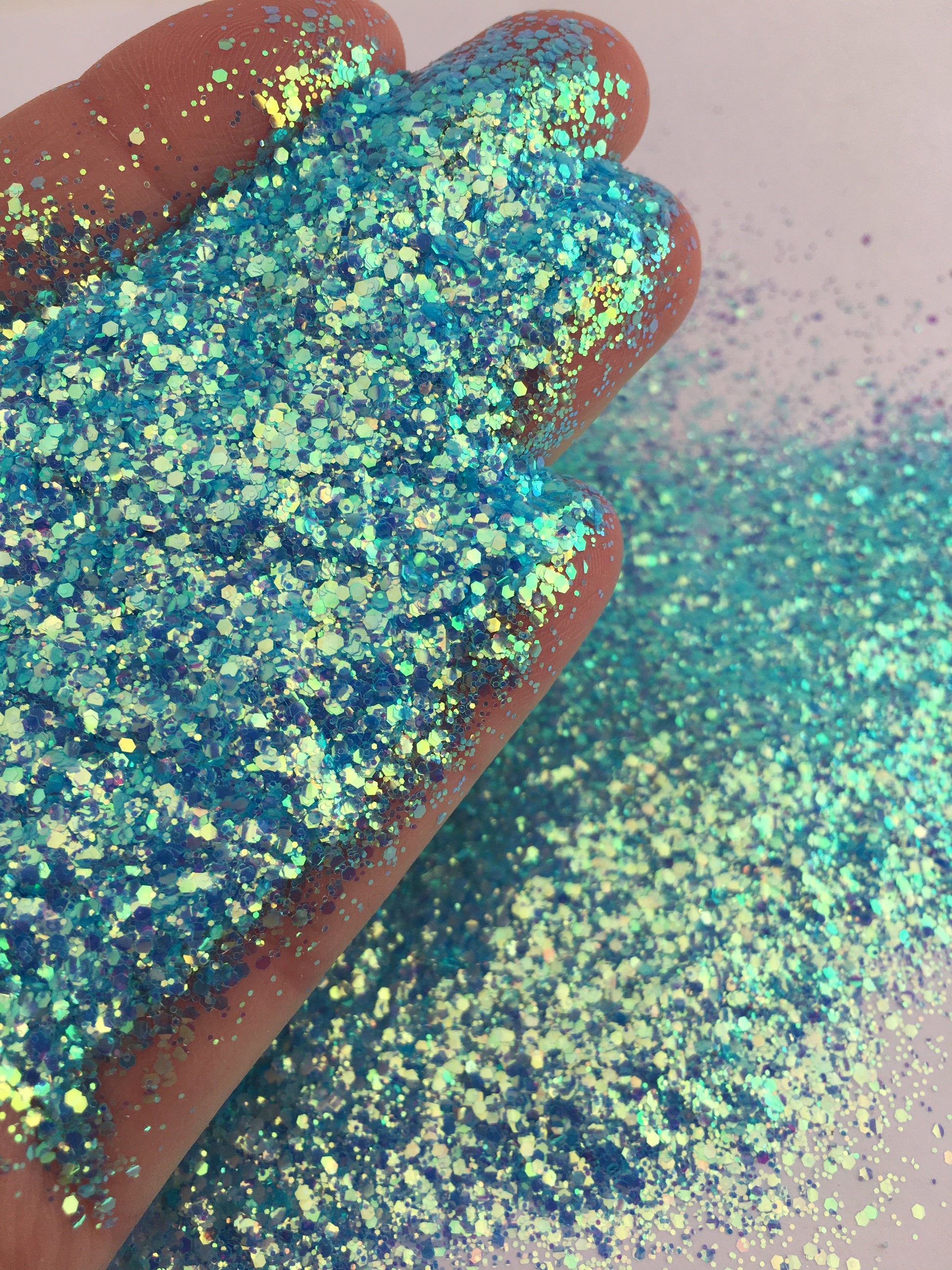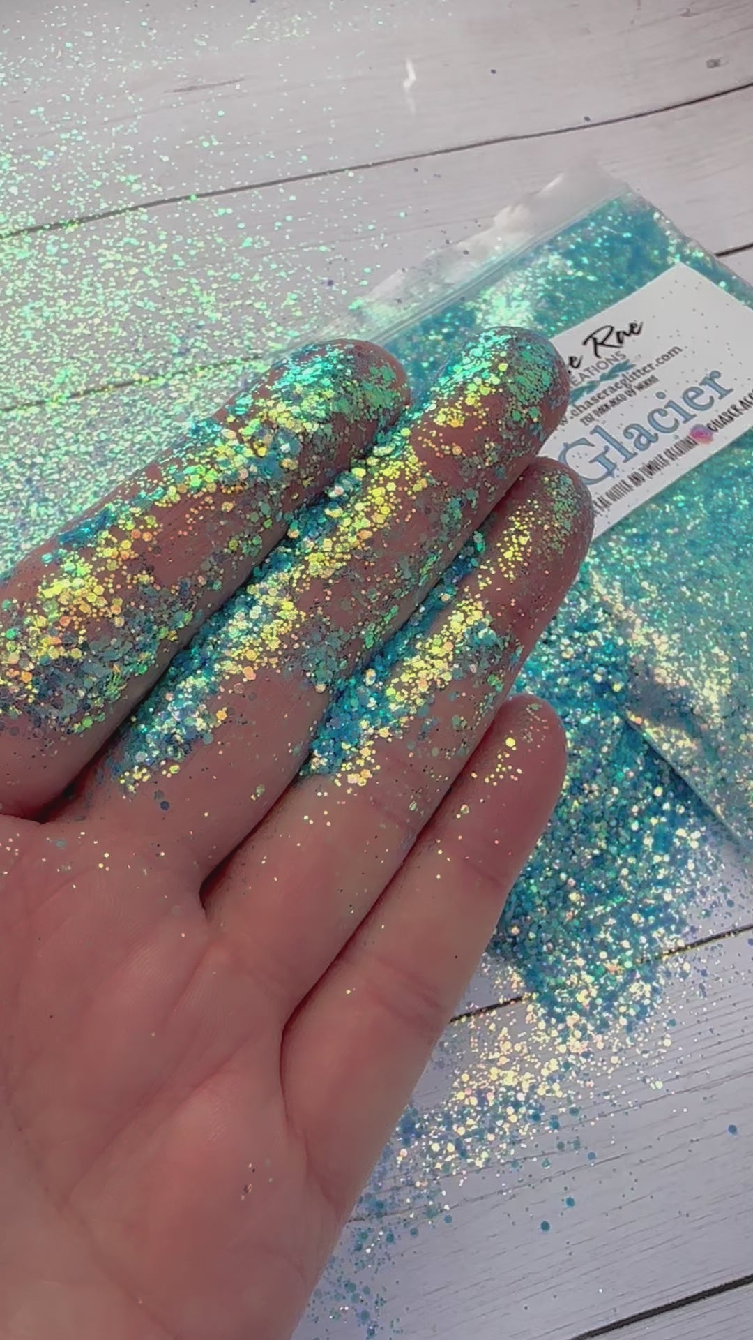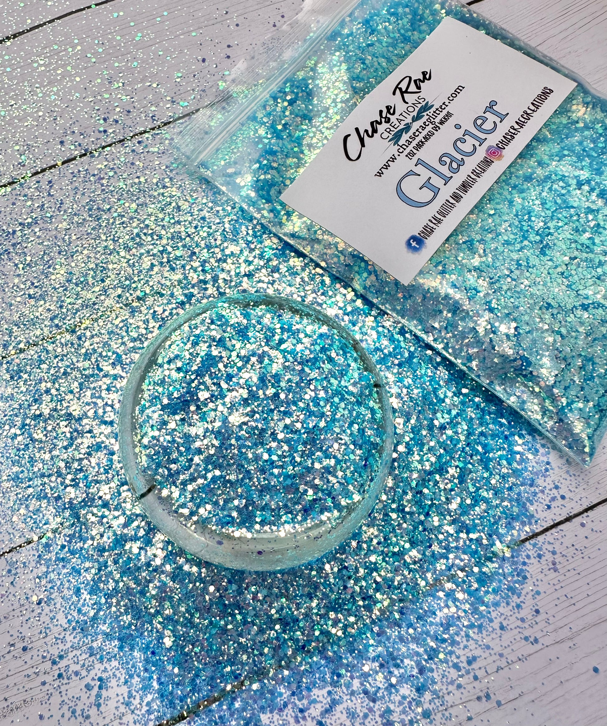 Glacier is an opal icy blue mini chunky mix. Iridescent.