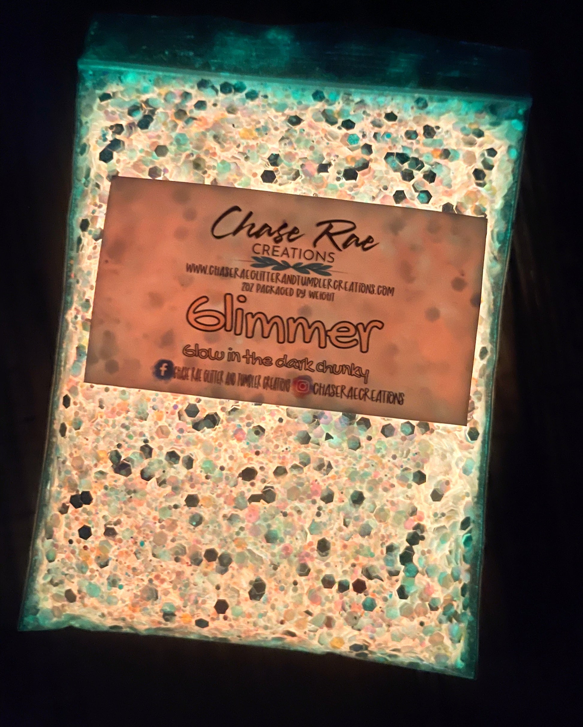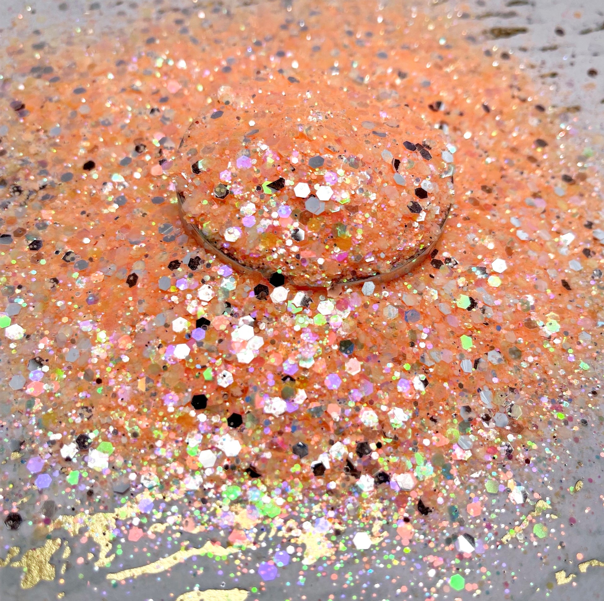 Glimmer is a beautiful peach / pastel orange with a rainbow sparkle. Beautiful as is but is also GLOWS!!