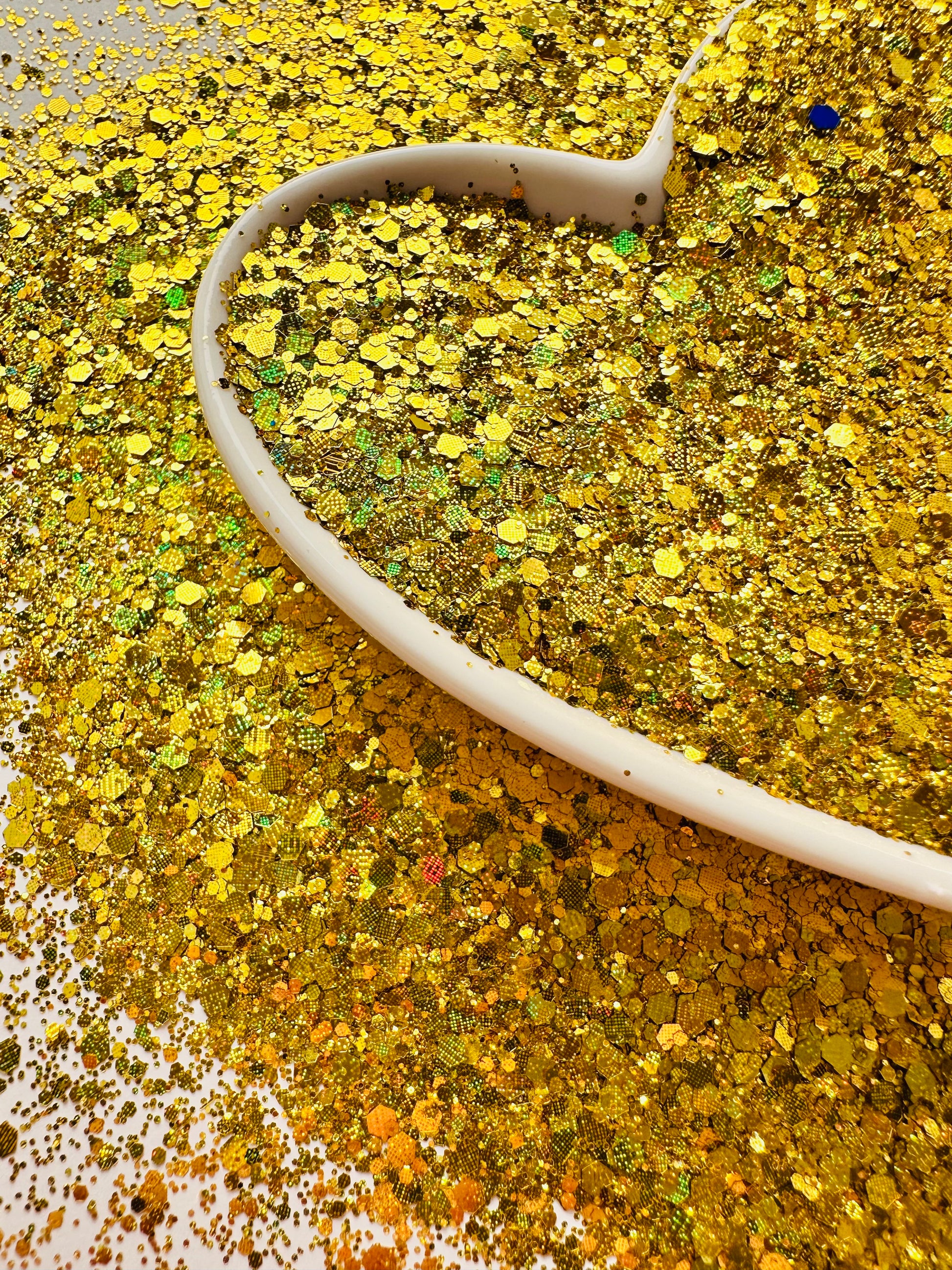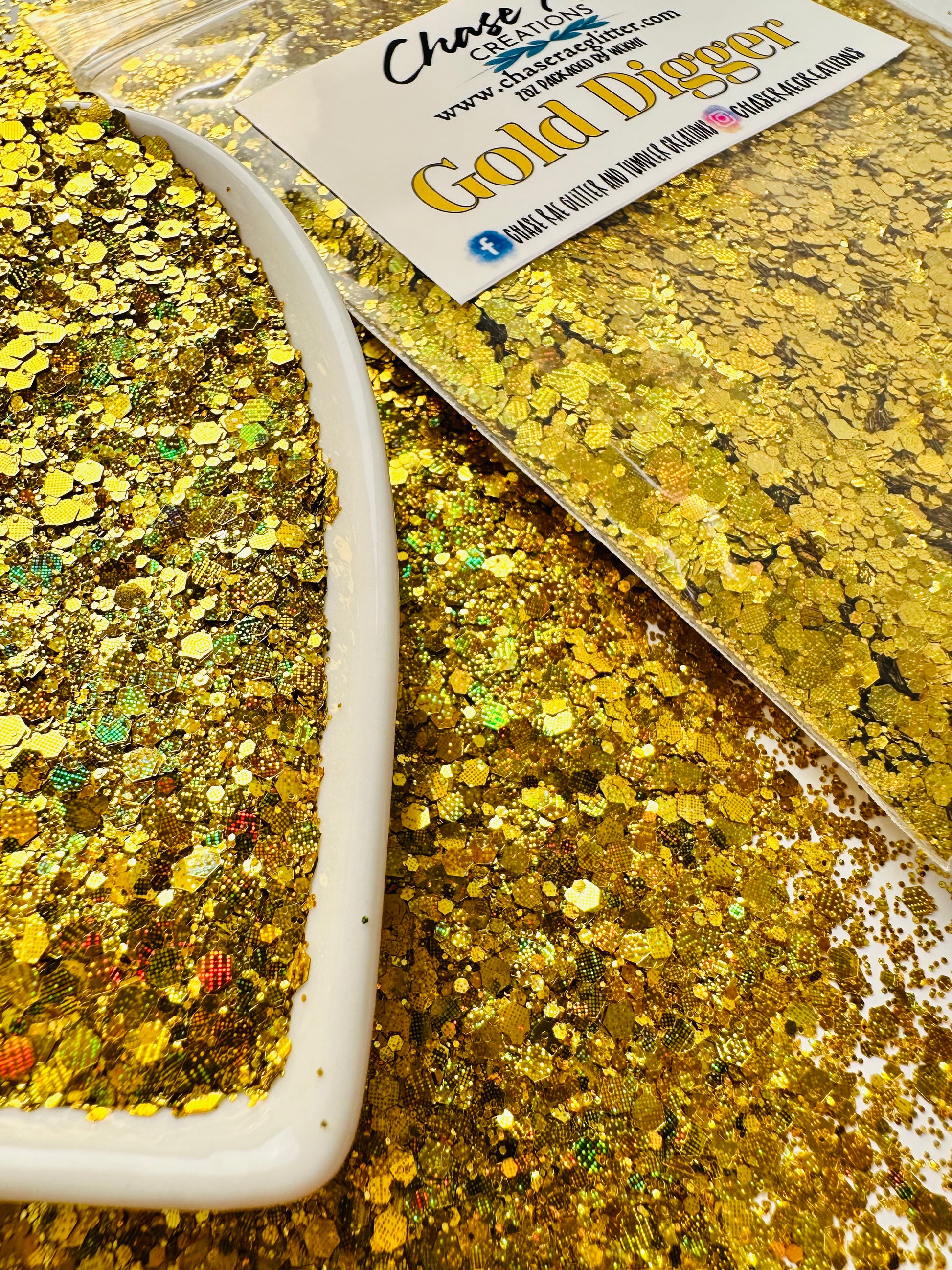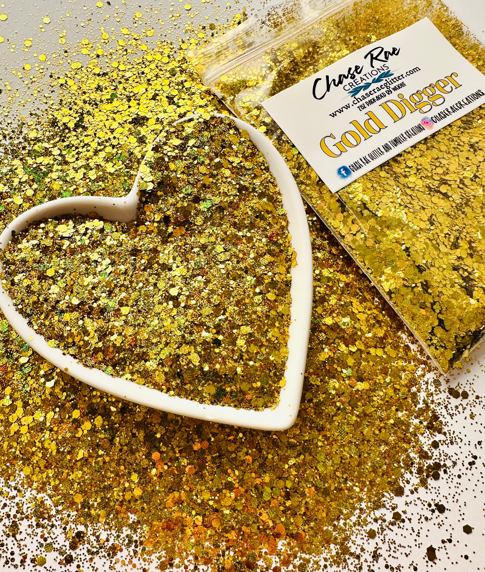 Gold Digger is a holographic chunky mix. Warm gold in color. Notice how each piece looks to be texturized! Yet extremely soft and lightweight.