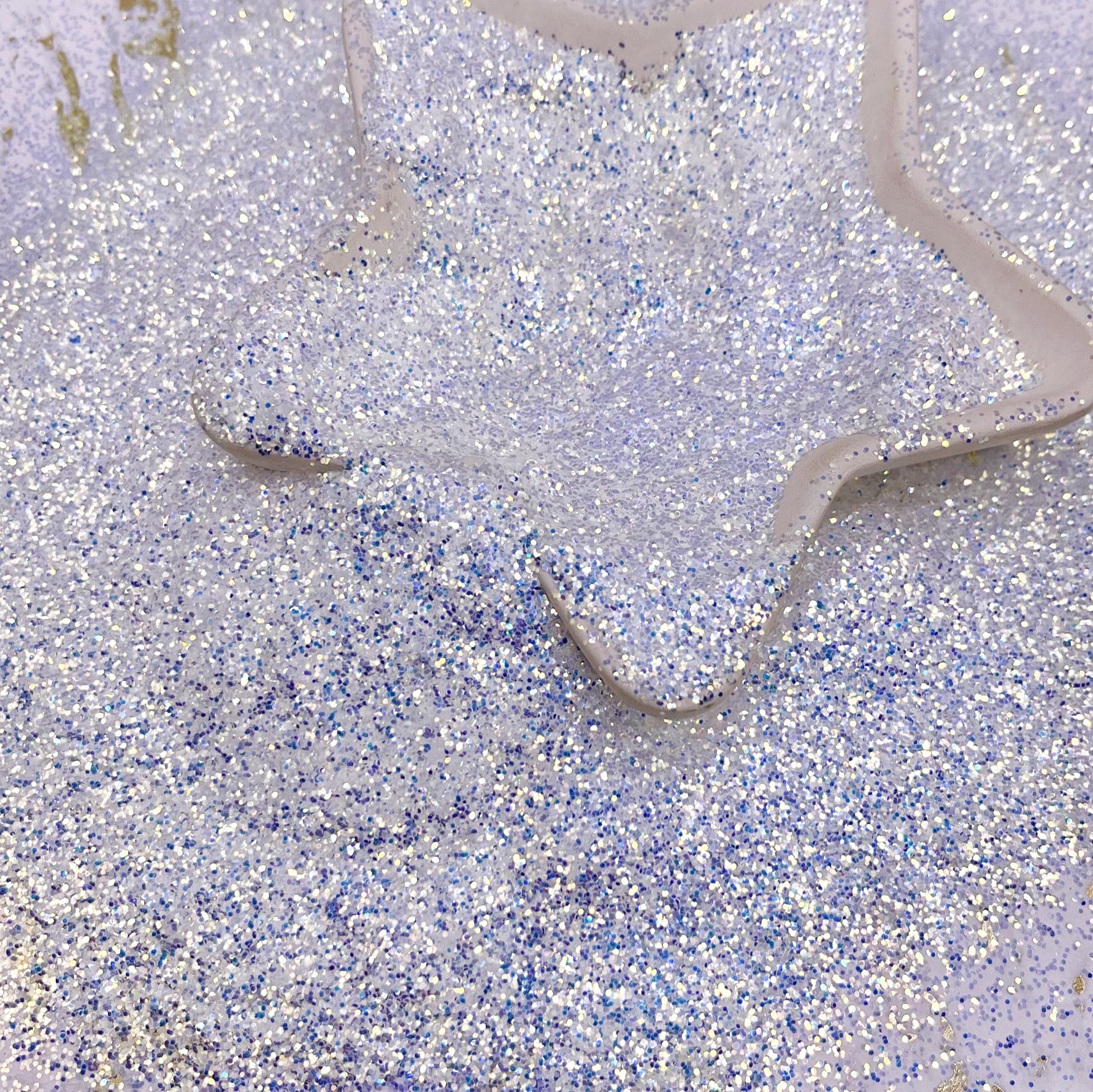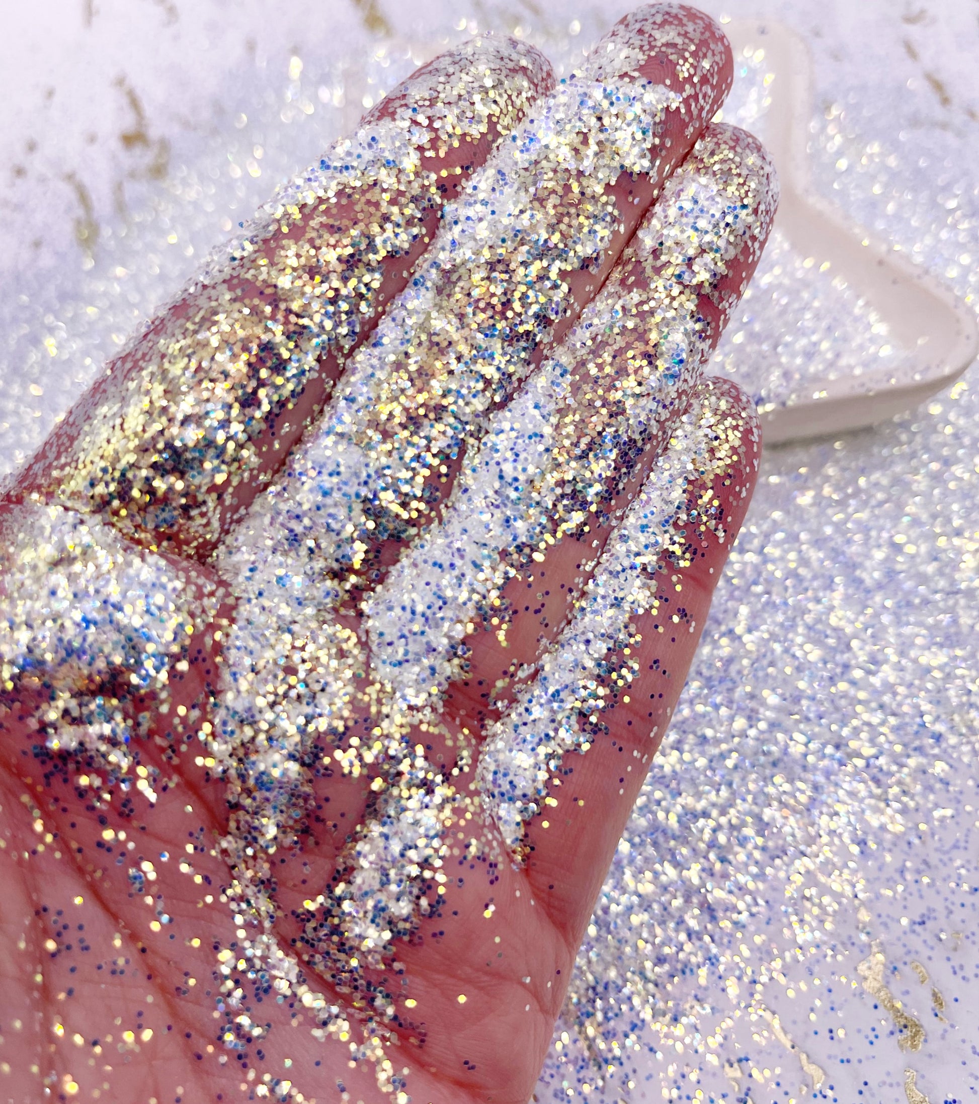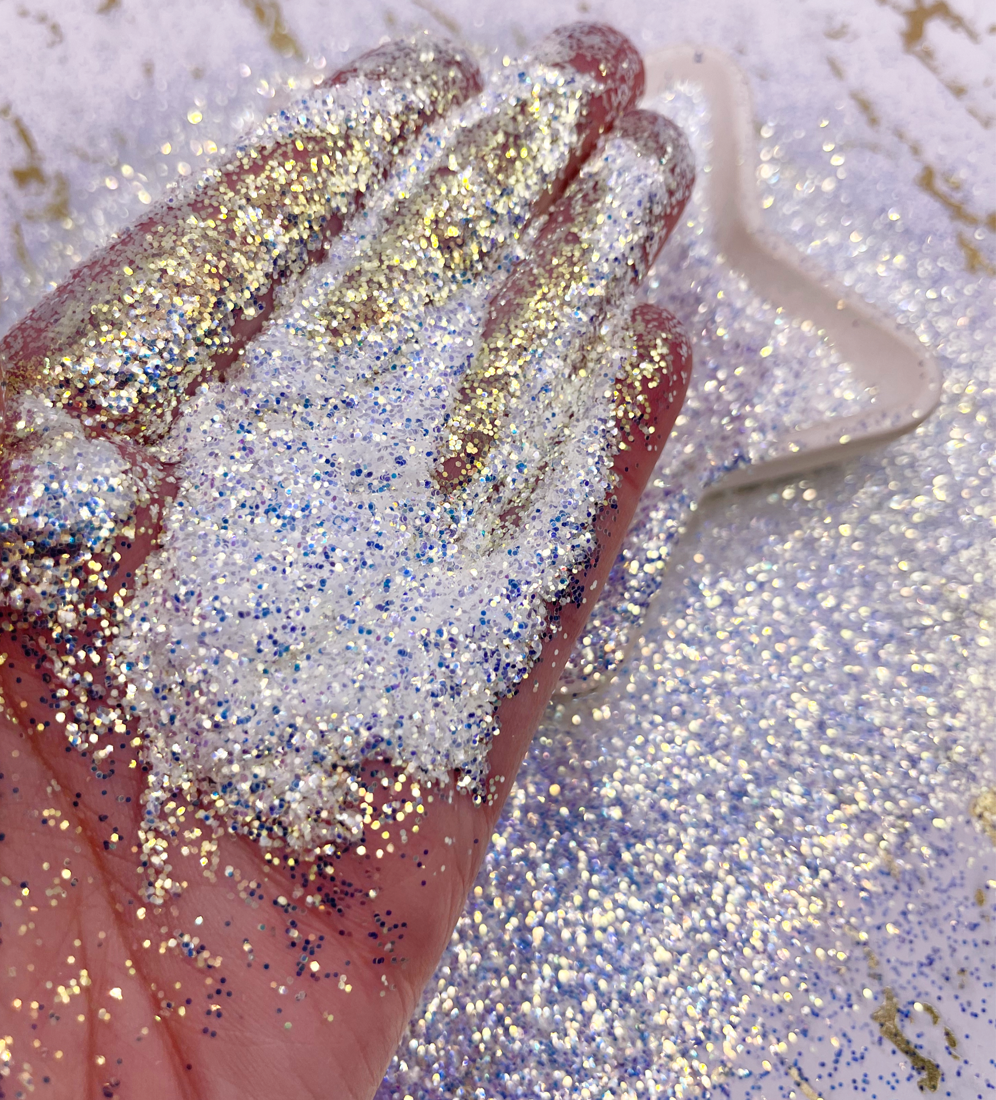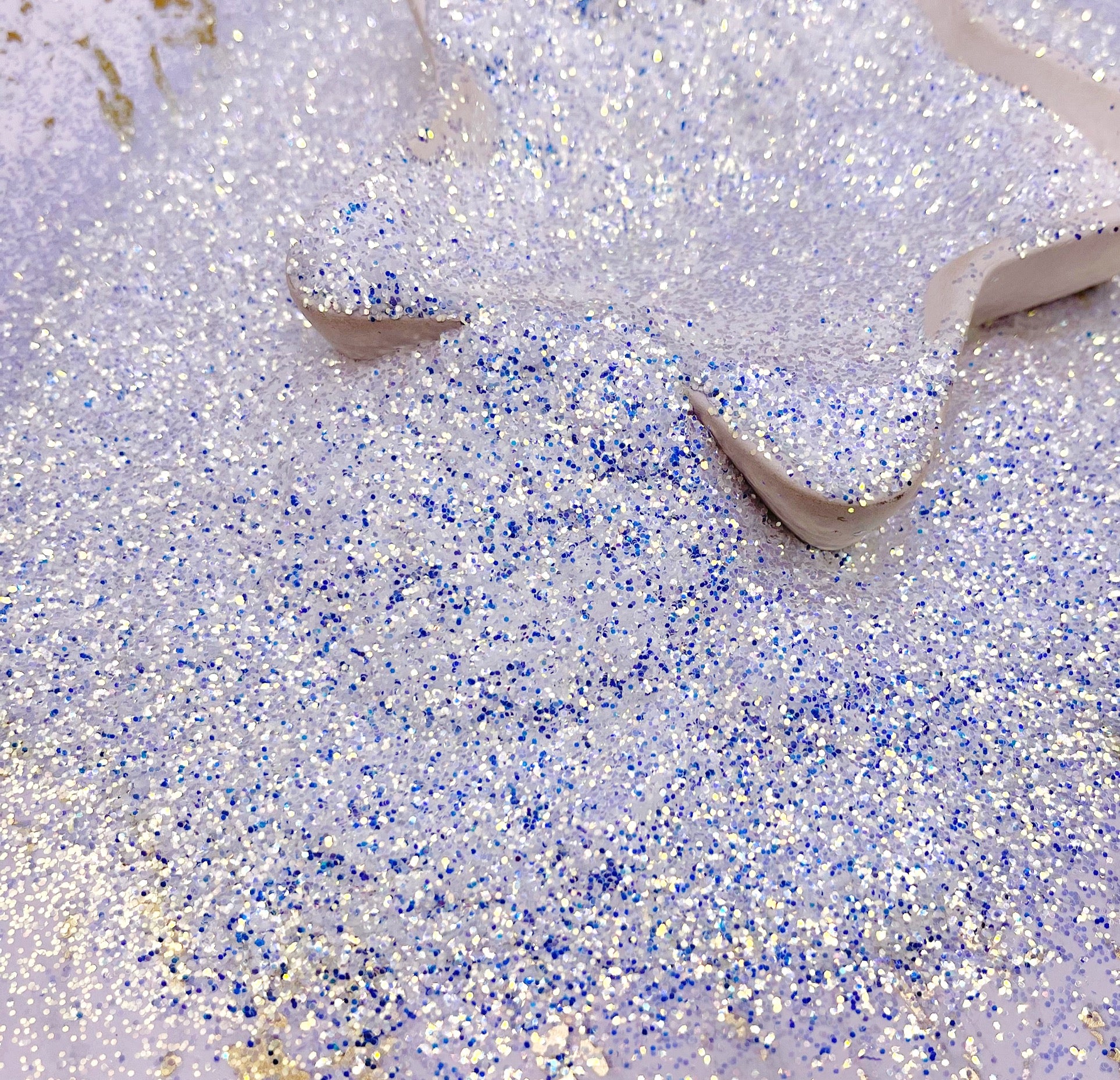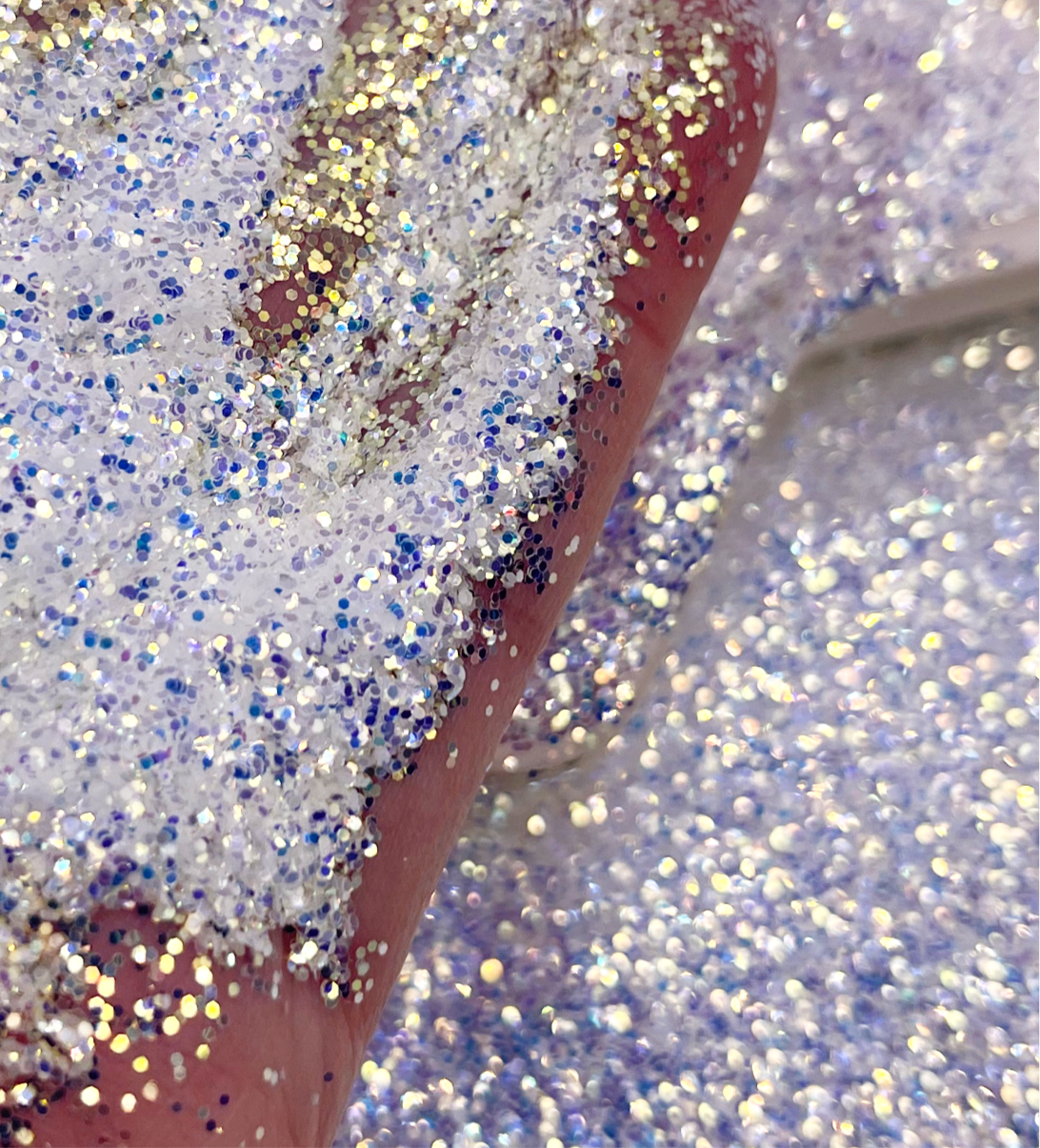 Grace XL is a mini chunky, white, semi-transparent glitter. Your base color will still show through under this one. Hints of icy blue with a golden undertone.