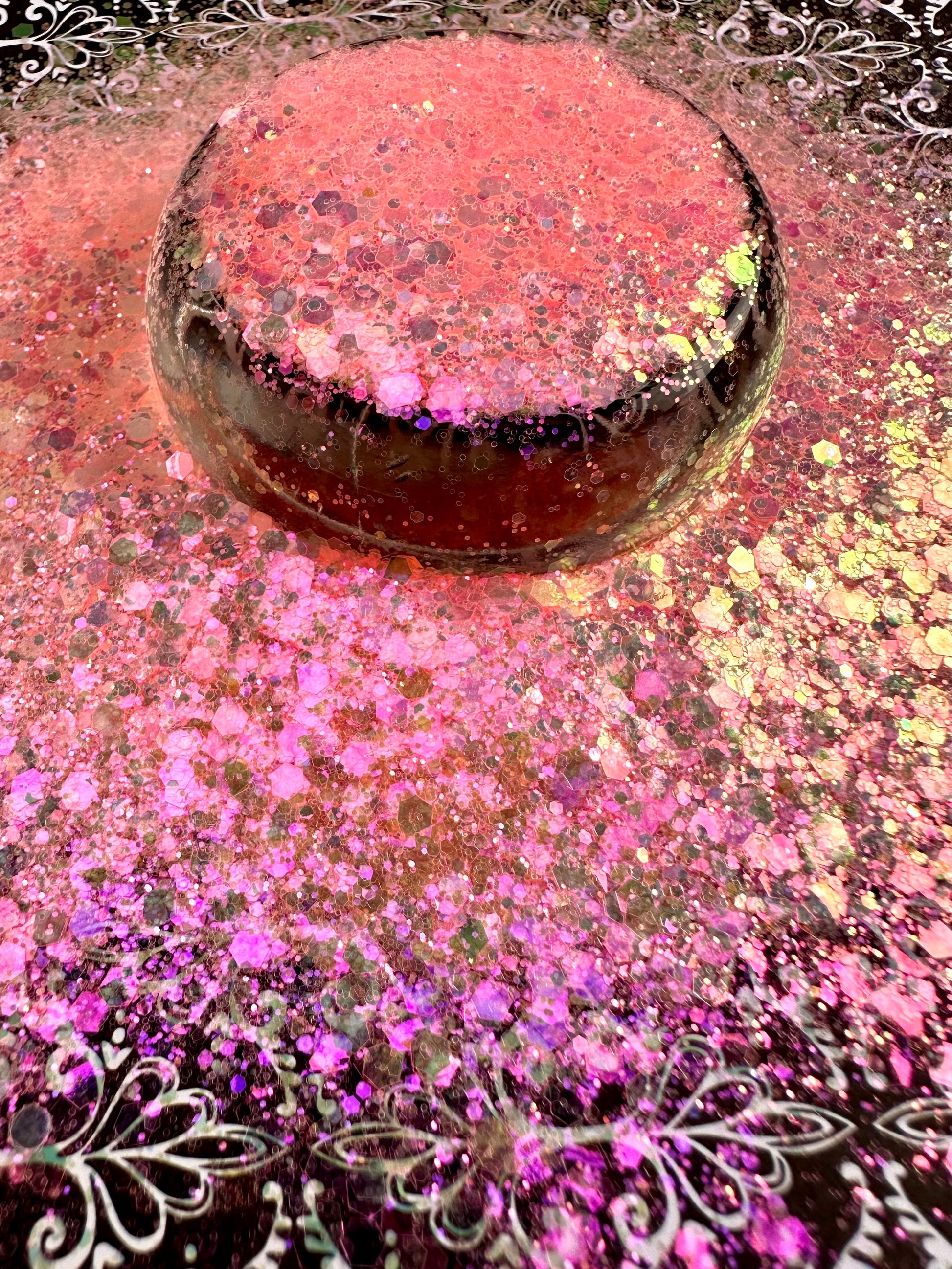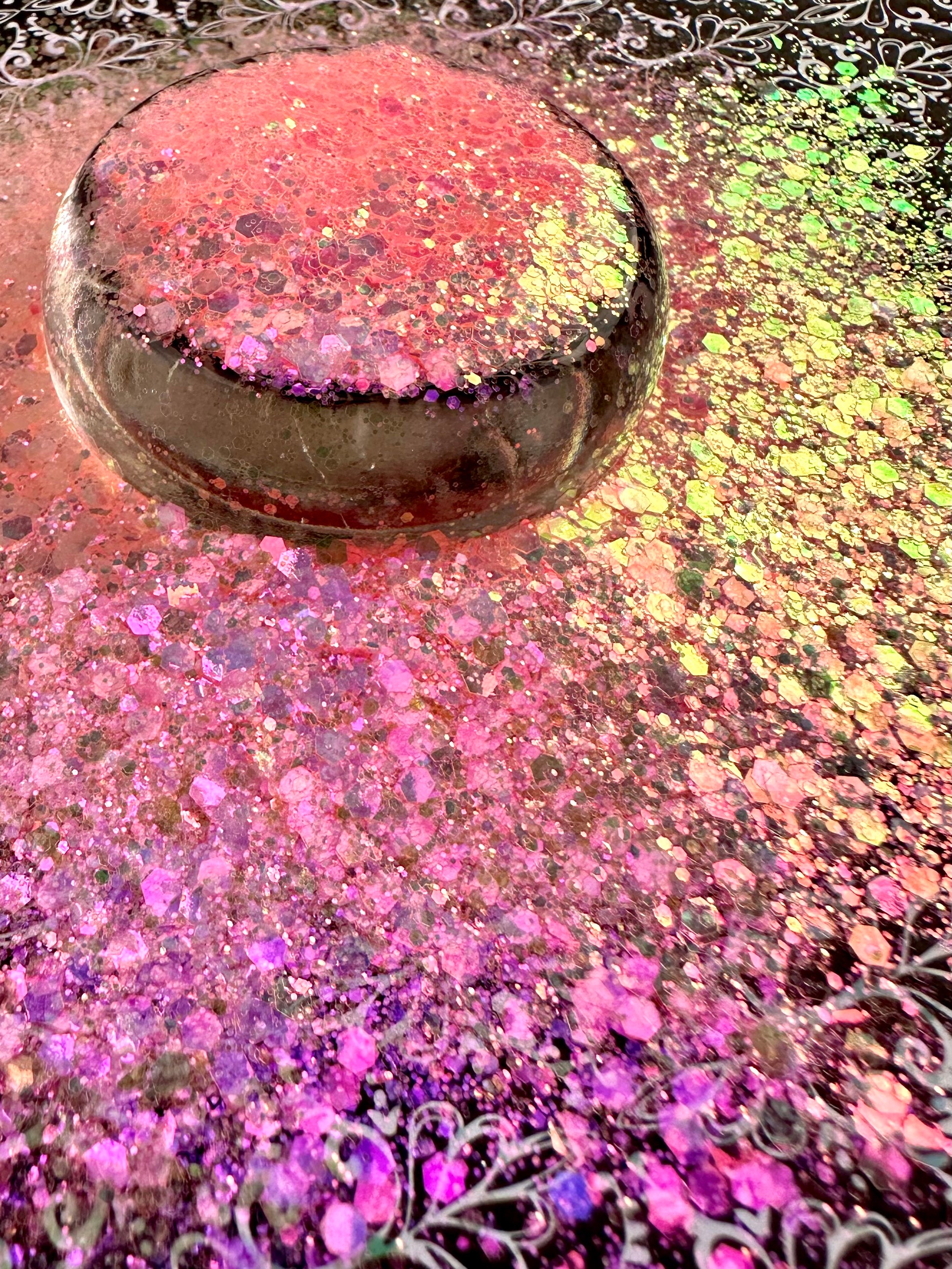 Harmony 2.0. Soft, coral colored, chunky mix with a pink iridescence on dark surfaces.