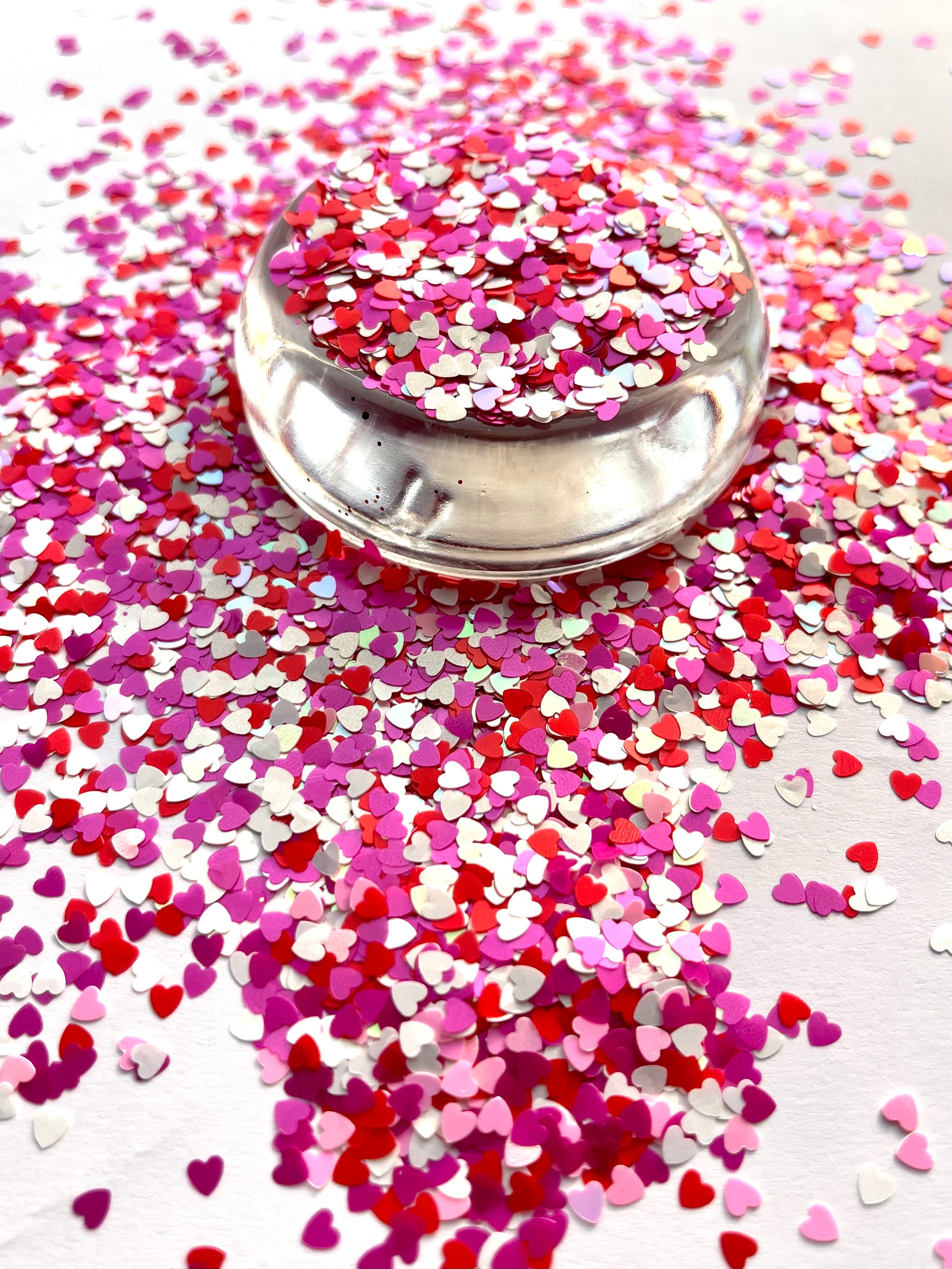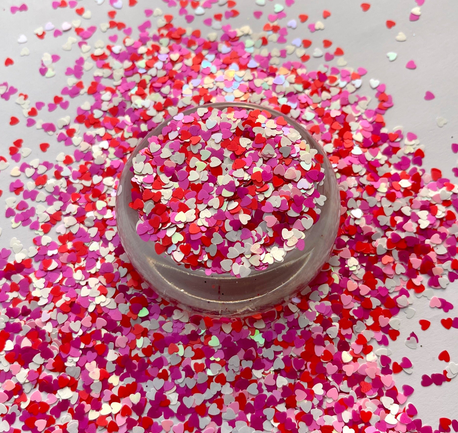 Heart Throb is a cute mix of hearts. White, pink and red. White hearts have some iridescence to them!