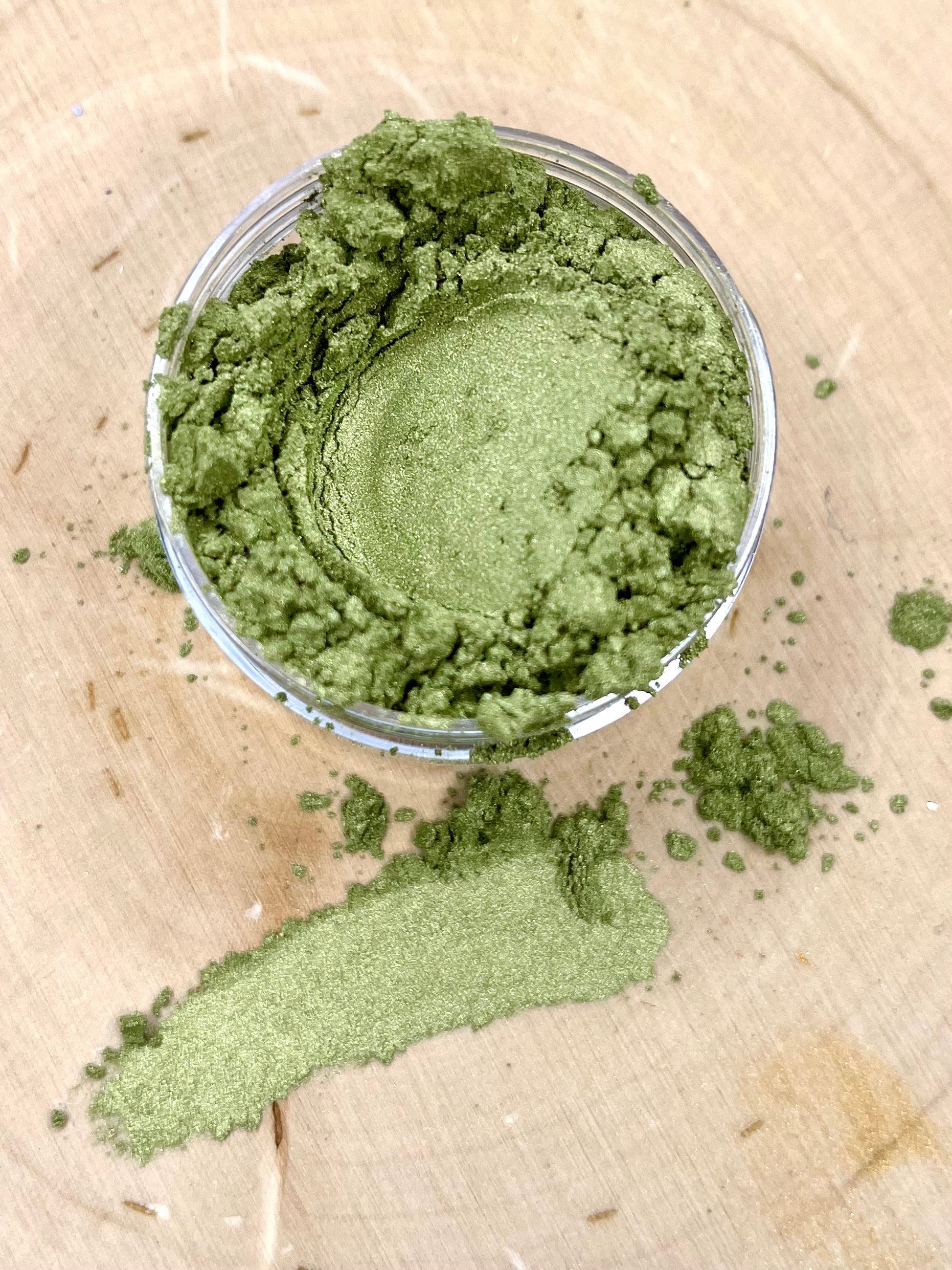 Hearth is a gorgeous, olive green mica powder. Pearlescent shimmer.