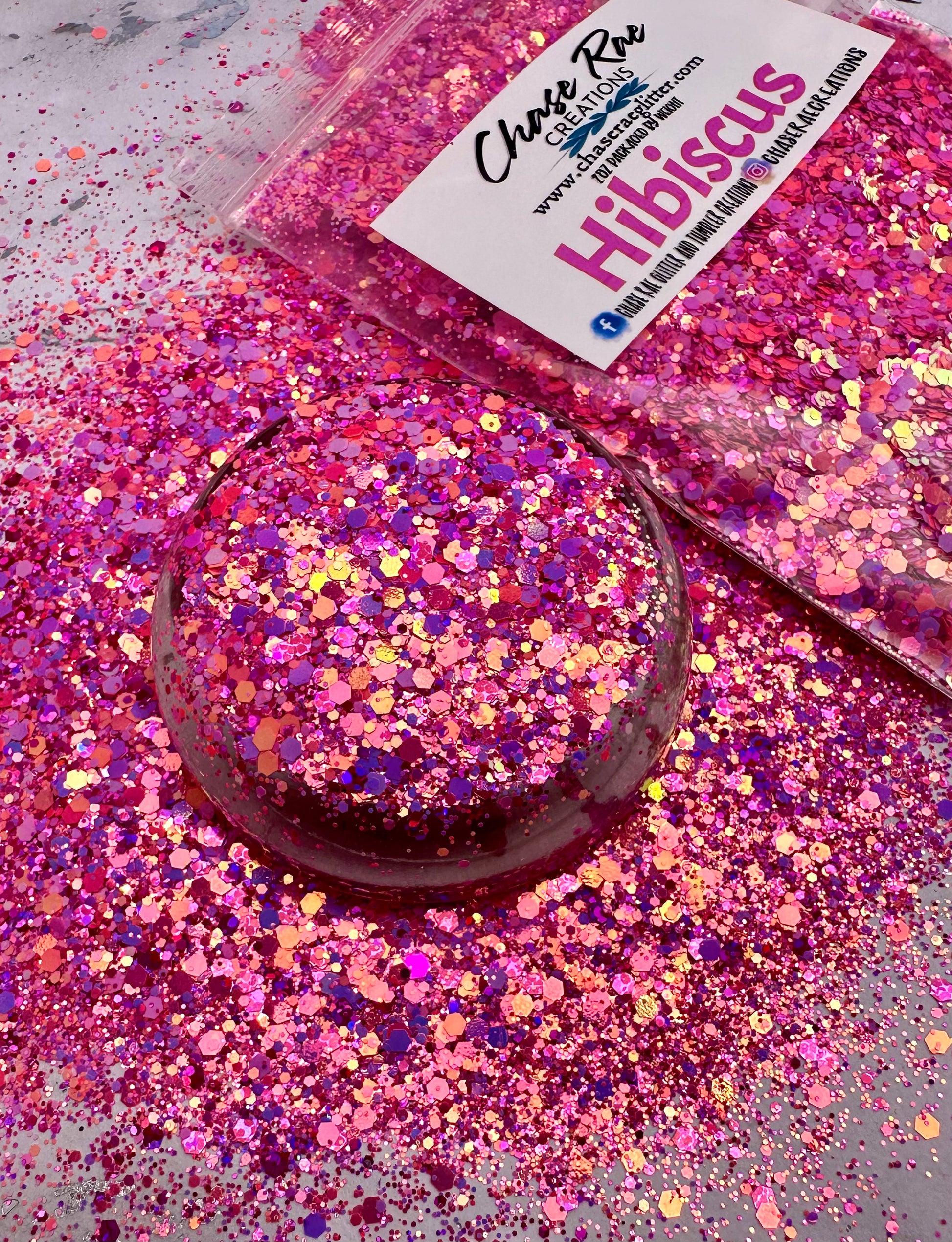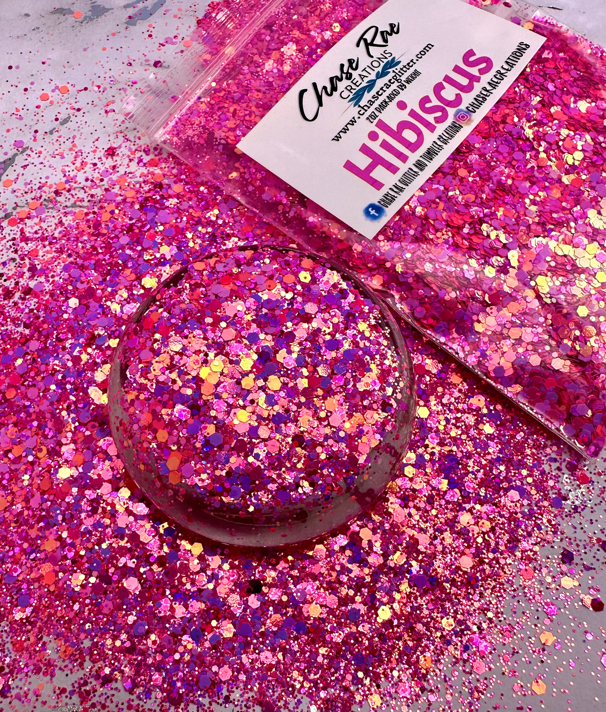 This semi chunky mix is perfect for Spring or Summer! Hibiscus is a mix of pink and purple. With an iridescent shift. All solid colors. Non-translucent.