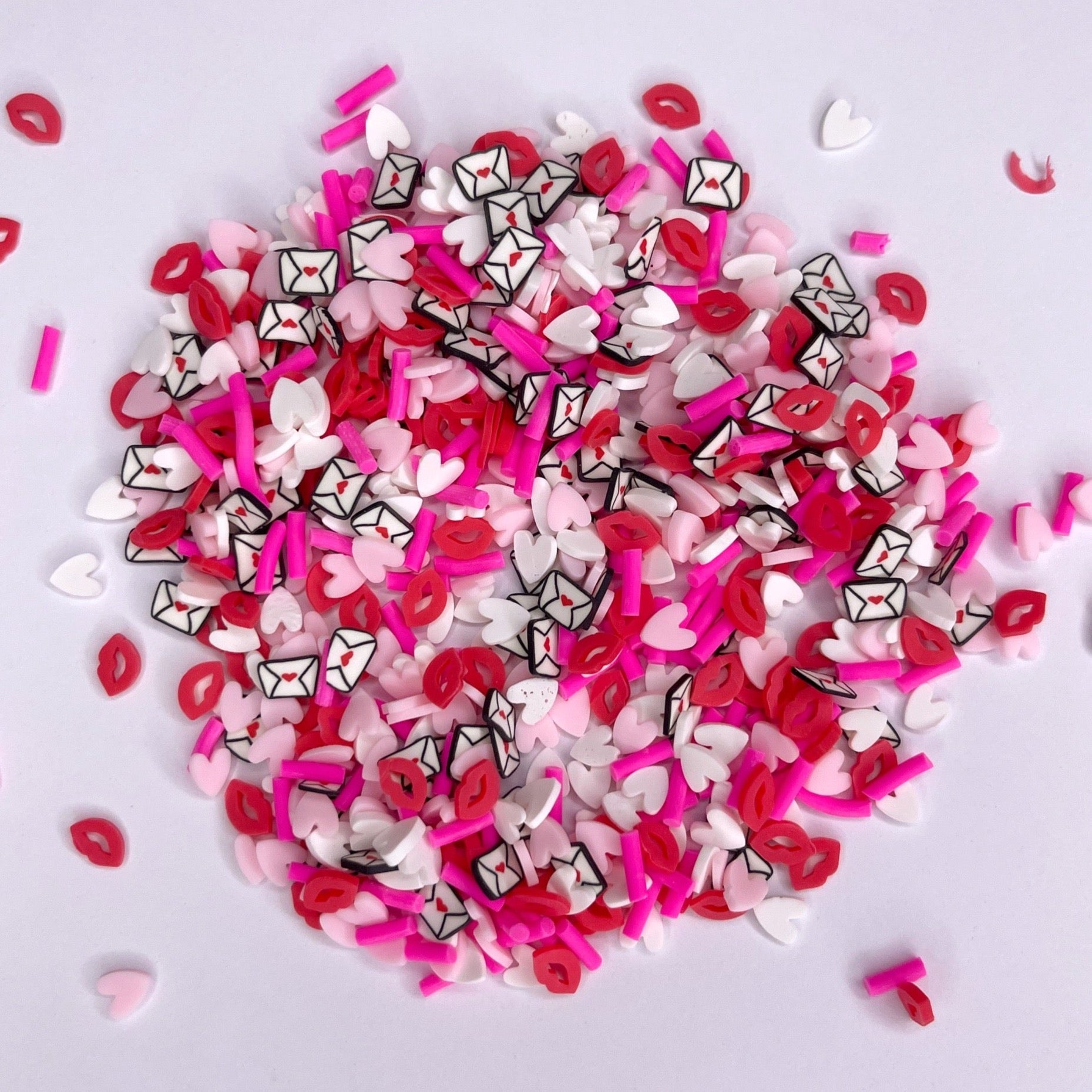 Hot Mail has hot pink sprinkles, white and light pink hearts, lips and letters.