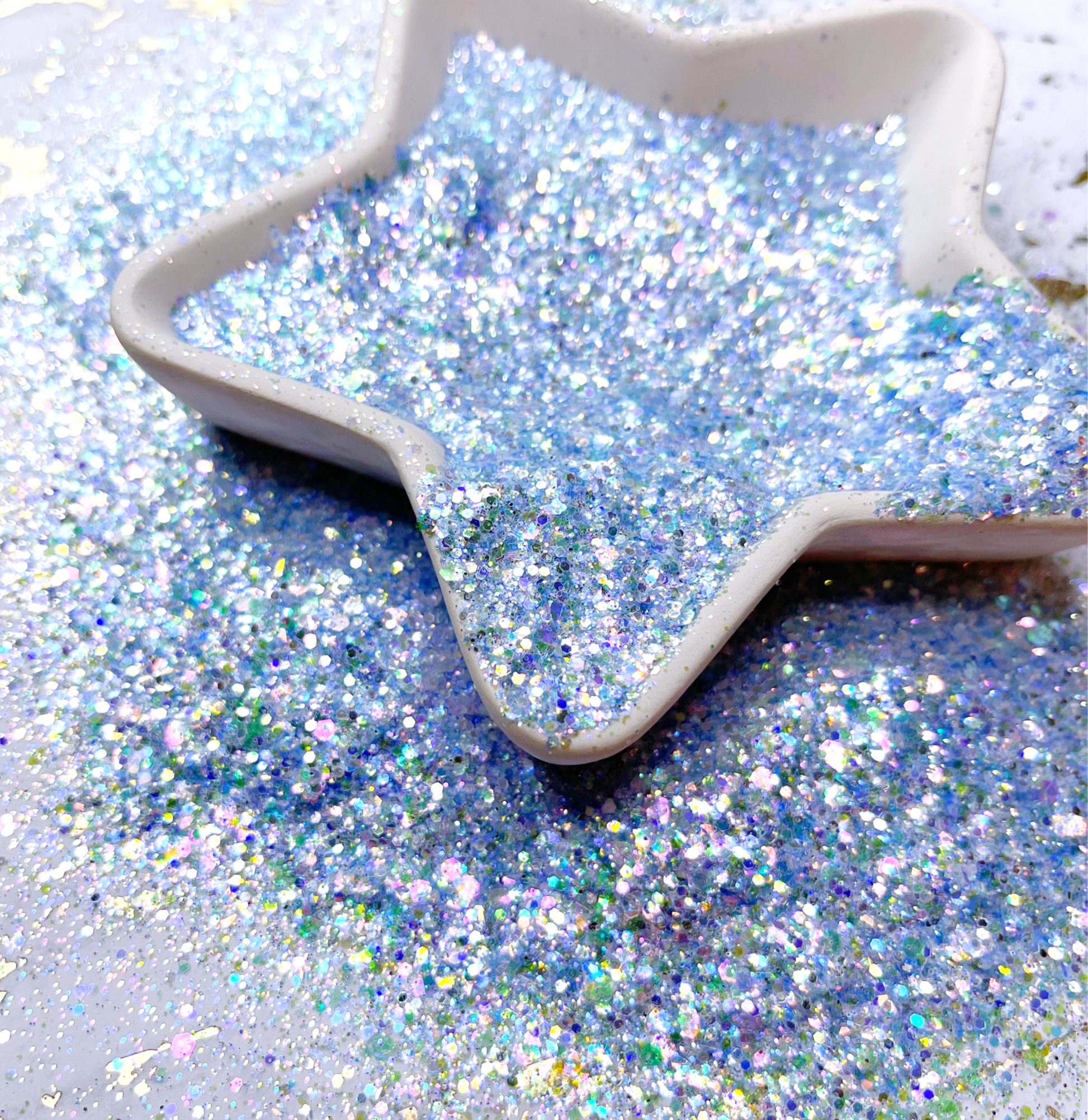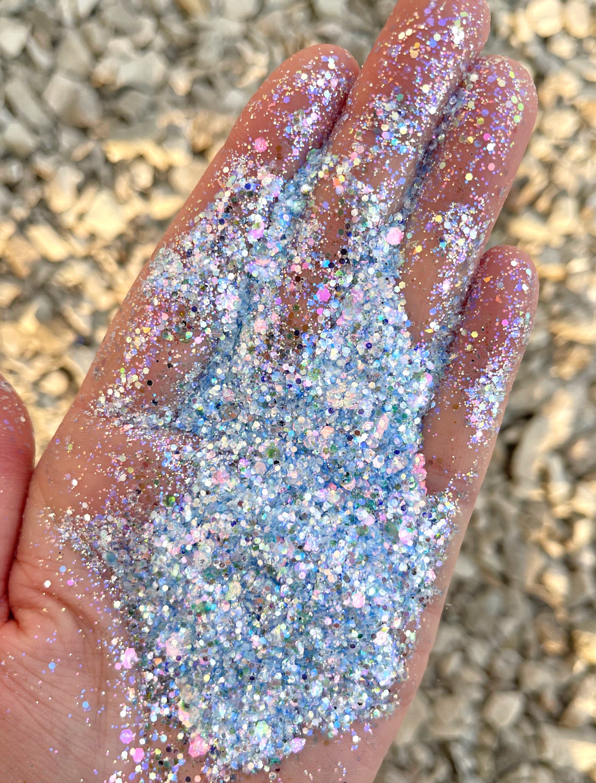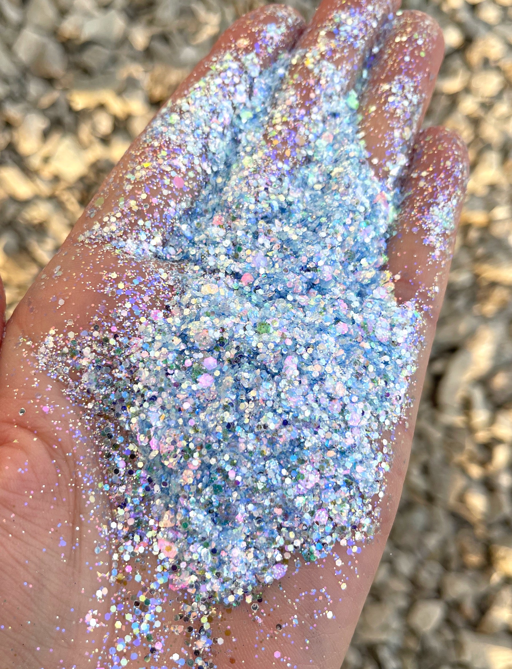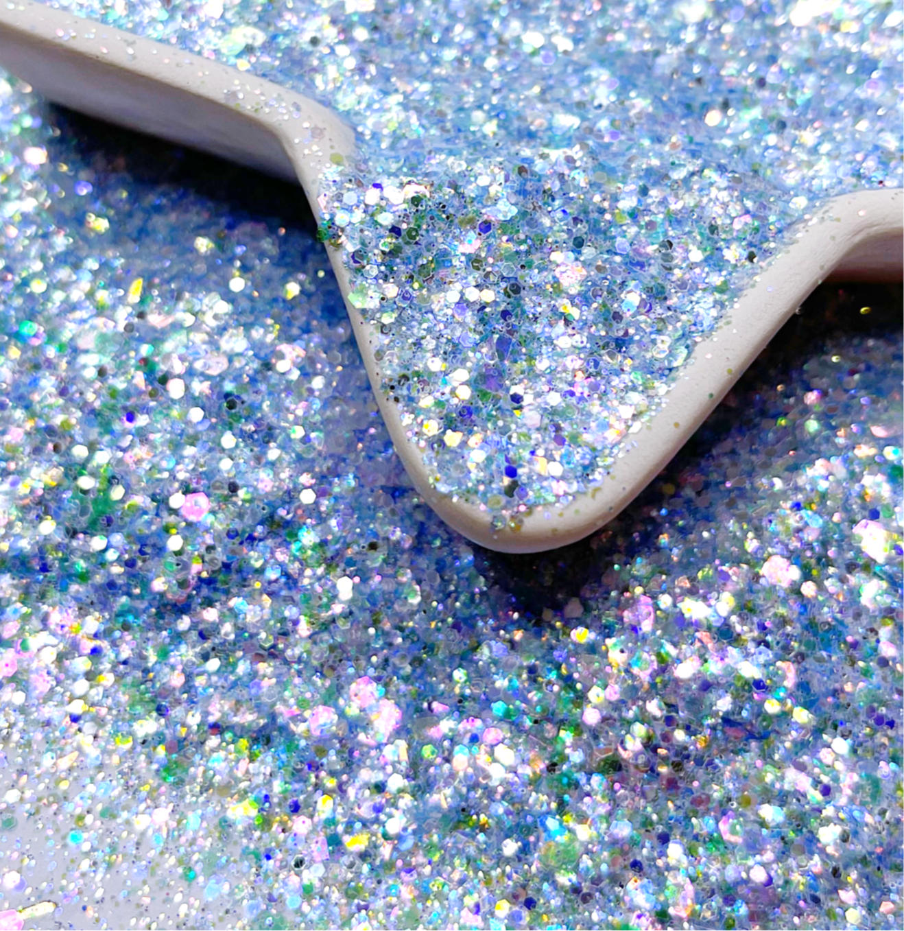 Jasmine is a mini chunky mix. Blue opal-y mix with a slight shift to purple in the right light. Semi translucent.