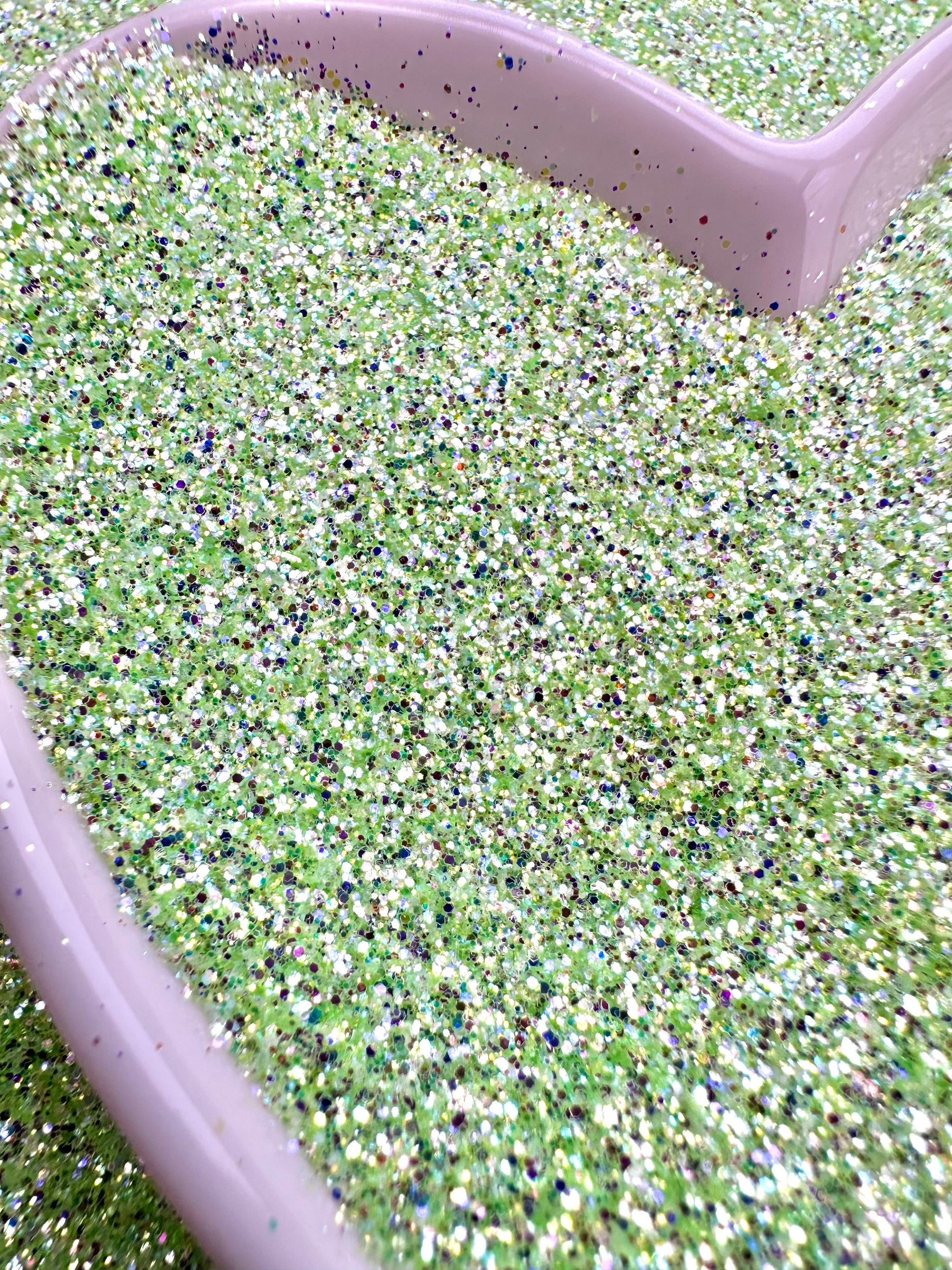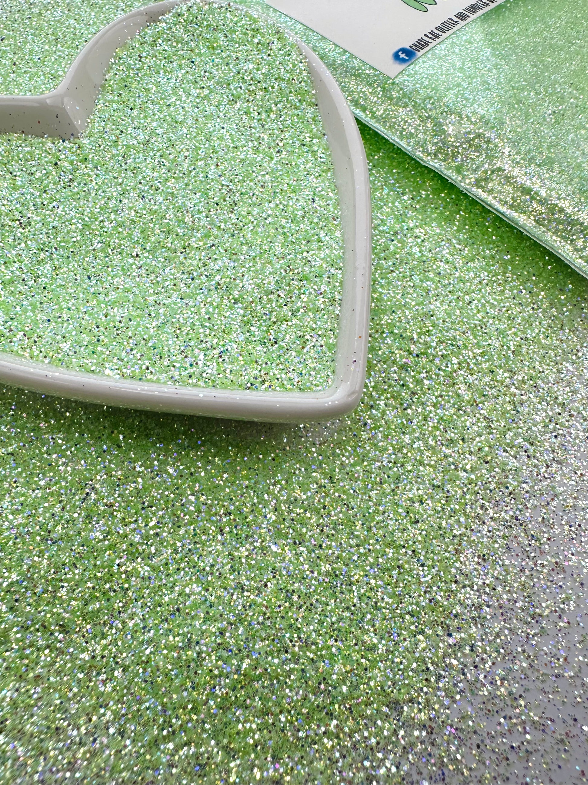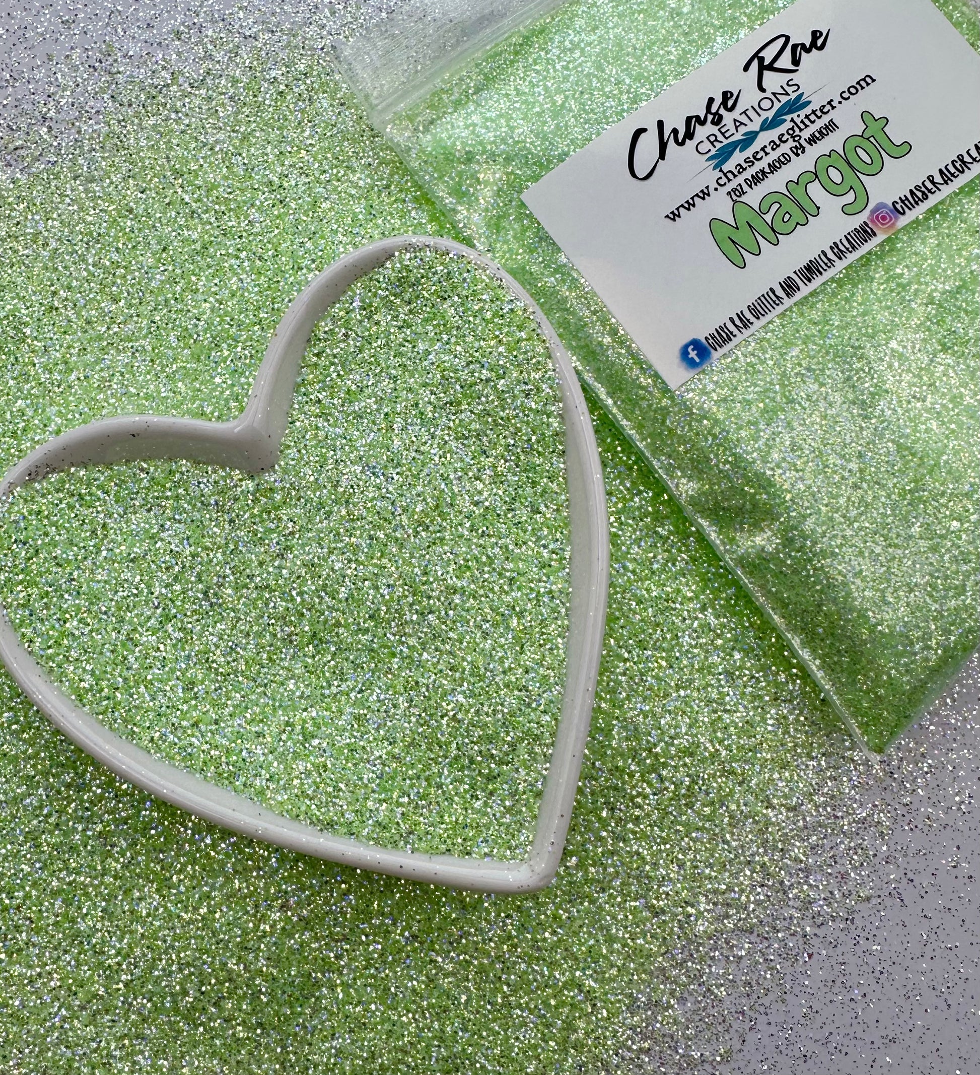 Margot is a semi-transparent pastel green glitter. It has a very unique mix of iridescent opal to give it major sparkle!