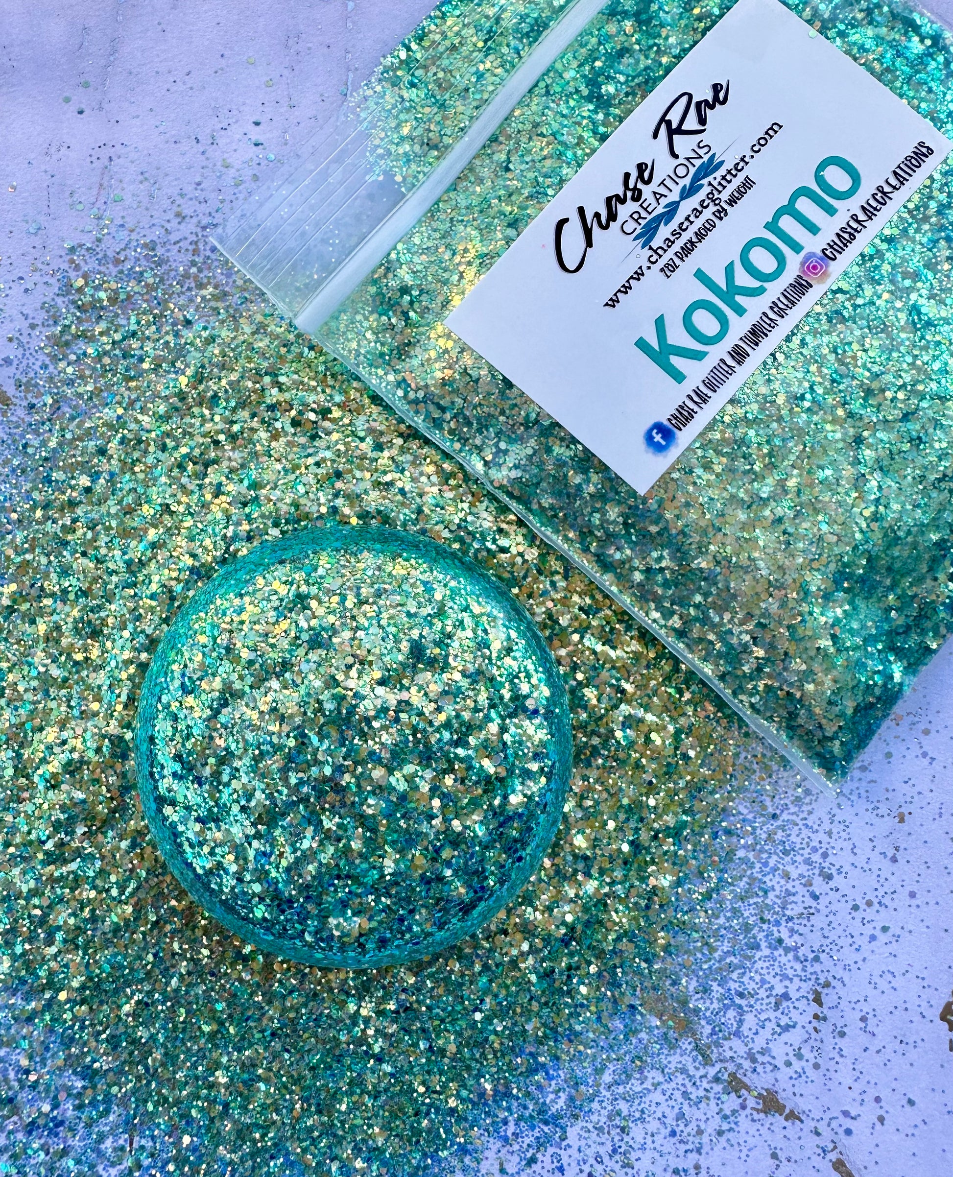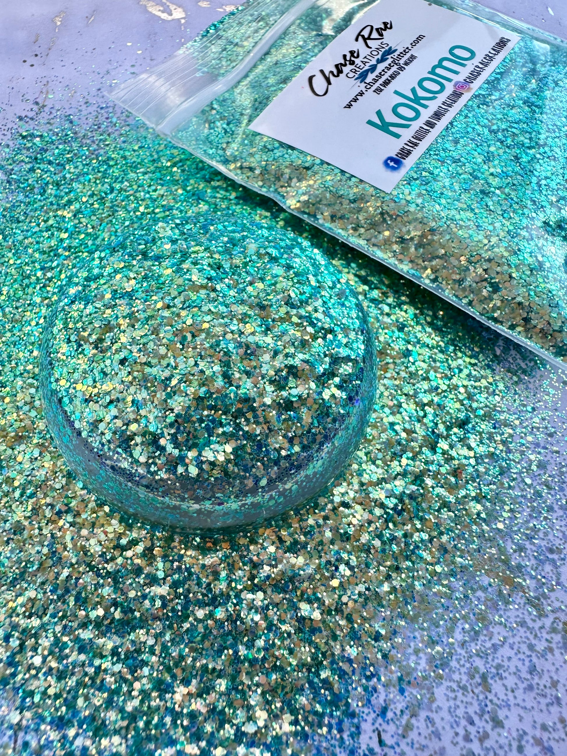 If you love Glacier, you’ll love Kokomo! Blue / Green iridescent mini chunky mix. Teal