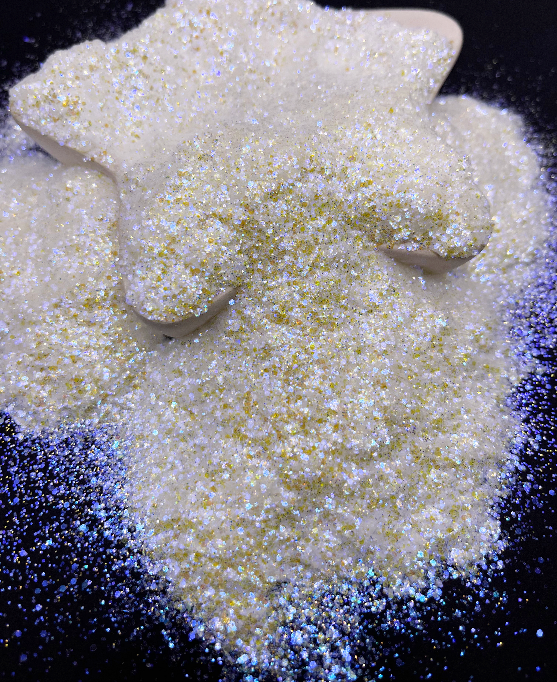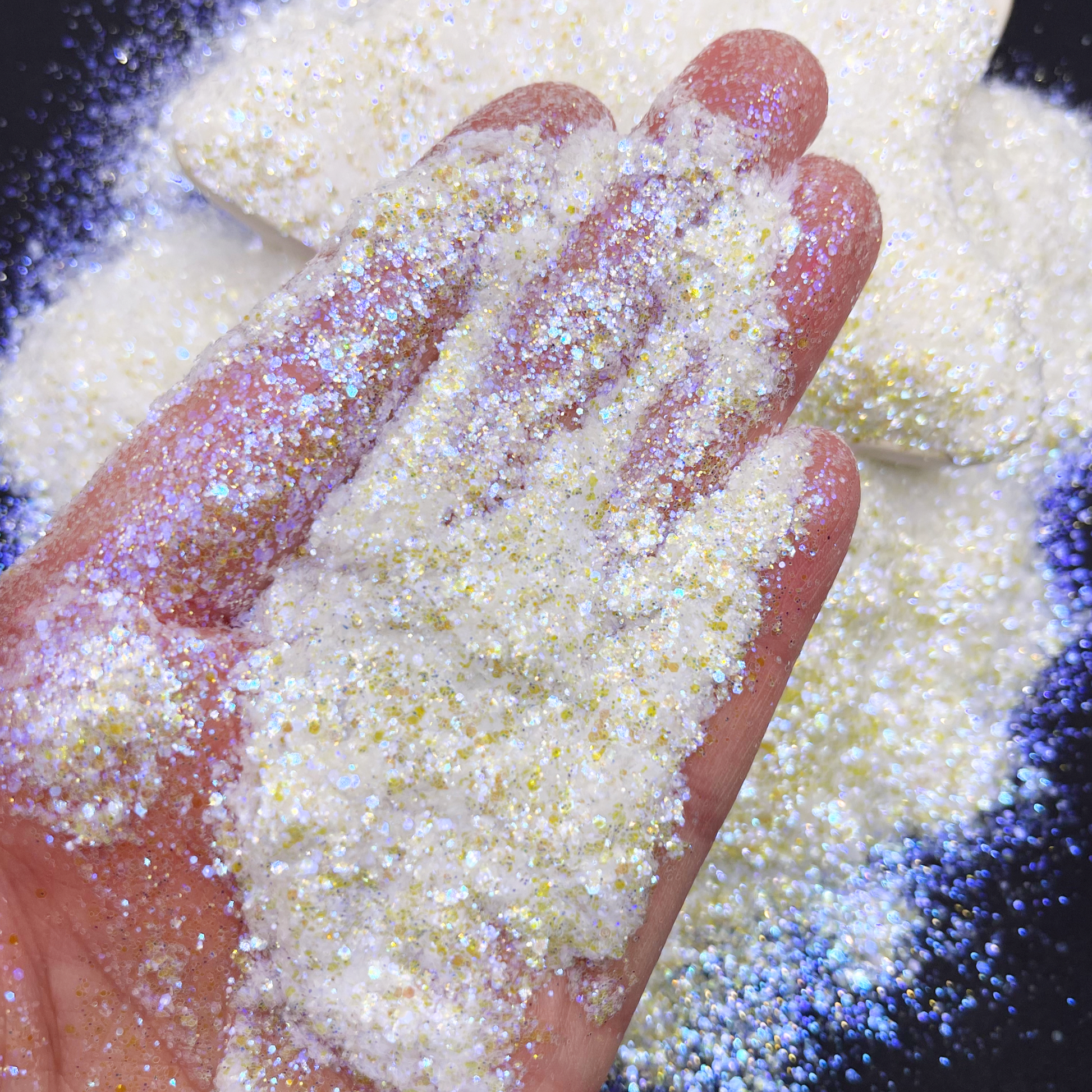 Lace is a gorgeous off white, cream colored glitter. Has a beautiful blue/purple shift on a darker base. Semi Chunky mix.