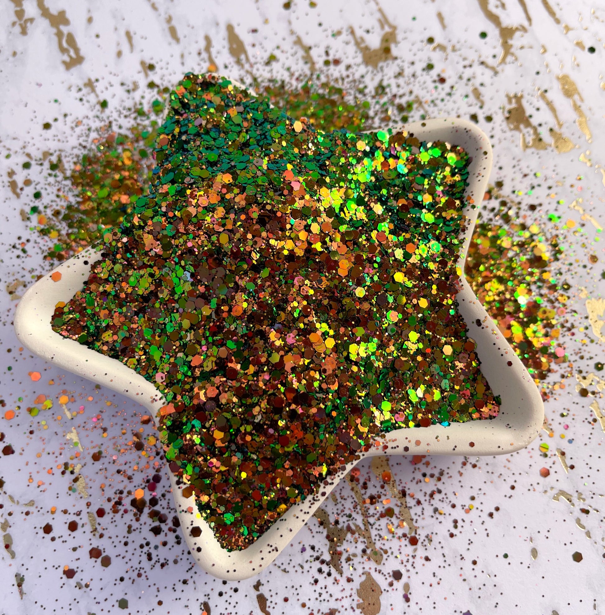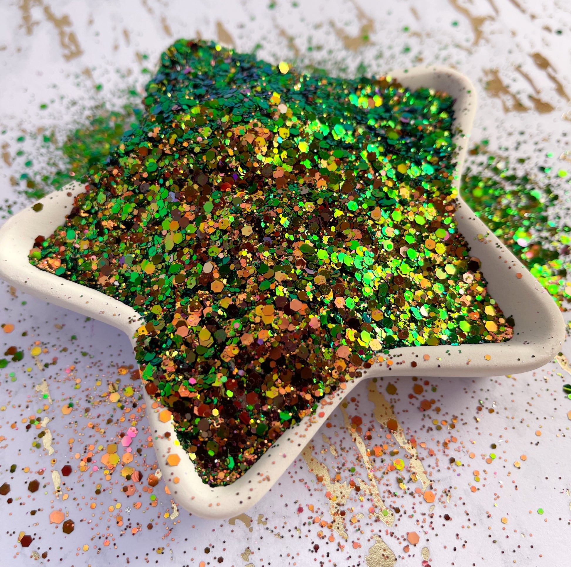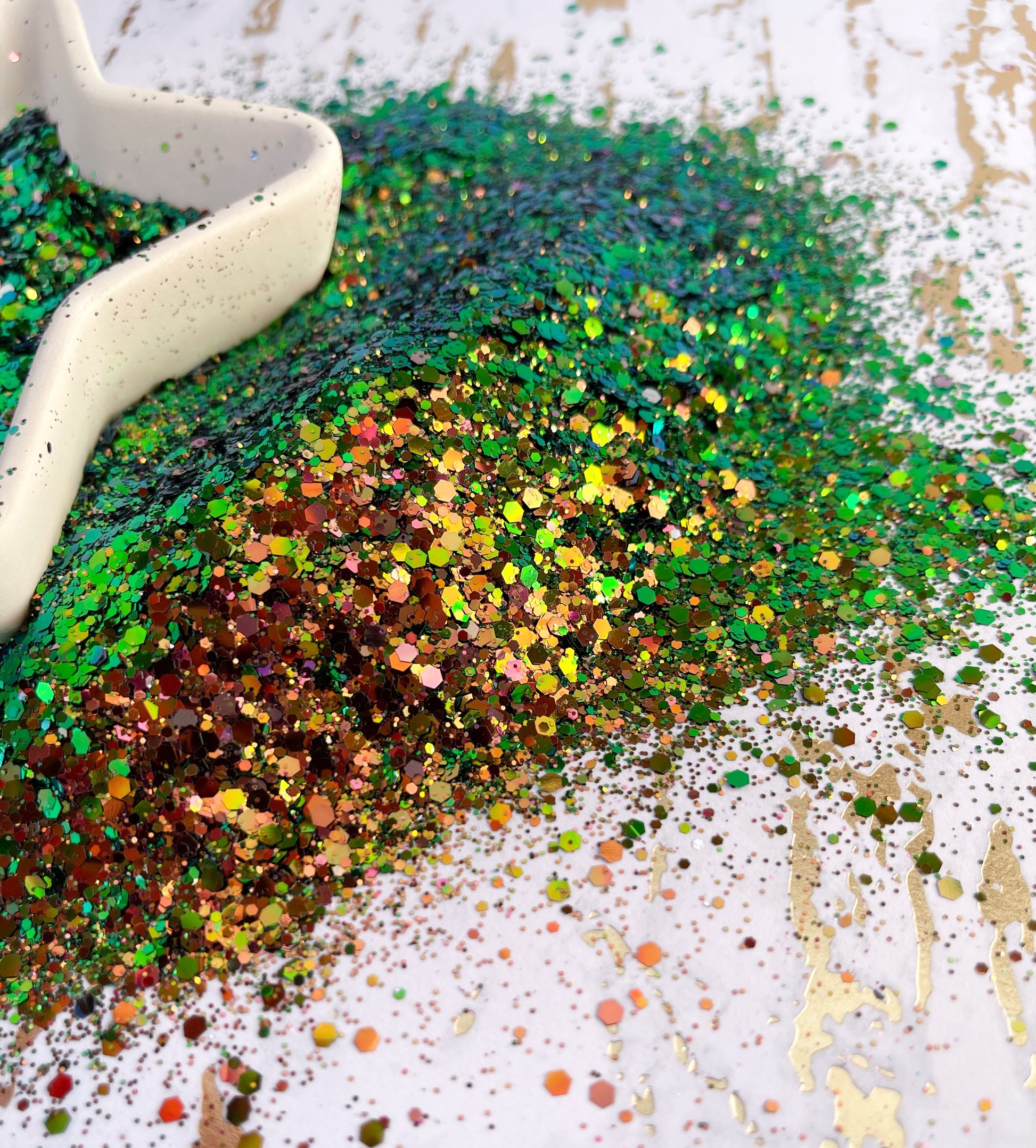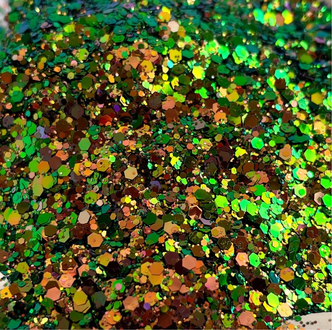 Loch Ness is a beautiful color shifting glitter with vairous sizes. Soft chunky mix. Shifts from bronze to green with a hint of pink. Absolutely gorgeous!