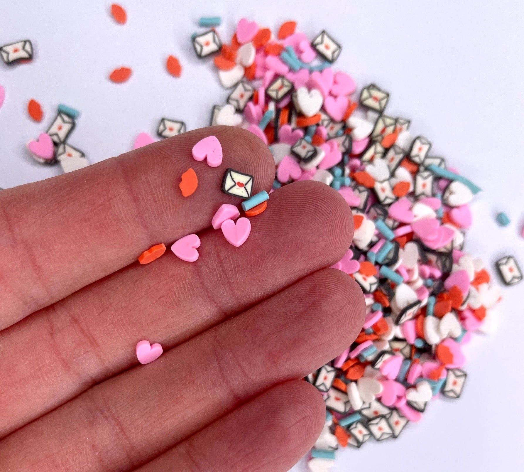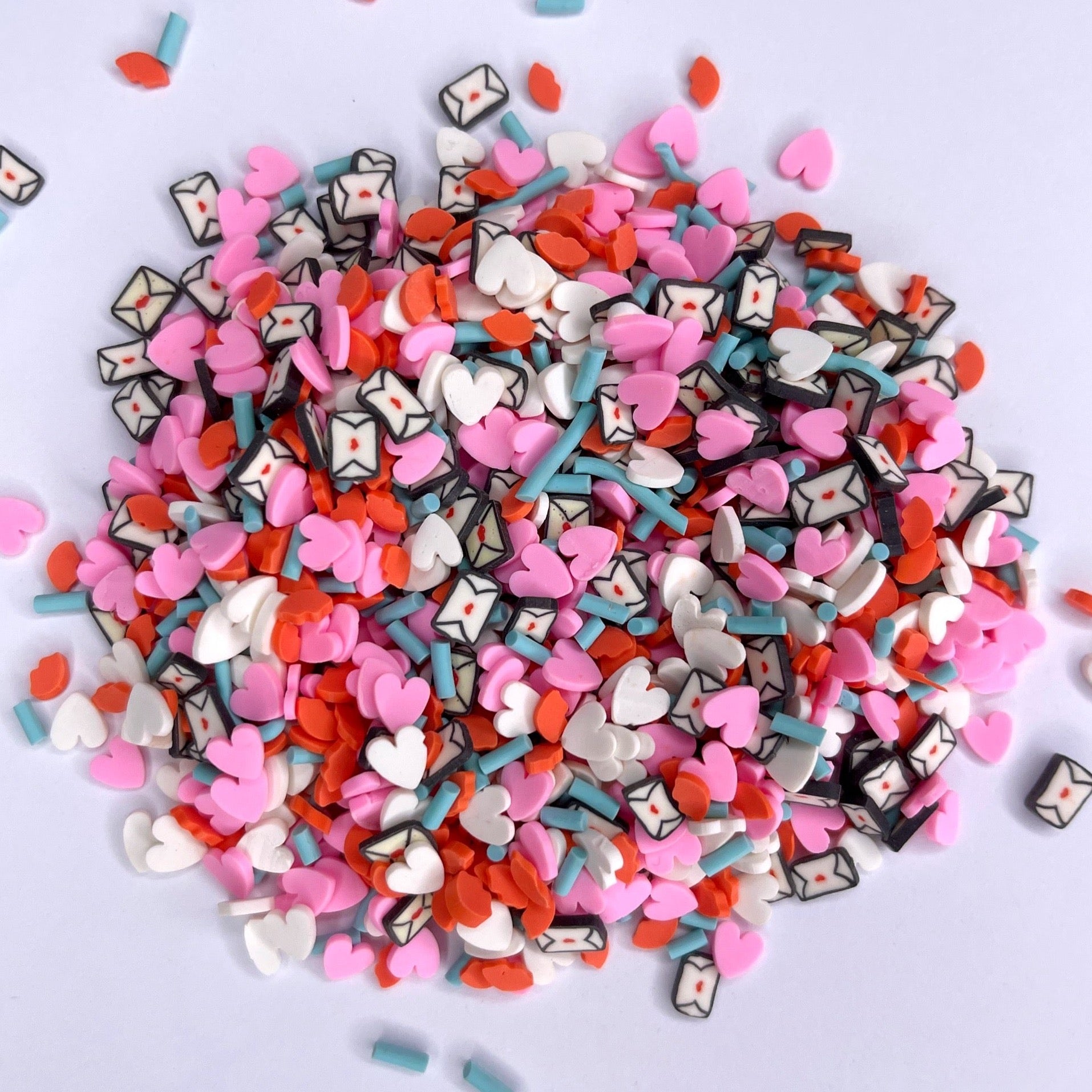 Love letters has white and light pink hearts, lips and letters along with teal sprinkles.