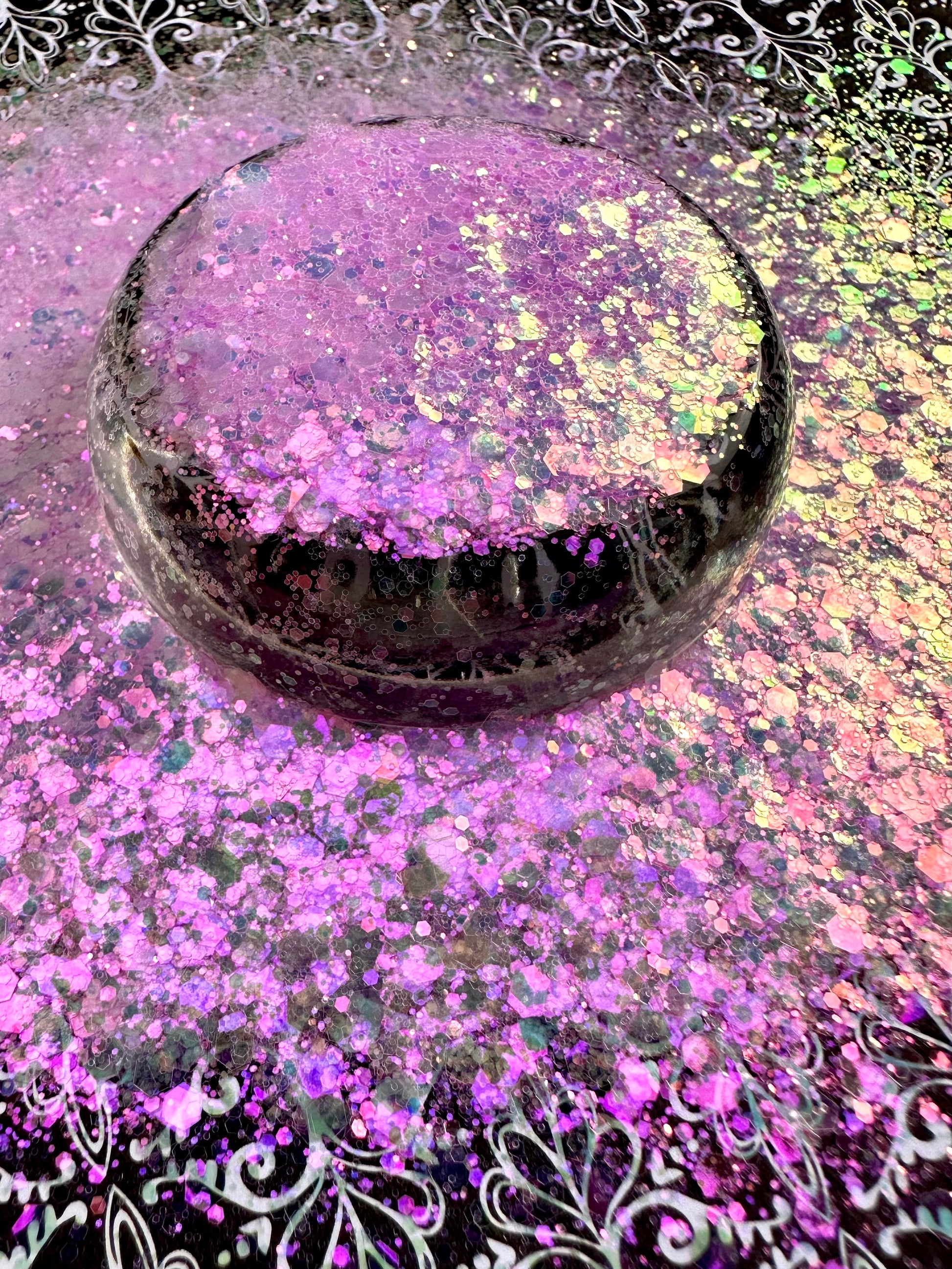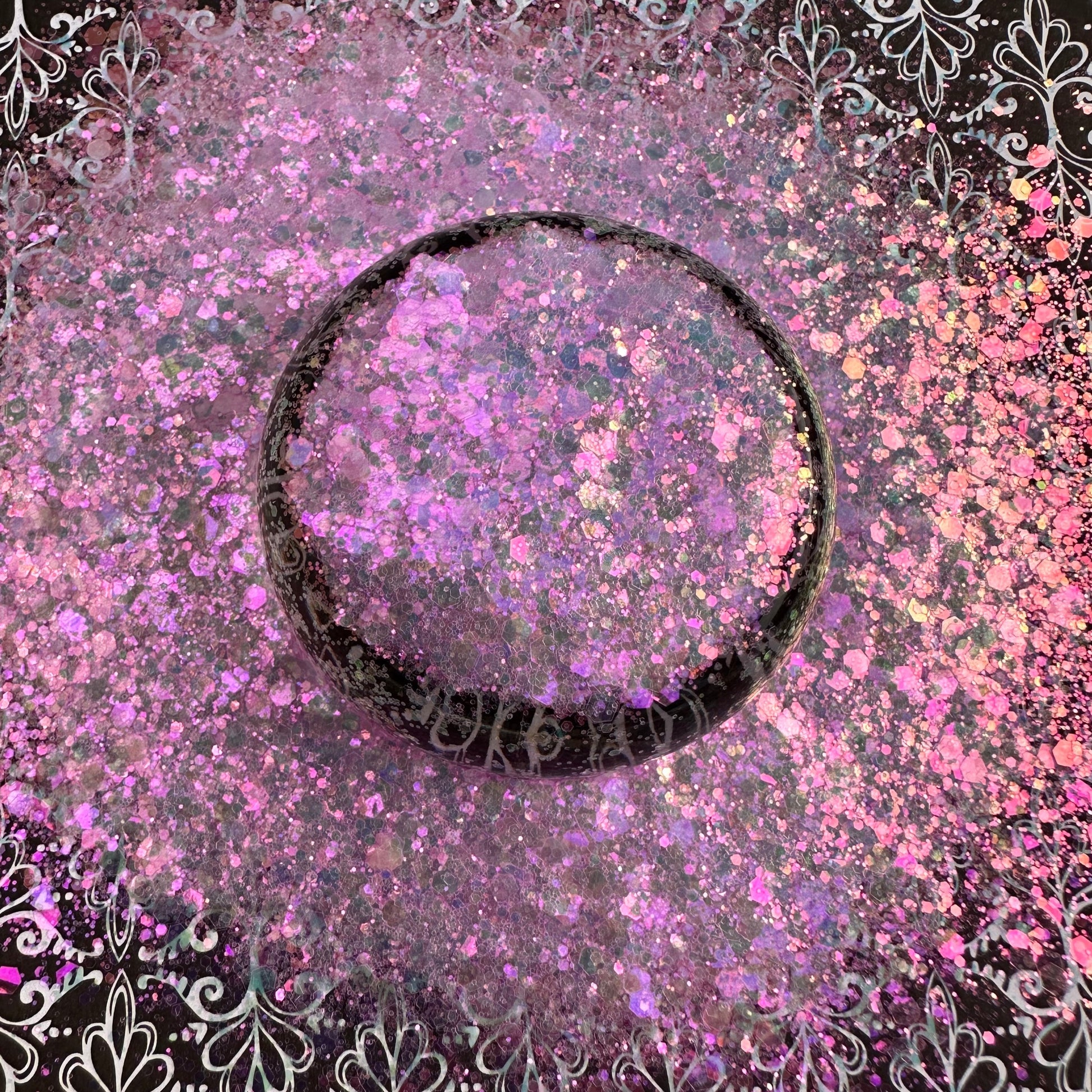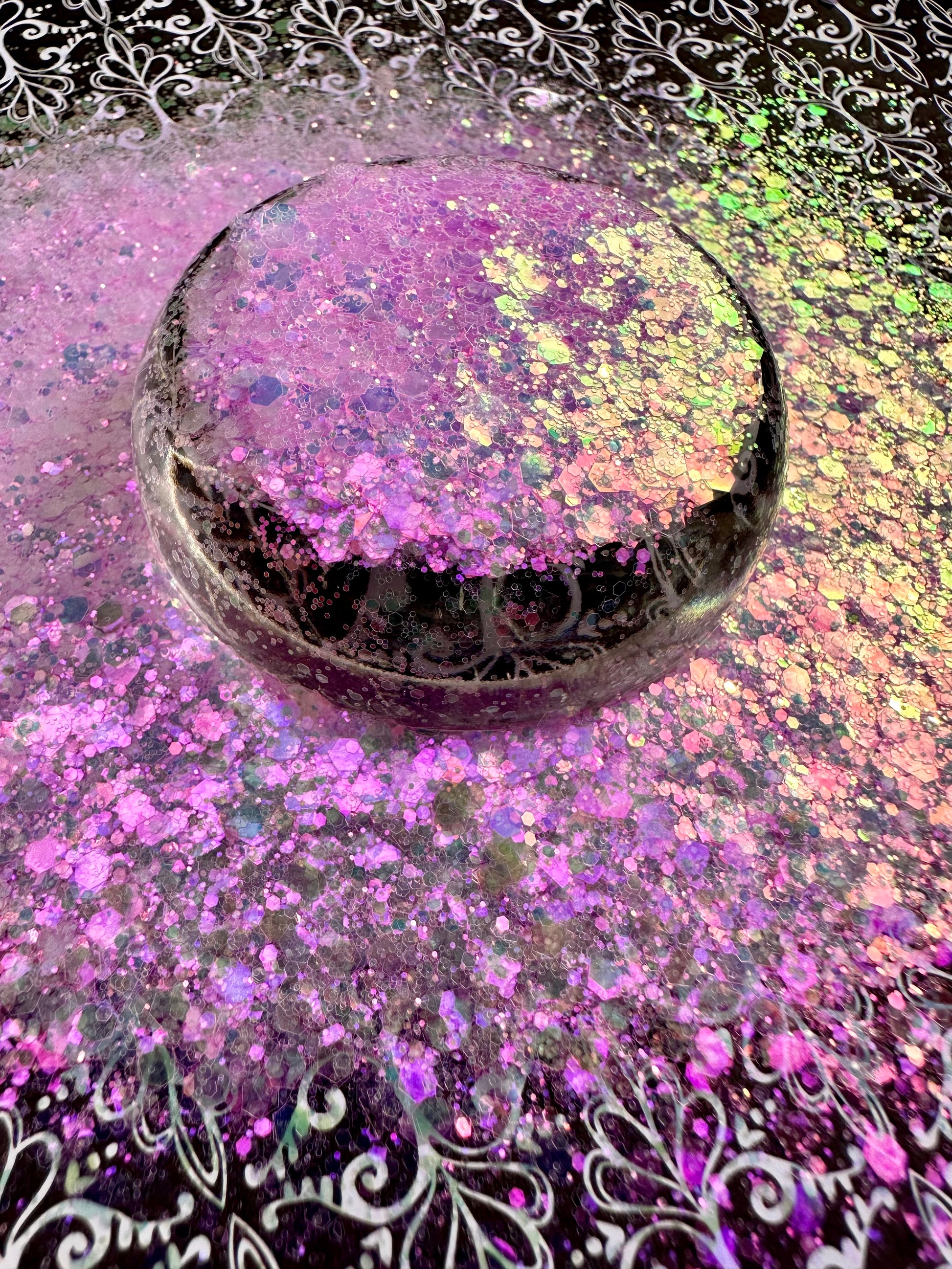 Lyric 2.0. Soft pink chunky mix with a pink iridescence on dark surfaces.