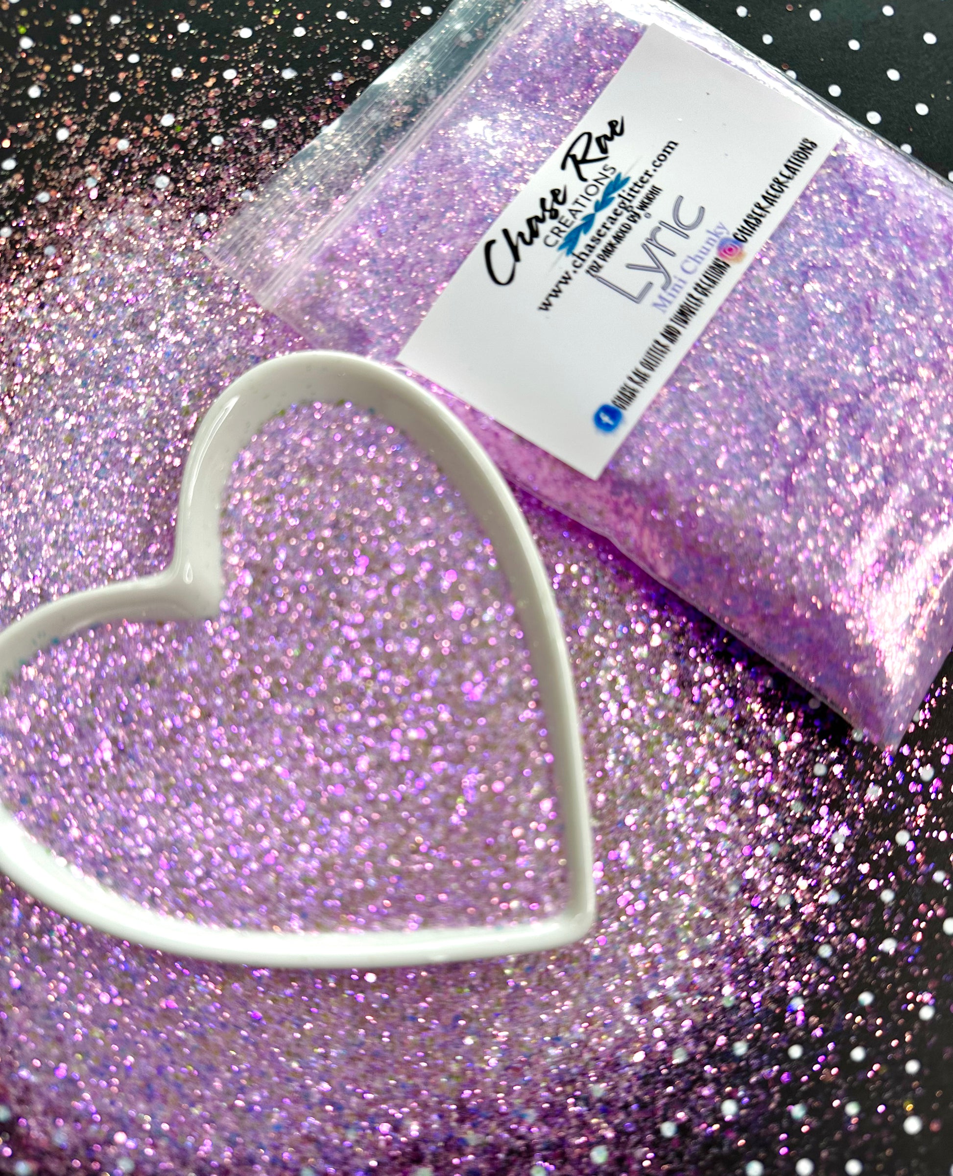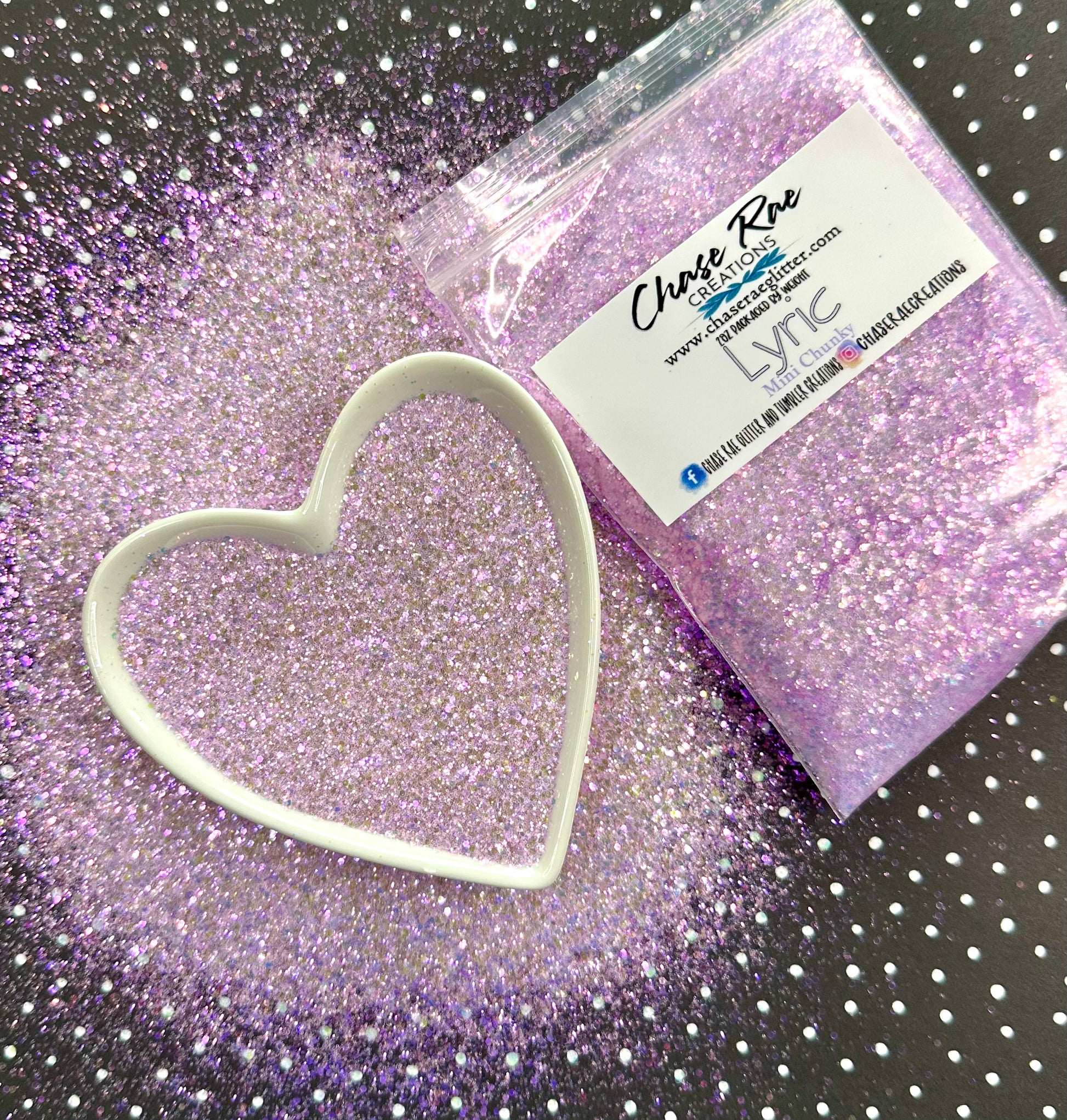 Lyric Mini. Soft, purple, mini chunky mix with a pink iridescence on dark surfaces.