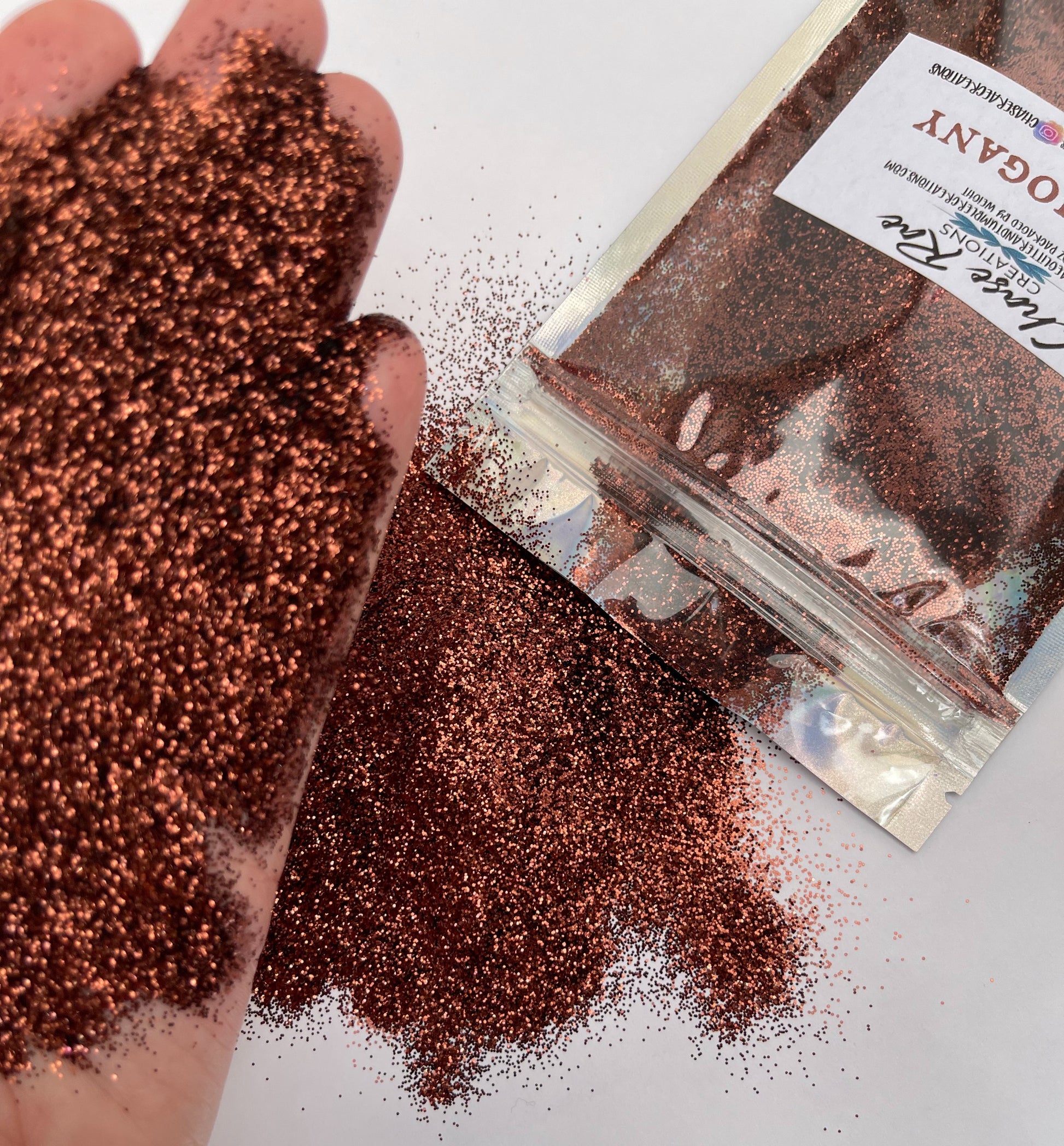 Mahogany is a solid color metallic glitter. Rich, warm, reddish brown. Burnt Umber in color.