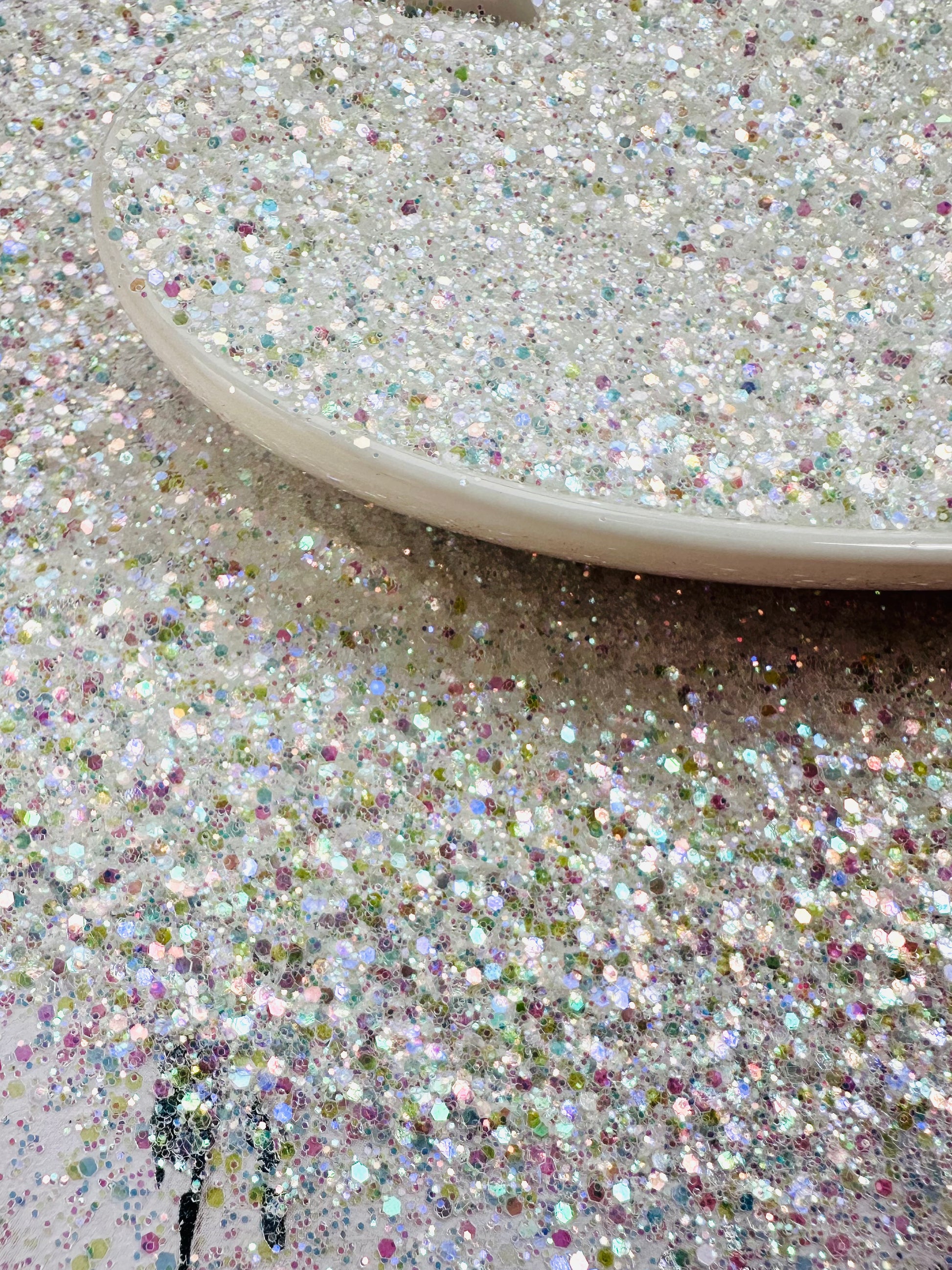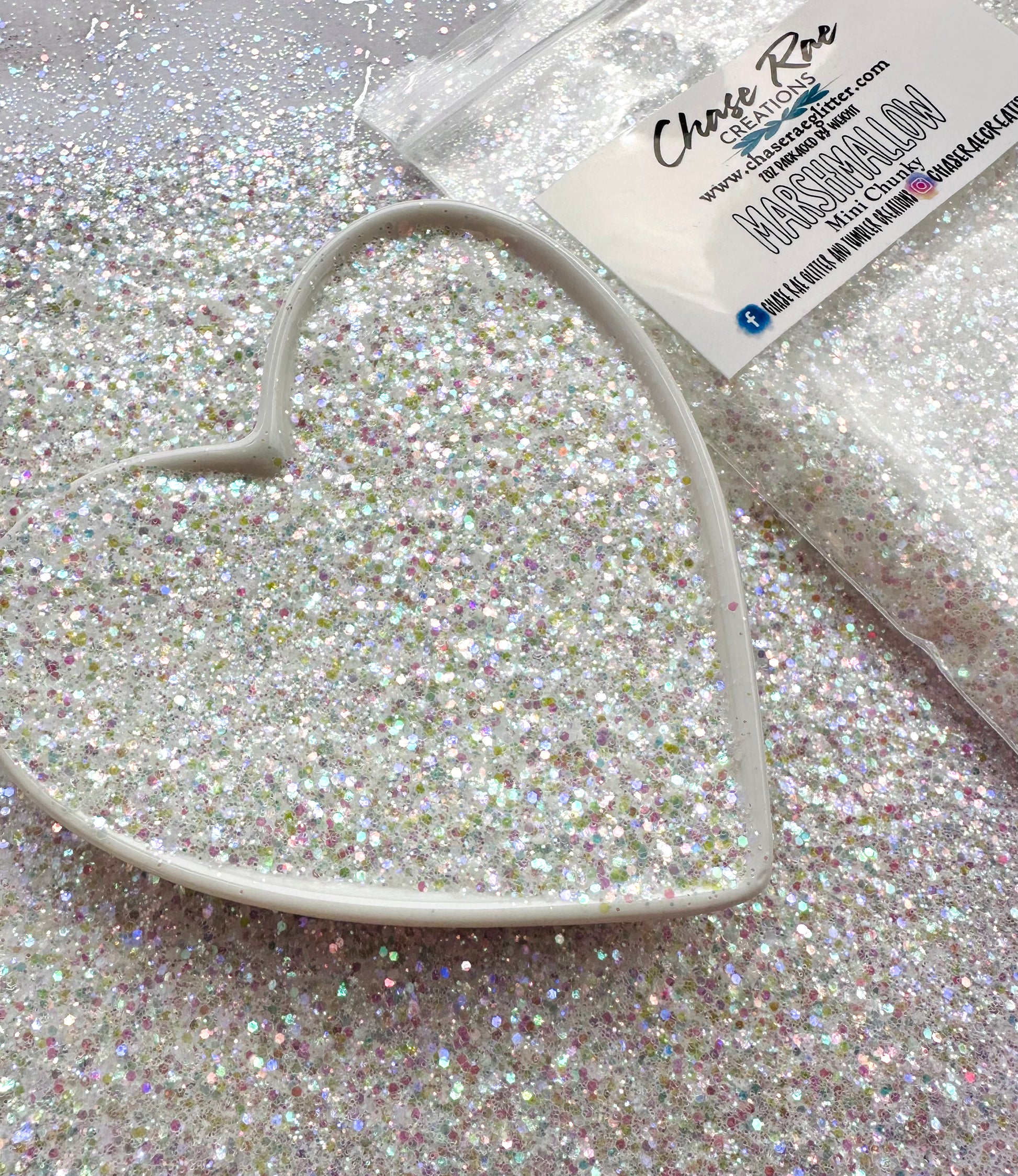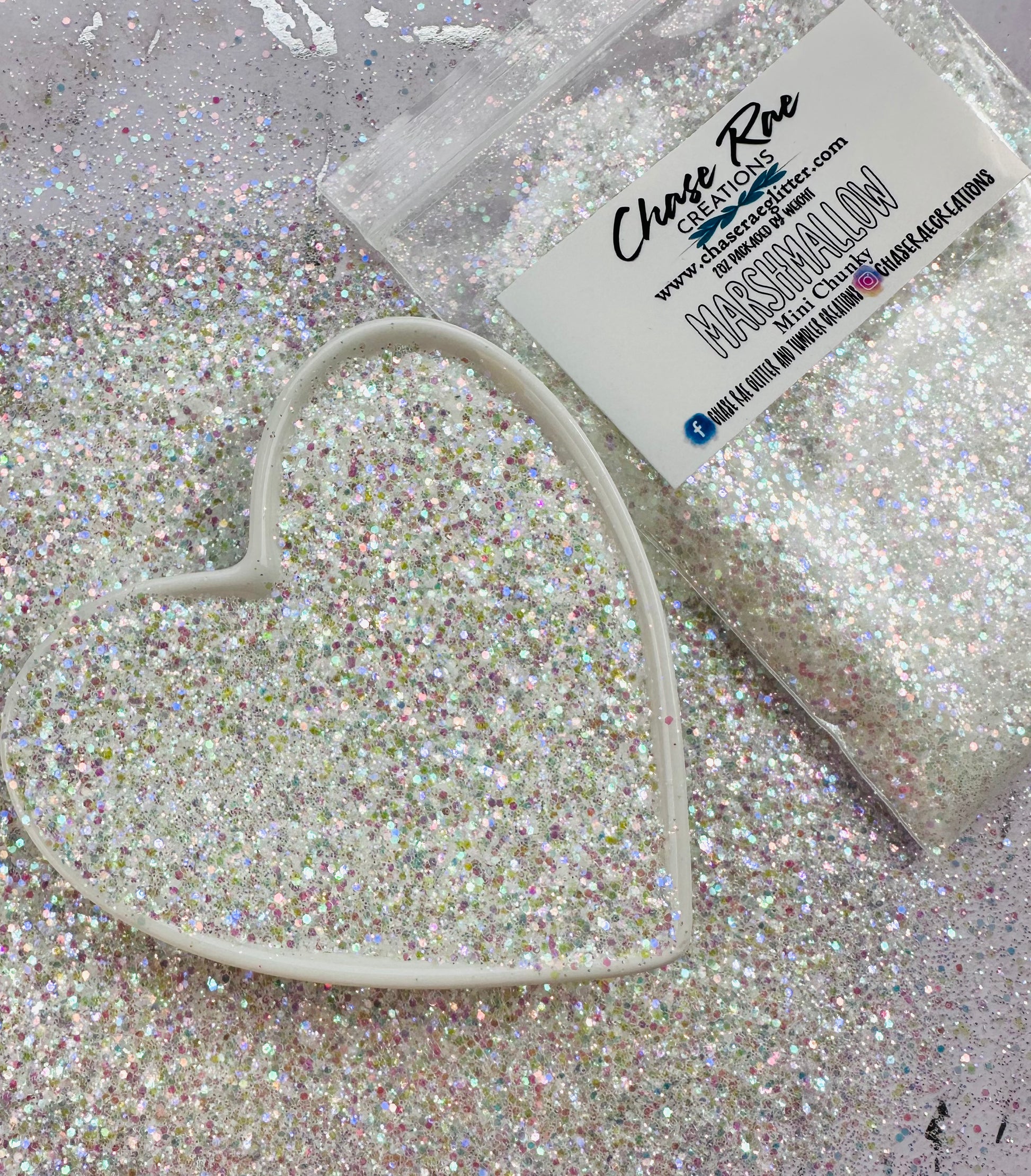 Marshmallow is a mini chunky opal. Semi Translucent rainbow. Put this over any color and you'll have magic!