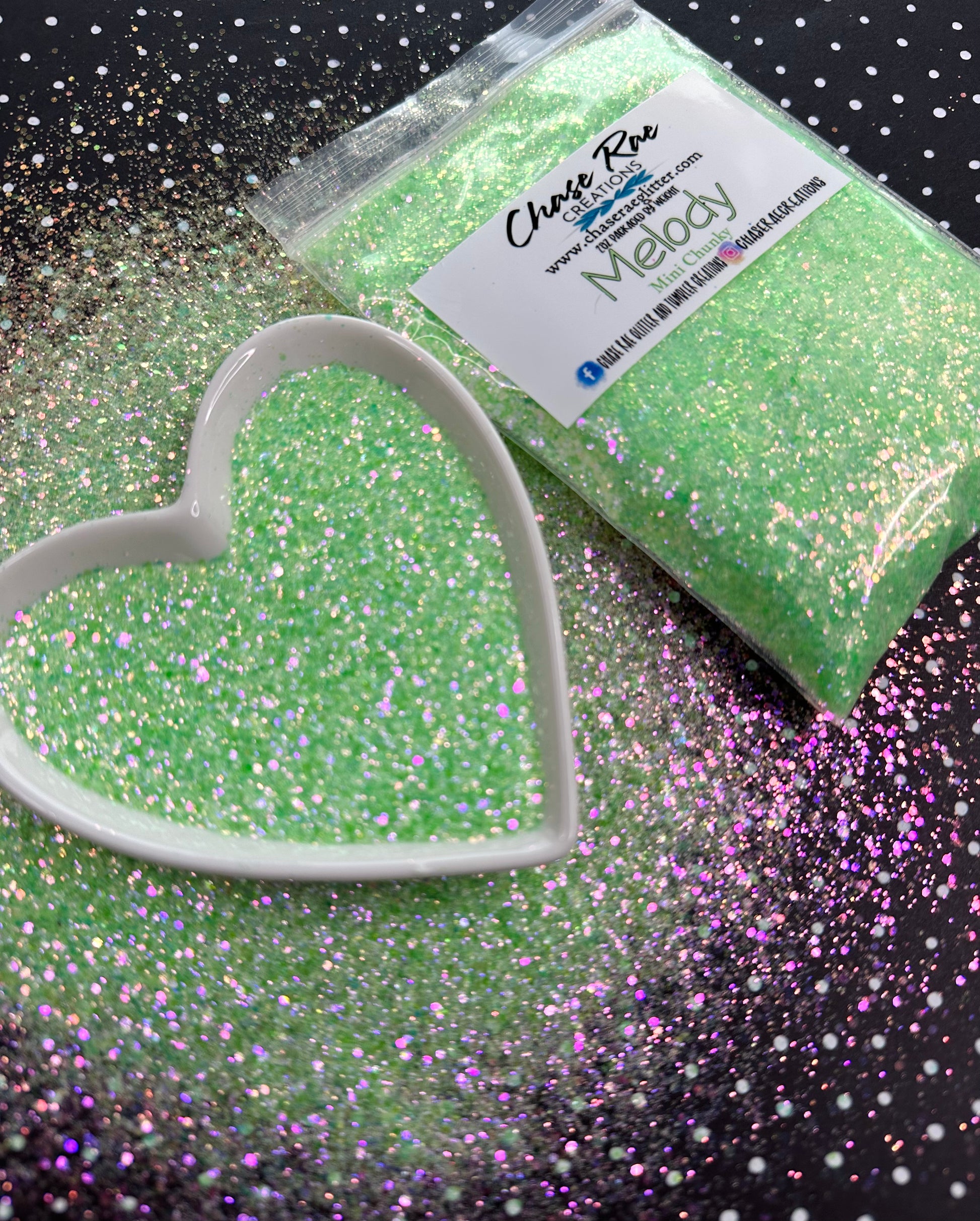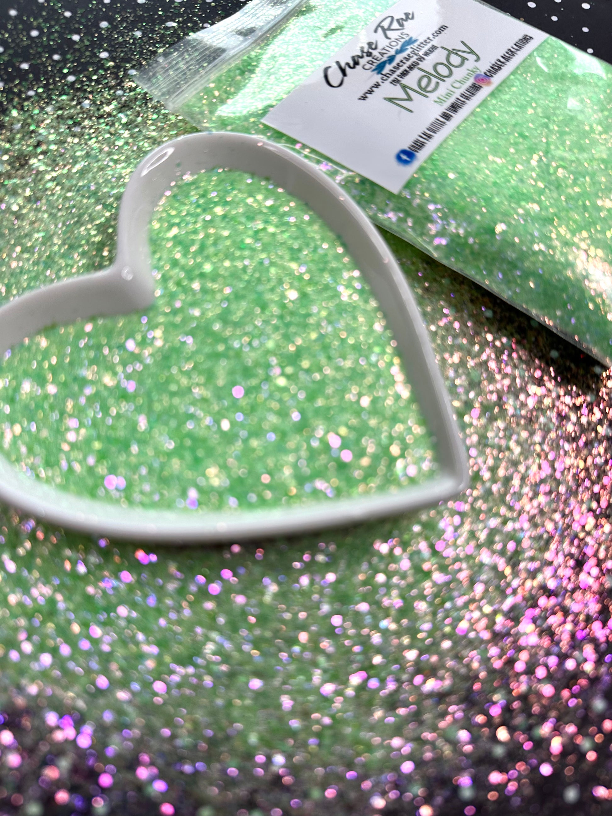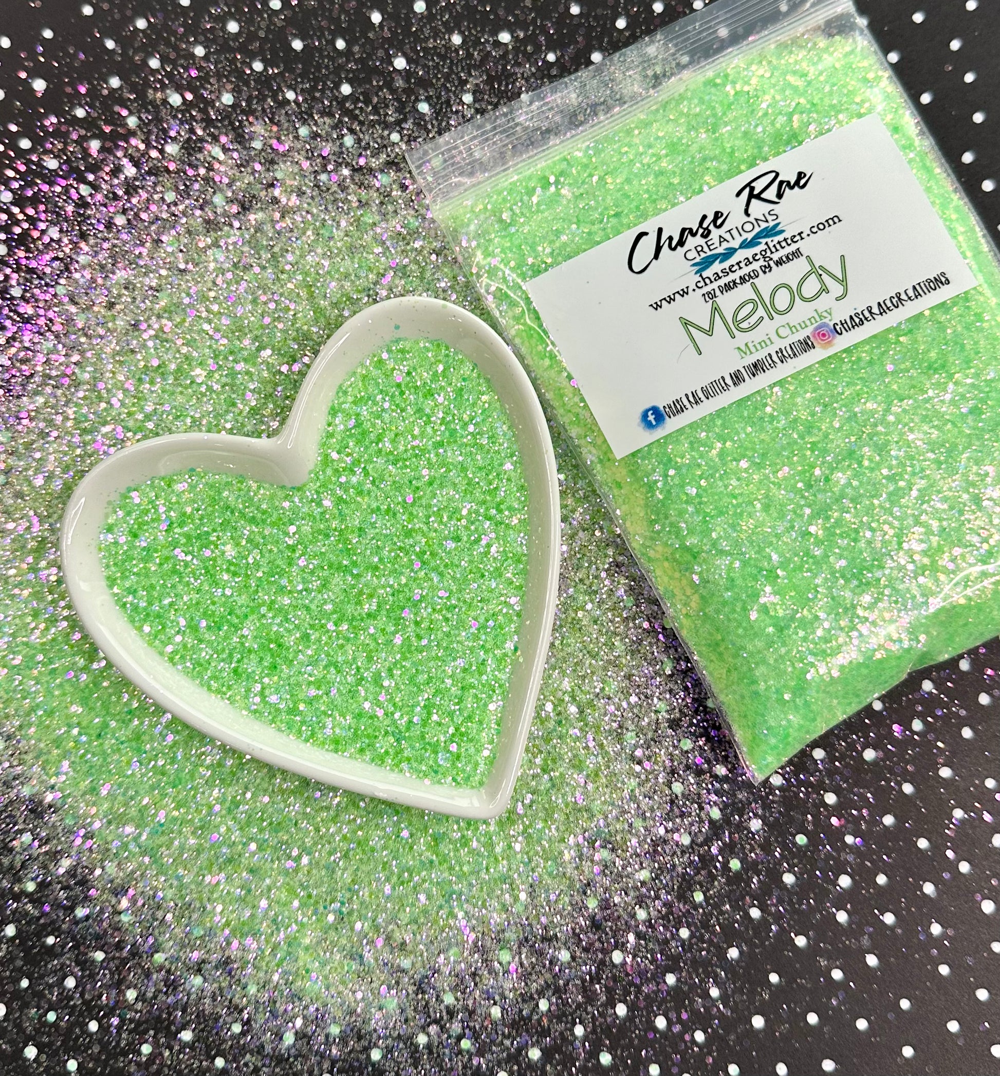 Melody Mini. Soft, green mini chunky mix with a pink iridescence on dark surfaces.