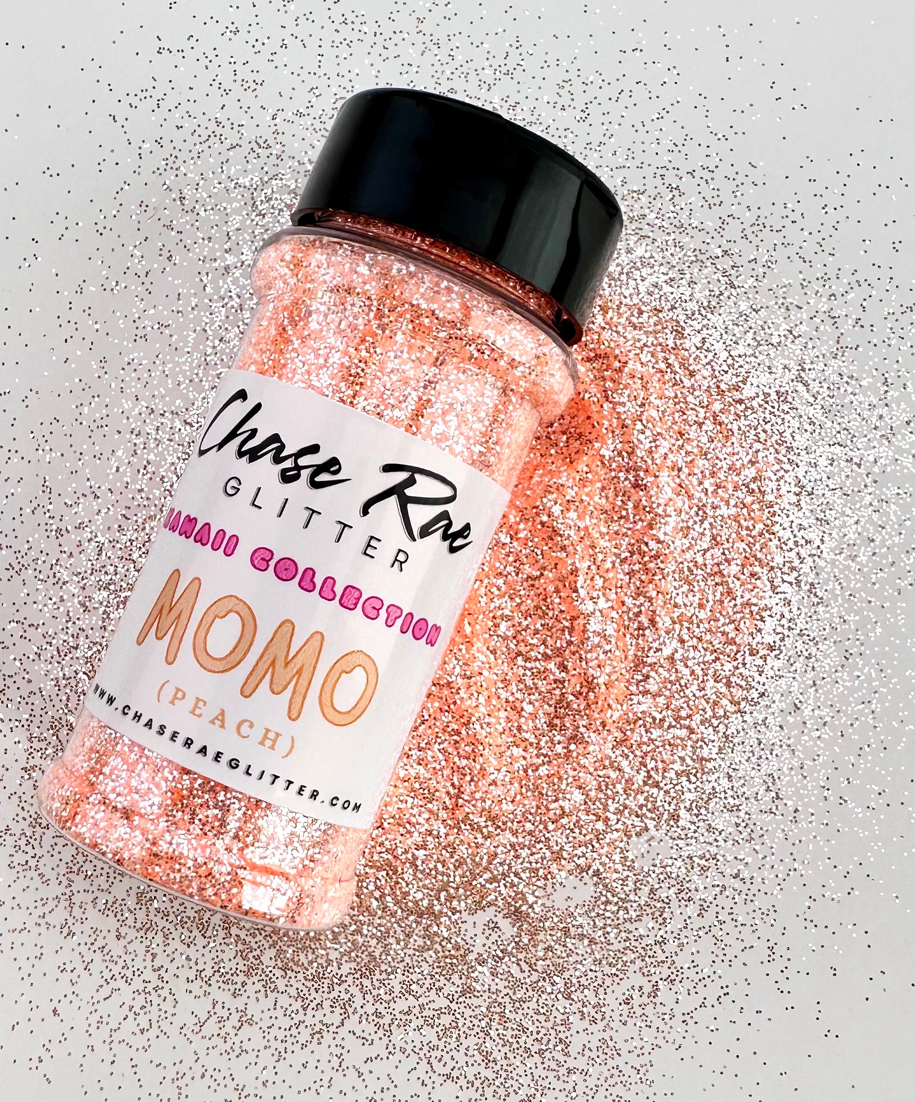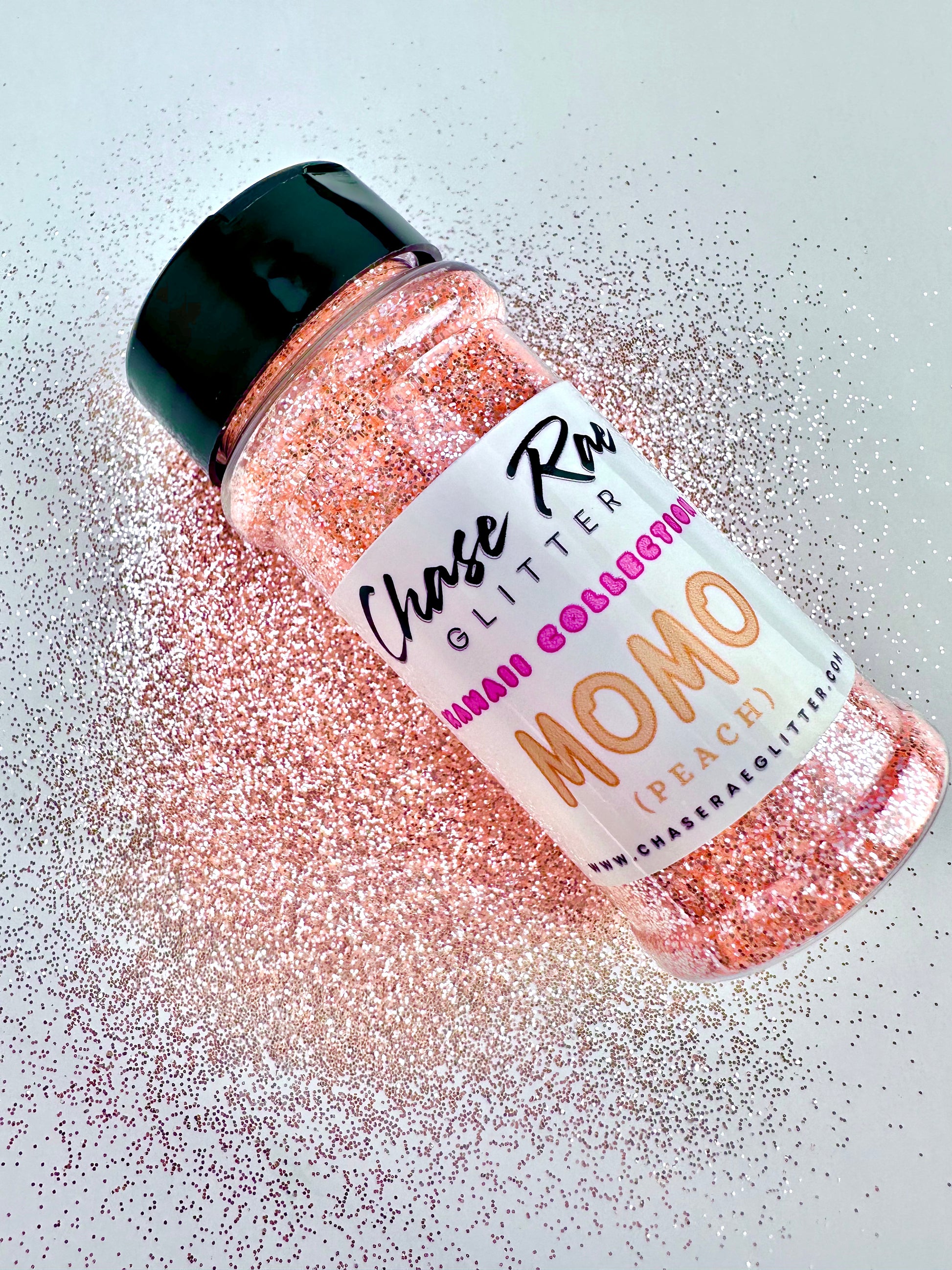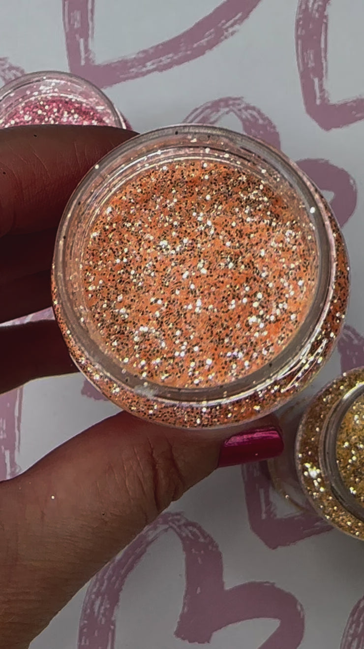 Momo is a superior, high sparkle, glitter. The cutest peach color, and sparkles like specks of diamonds. Pastel Orange. Has a mirror effect. Part of the Kawaii Collection