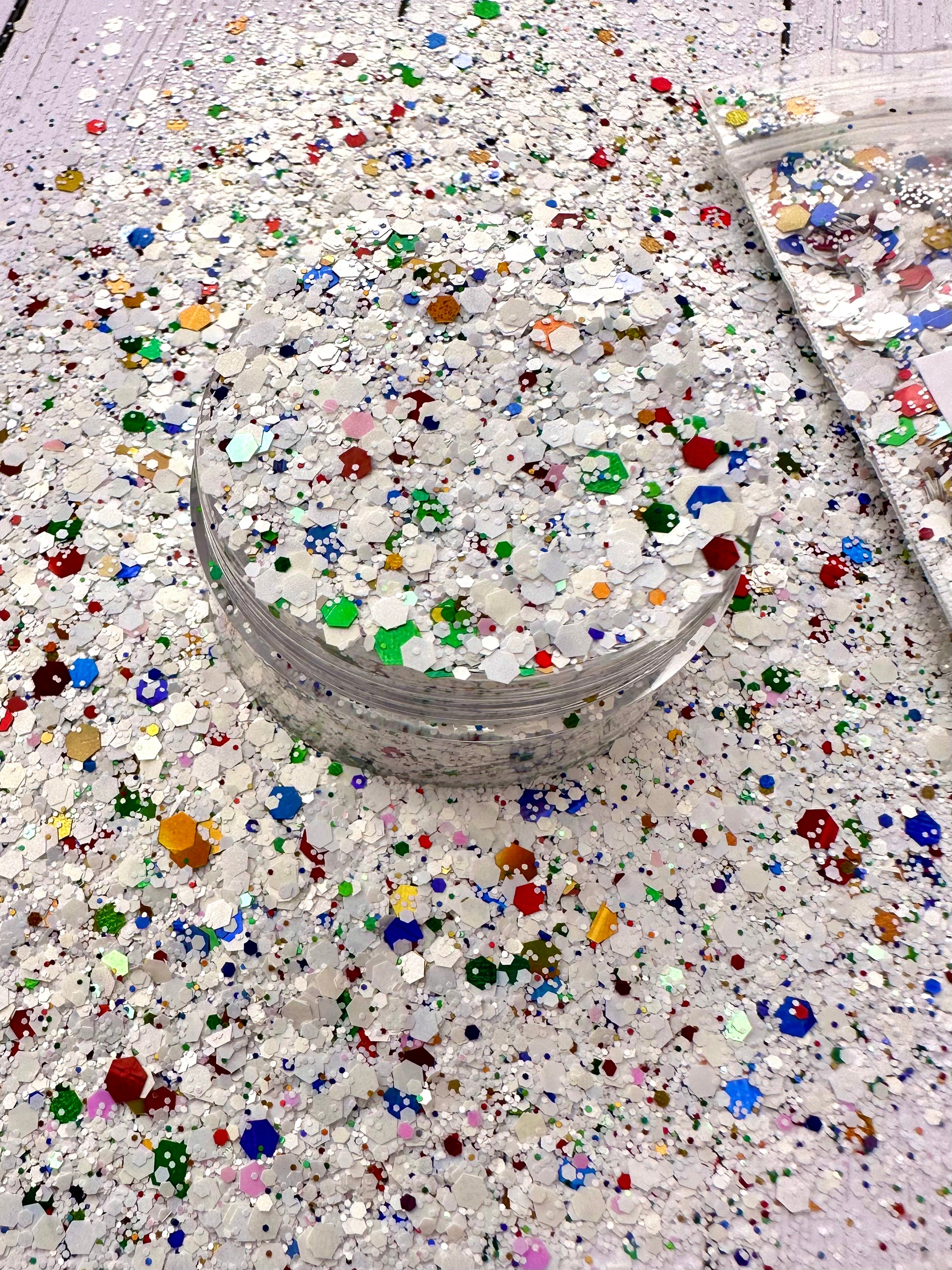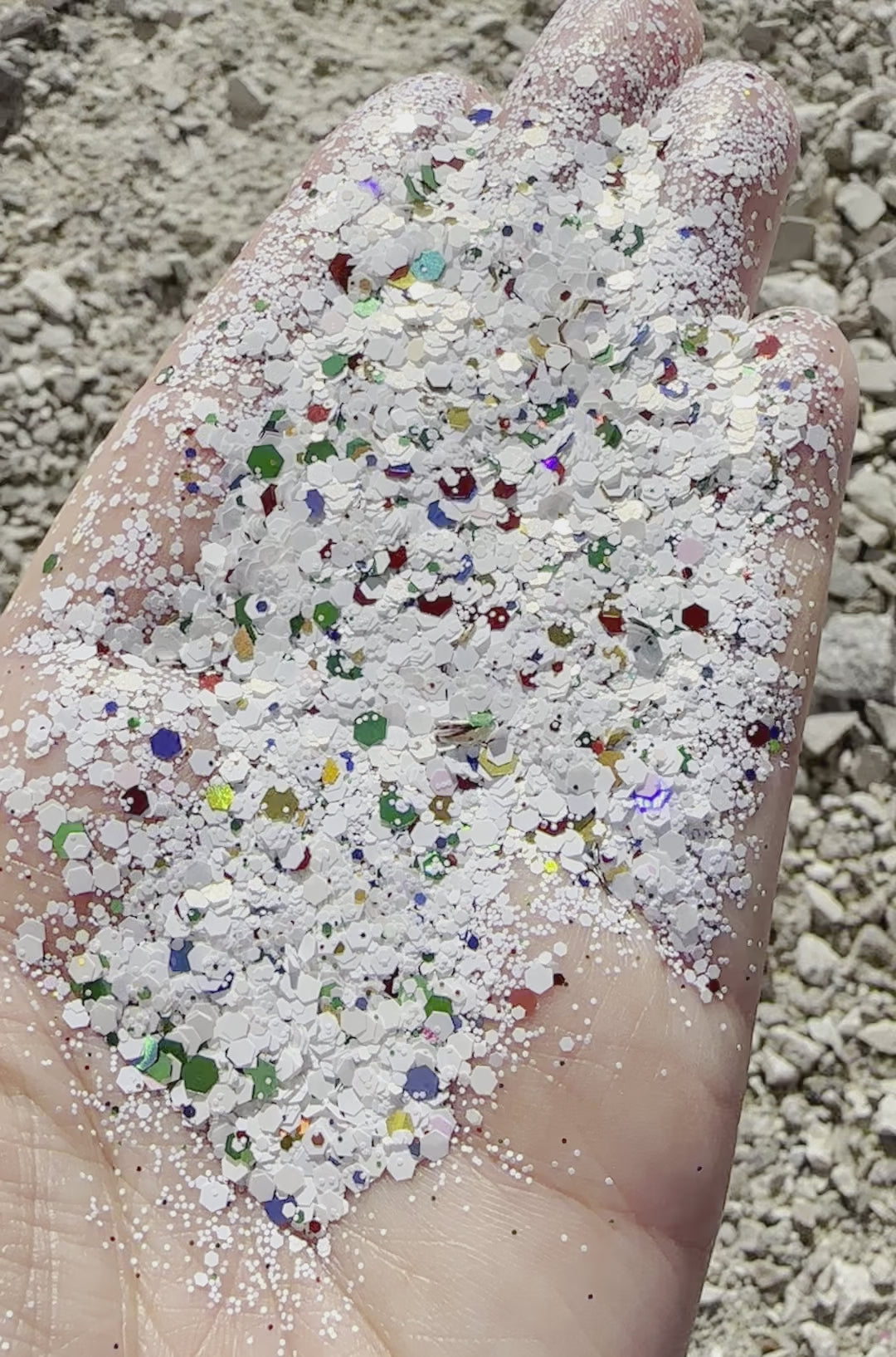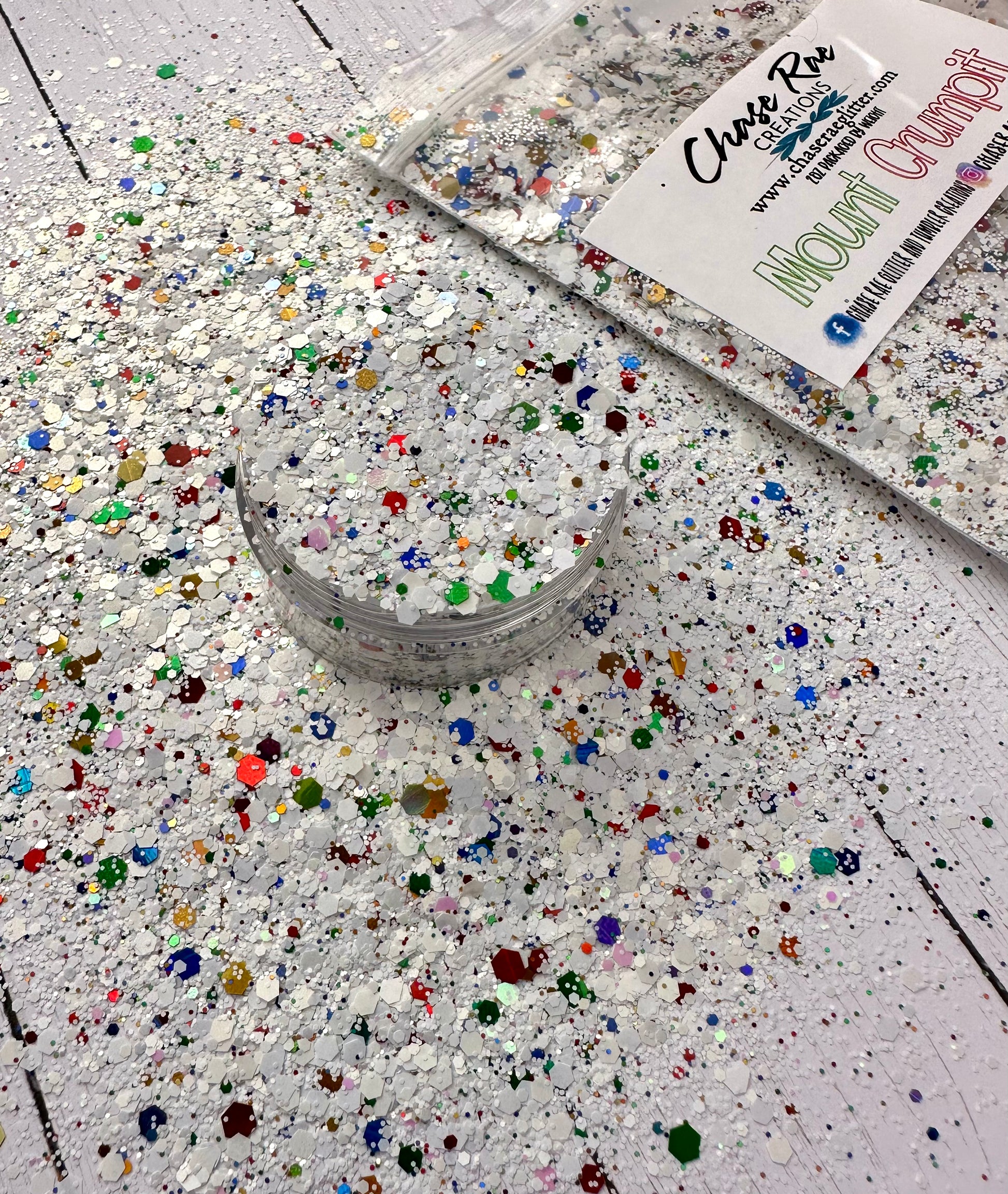 Mount Crumpit is a great mix that reminds me of Christmas lights! Solid pearl white with blue, red, yellow and green pieces.