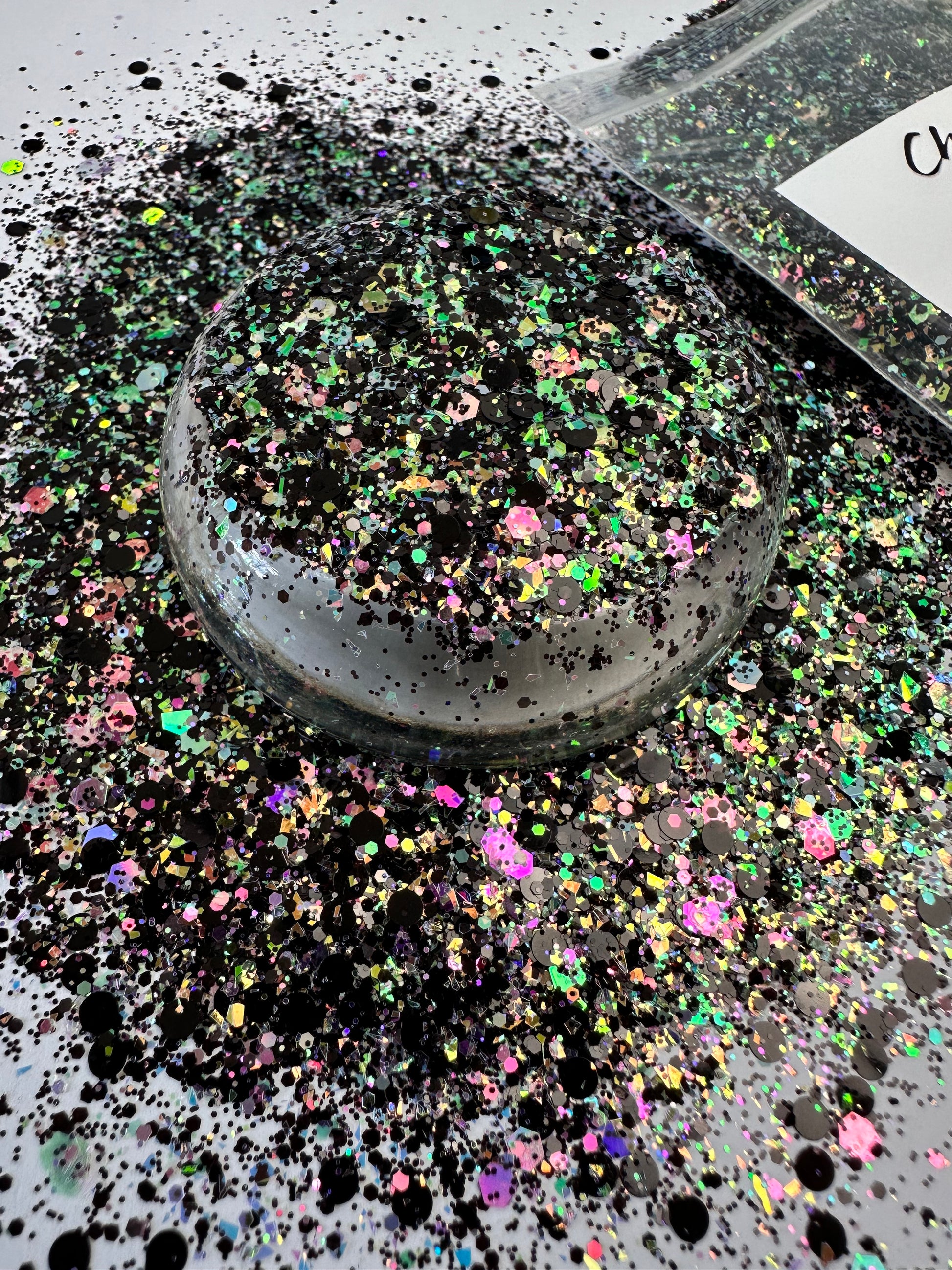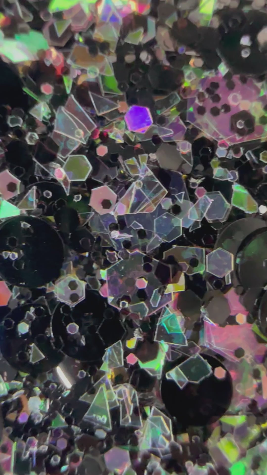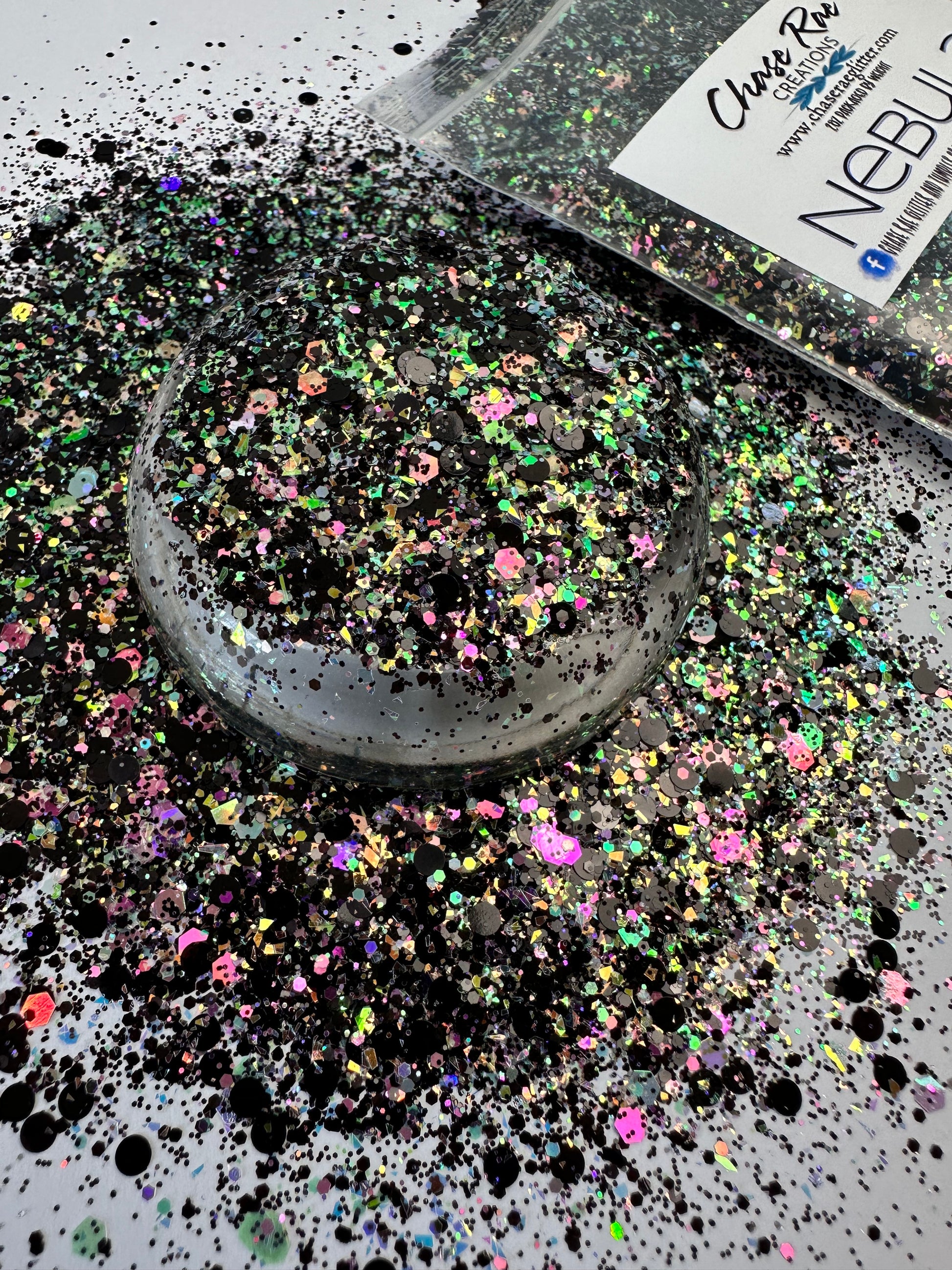 Nebula is a multi-size and shape glitter. Black with a shifty opal that pulls pinks, greens, purples.