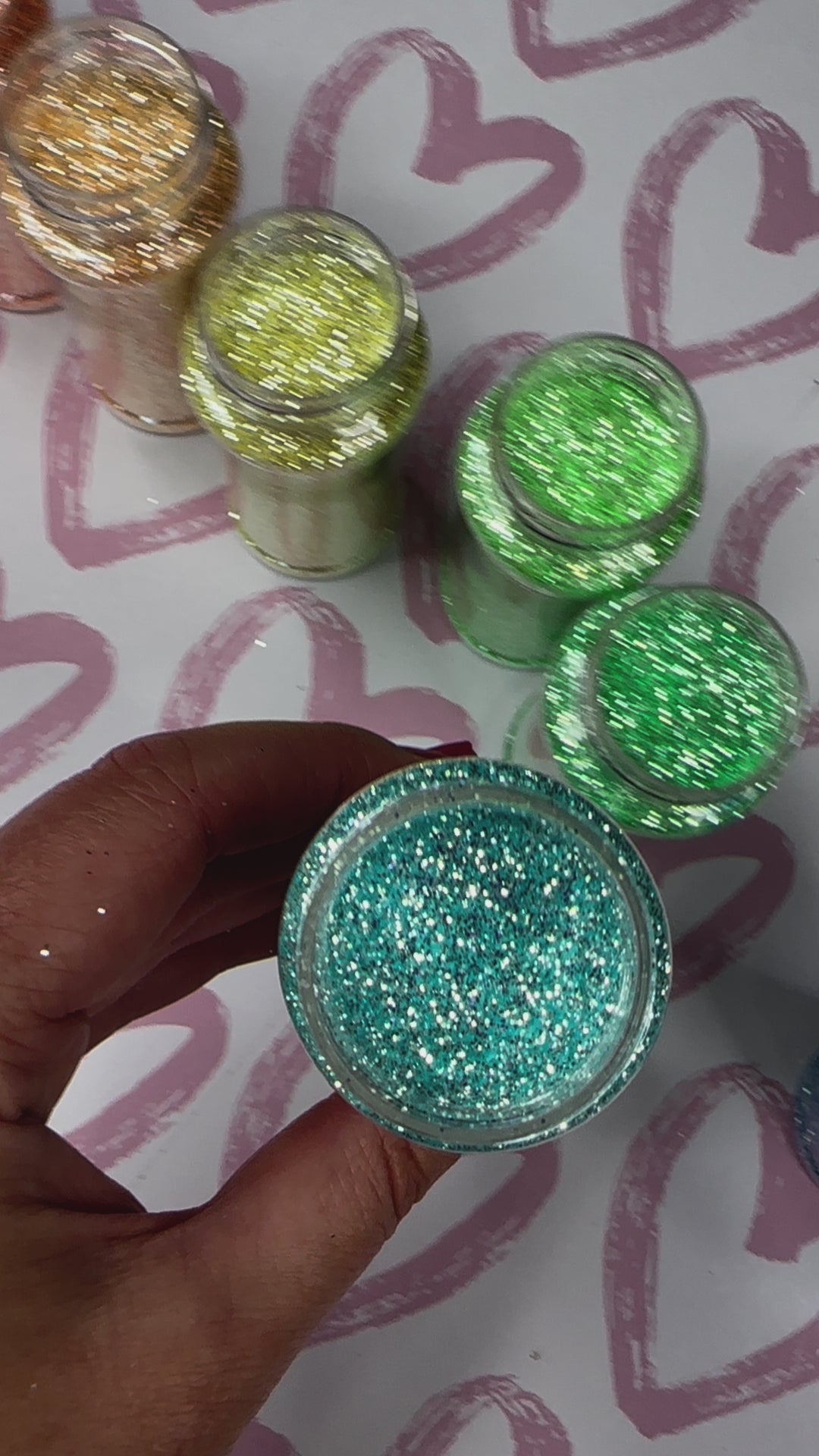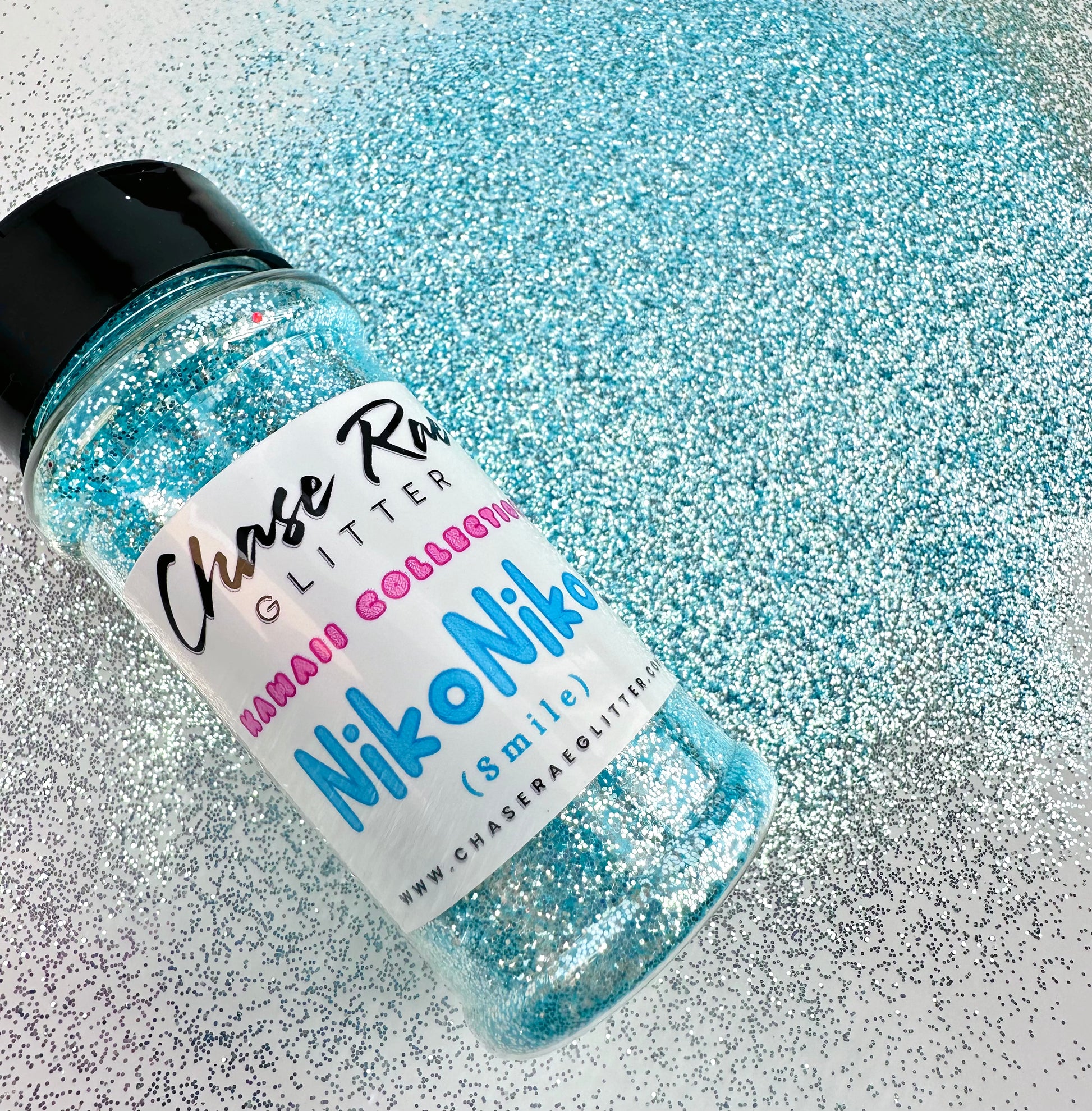 Niko Niko is a superior, high sparkle, glitter. The cutest aqua blue color, and sparkles like specks of diamonds. Has a mirror effect. Part of the Kawaii Collection
