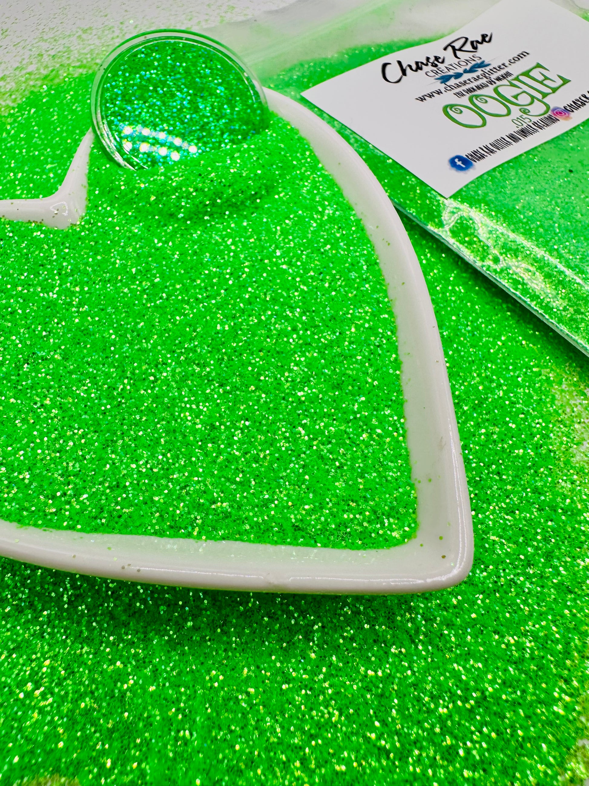 Oogie is a neon, high sparkling, green glitter.
