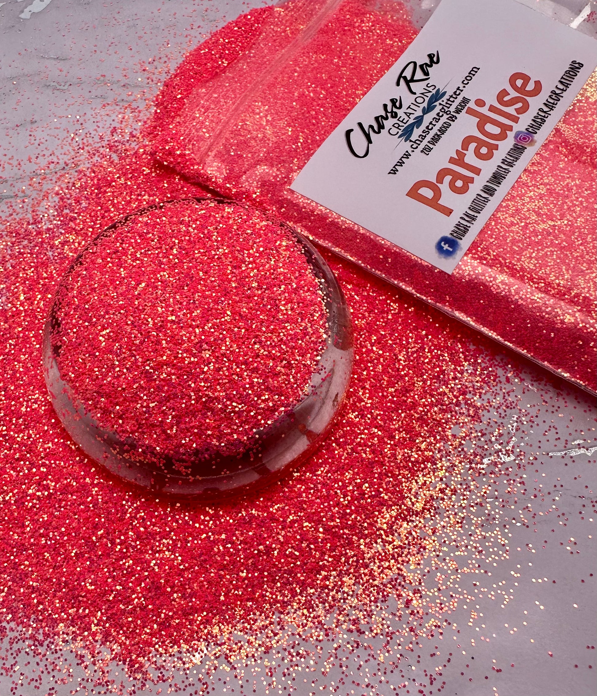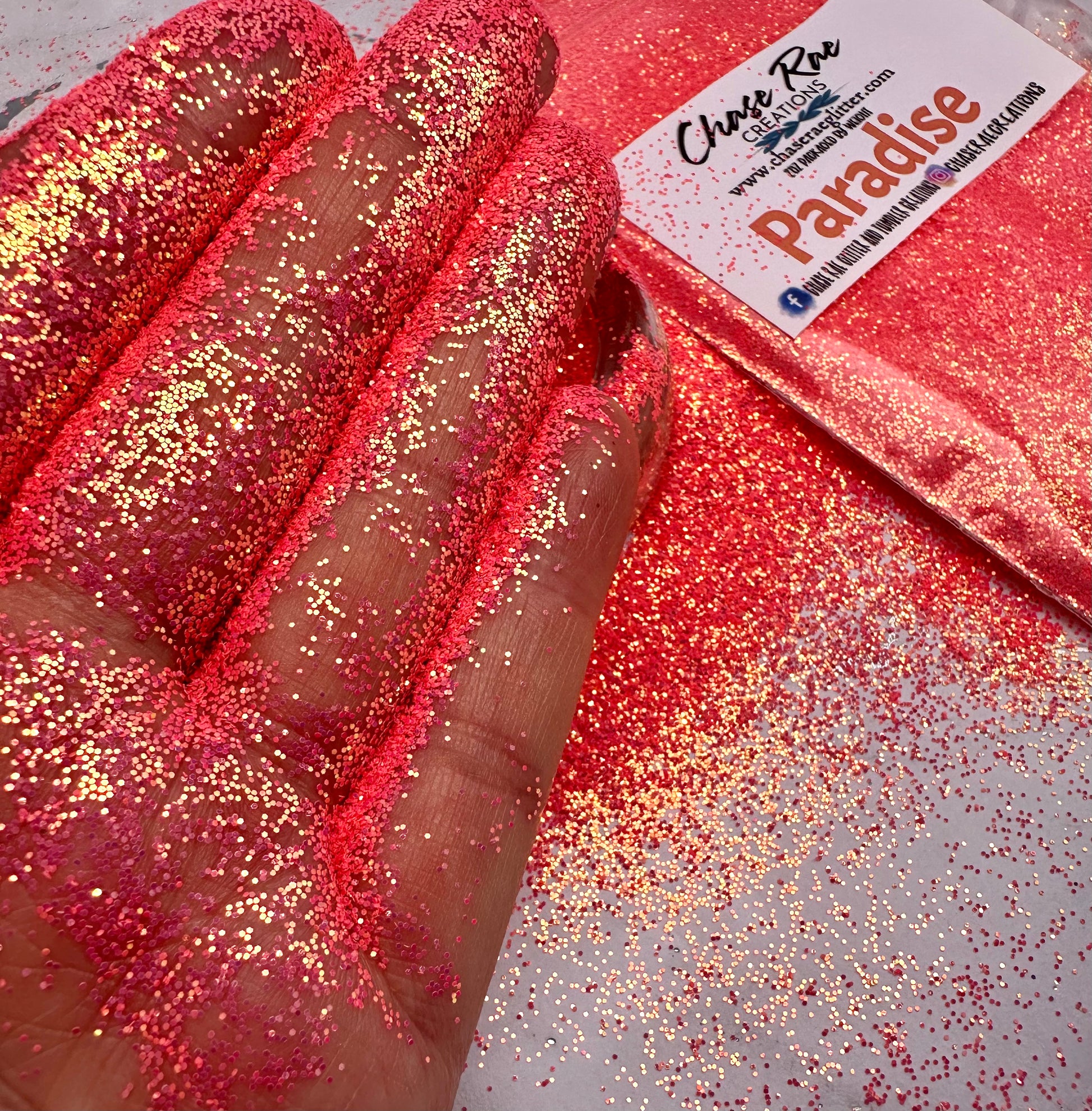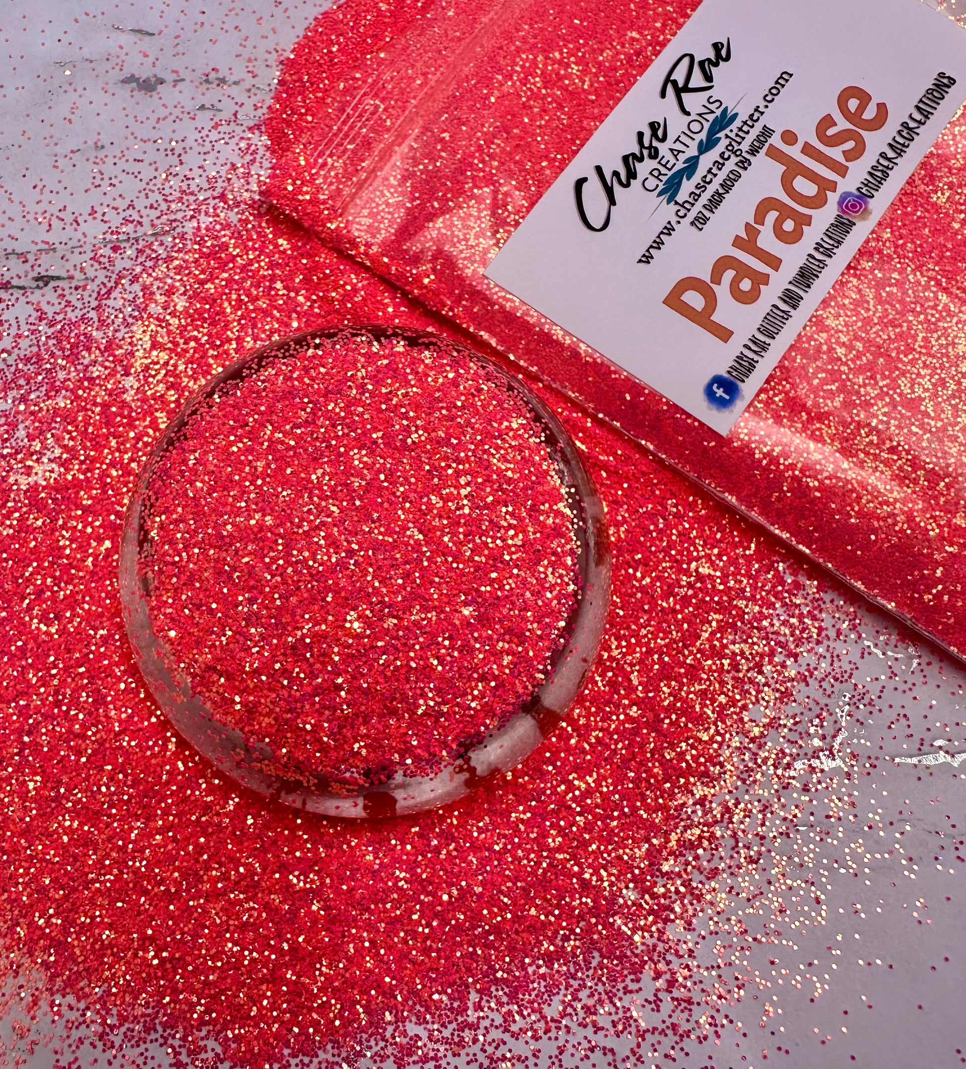 Paradise is a gorgeous bright coral orange glitter. Iridescent, but not translucent.