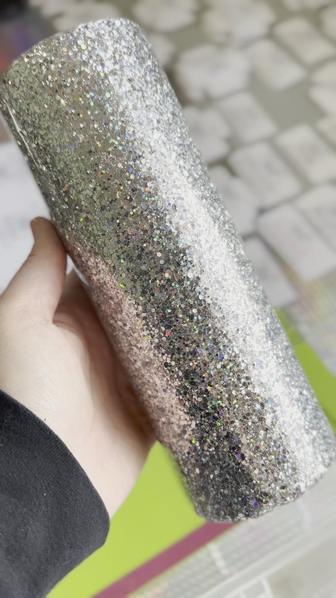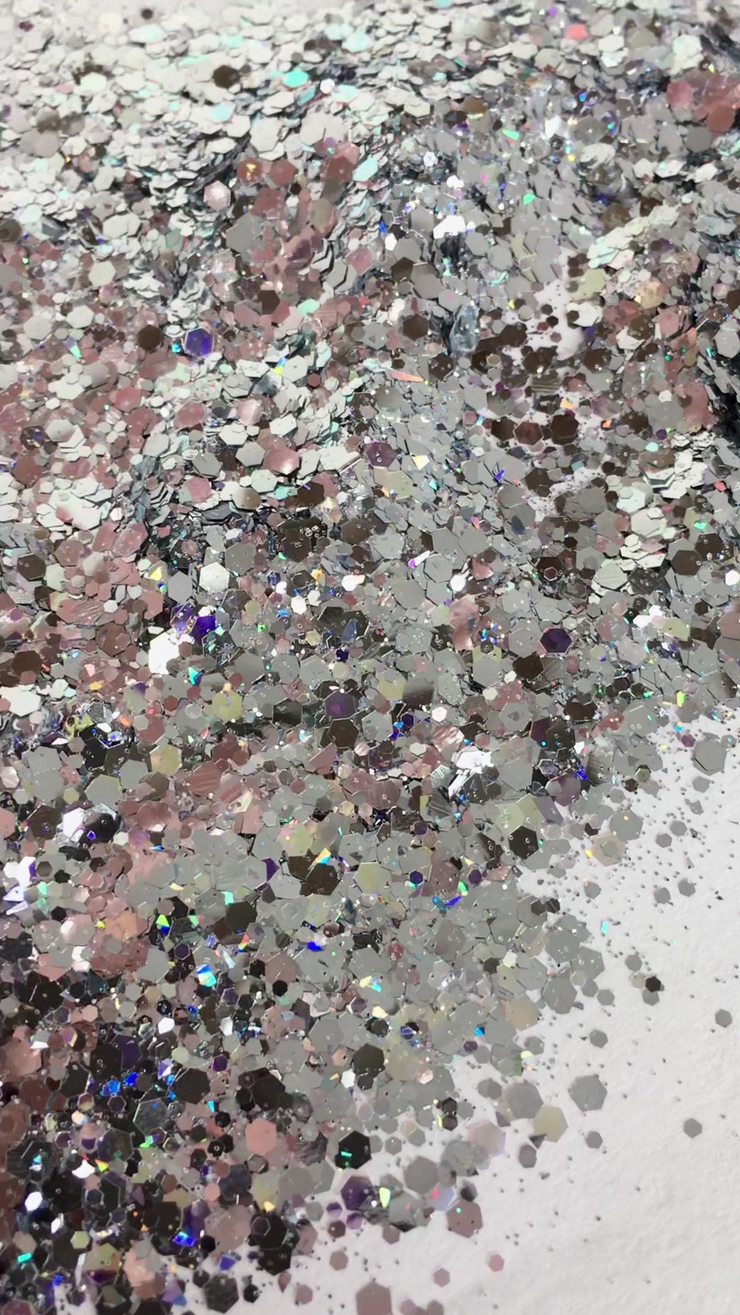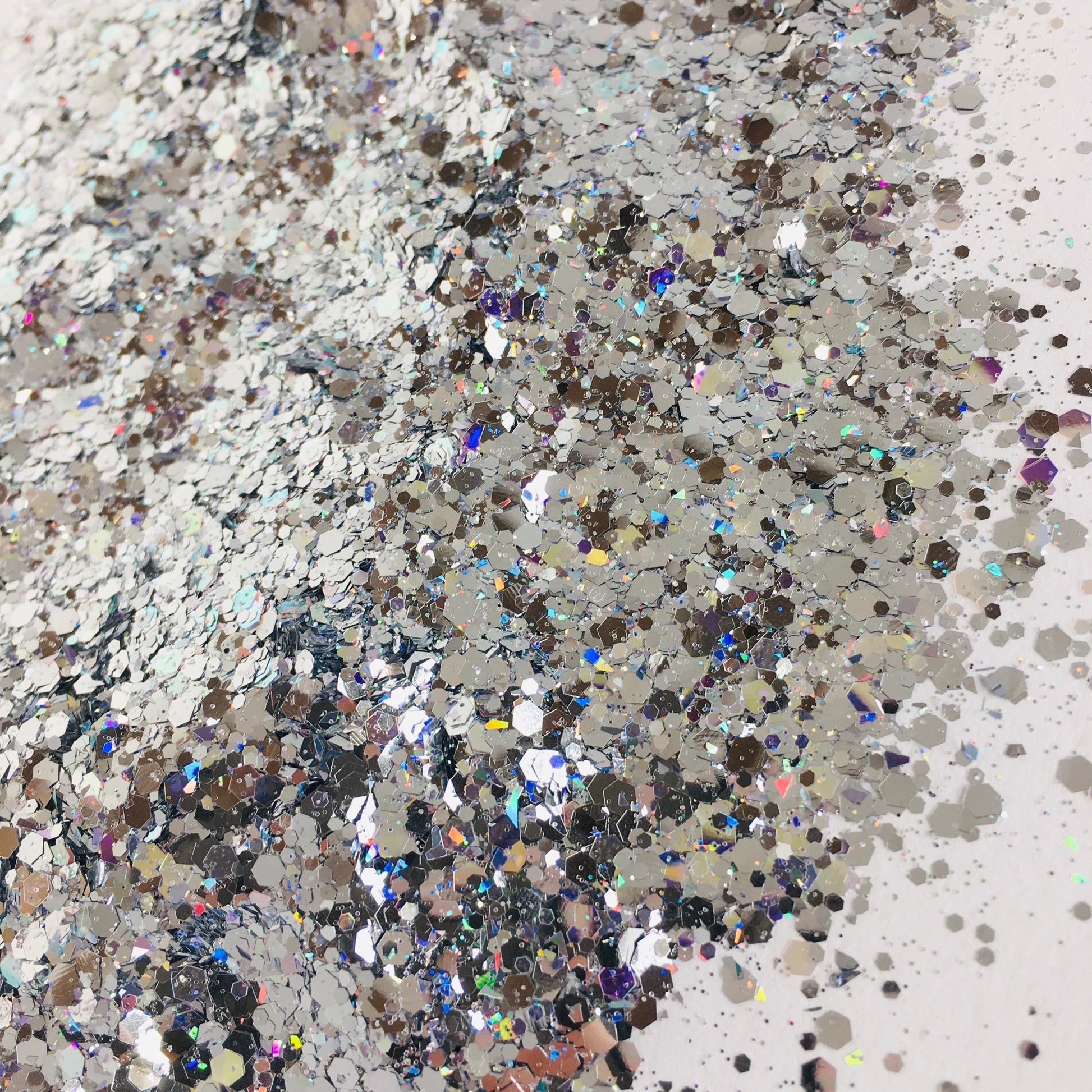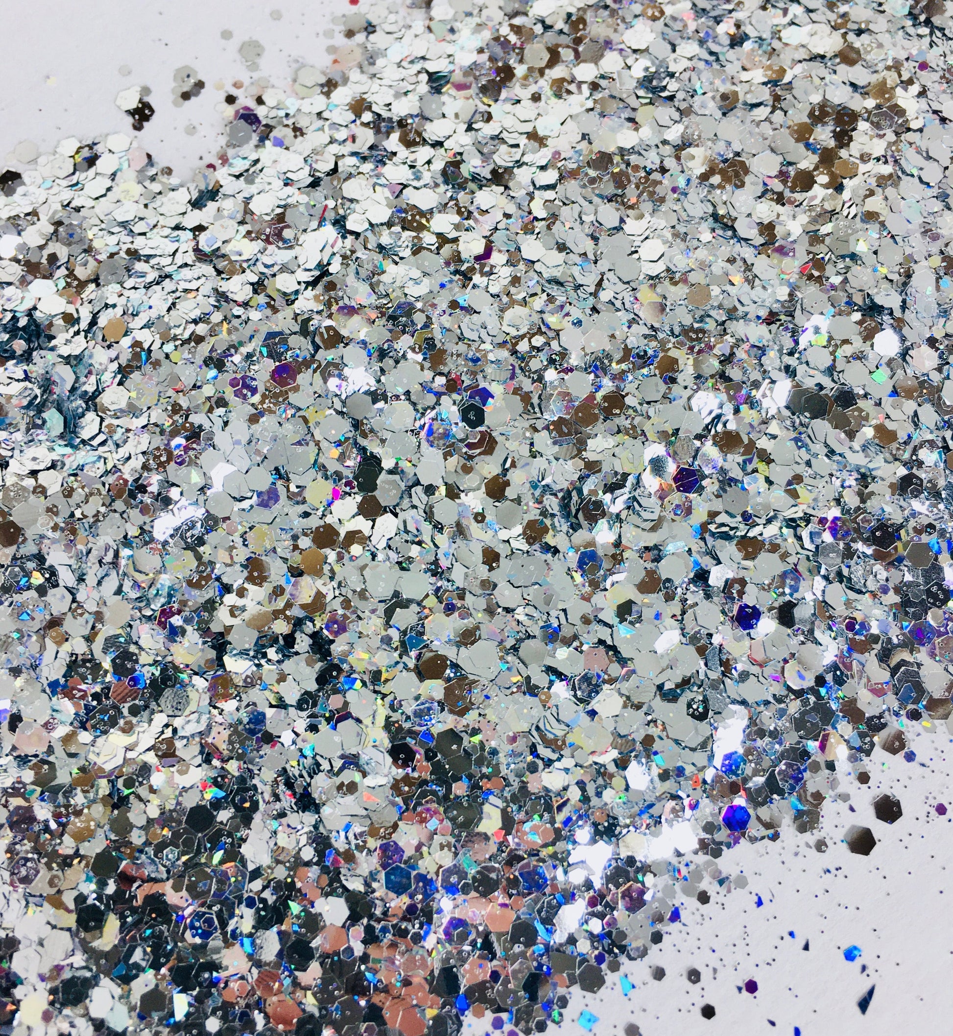 Photo shoot is a silver, holographic, high flash, chunky mix.