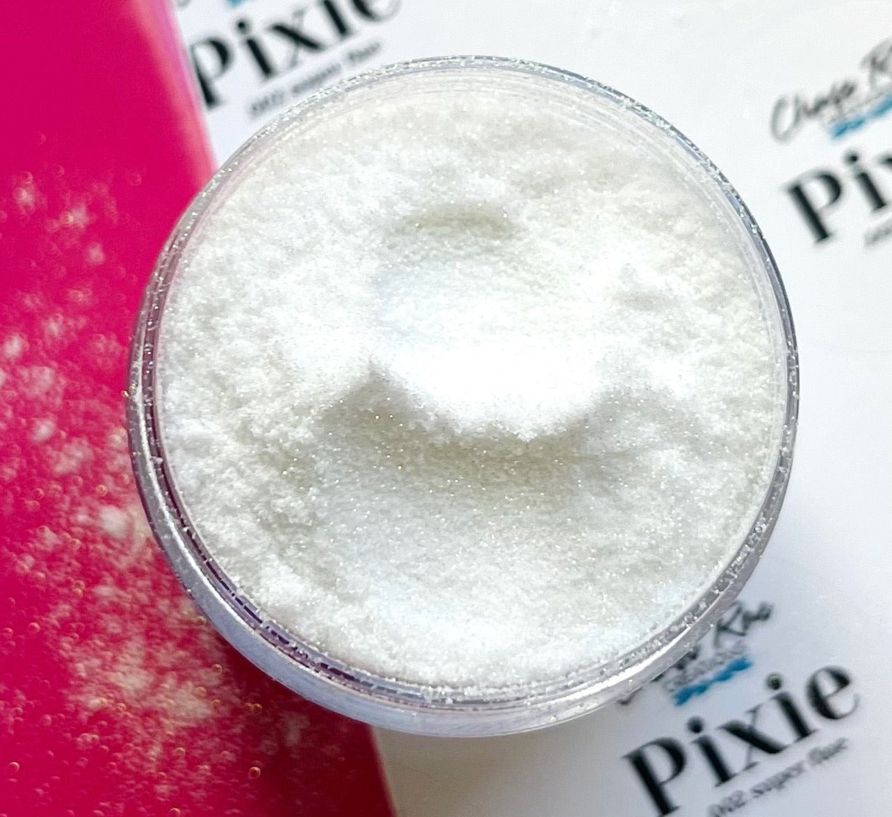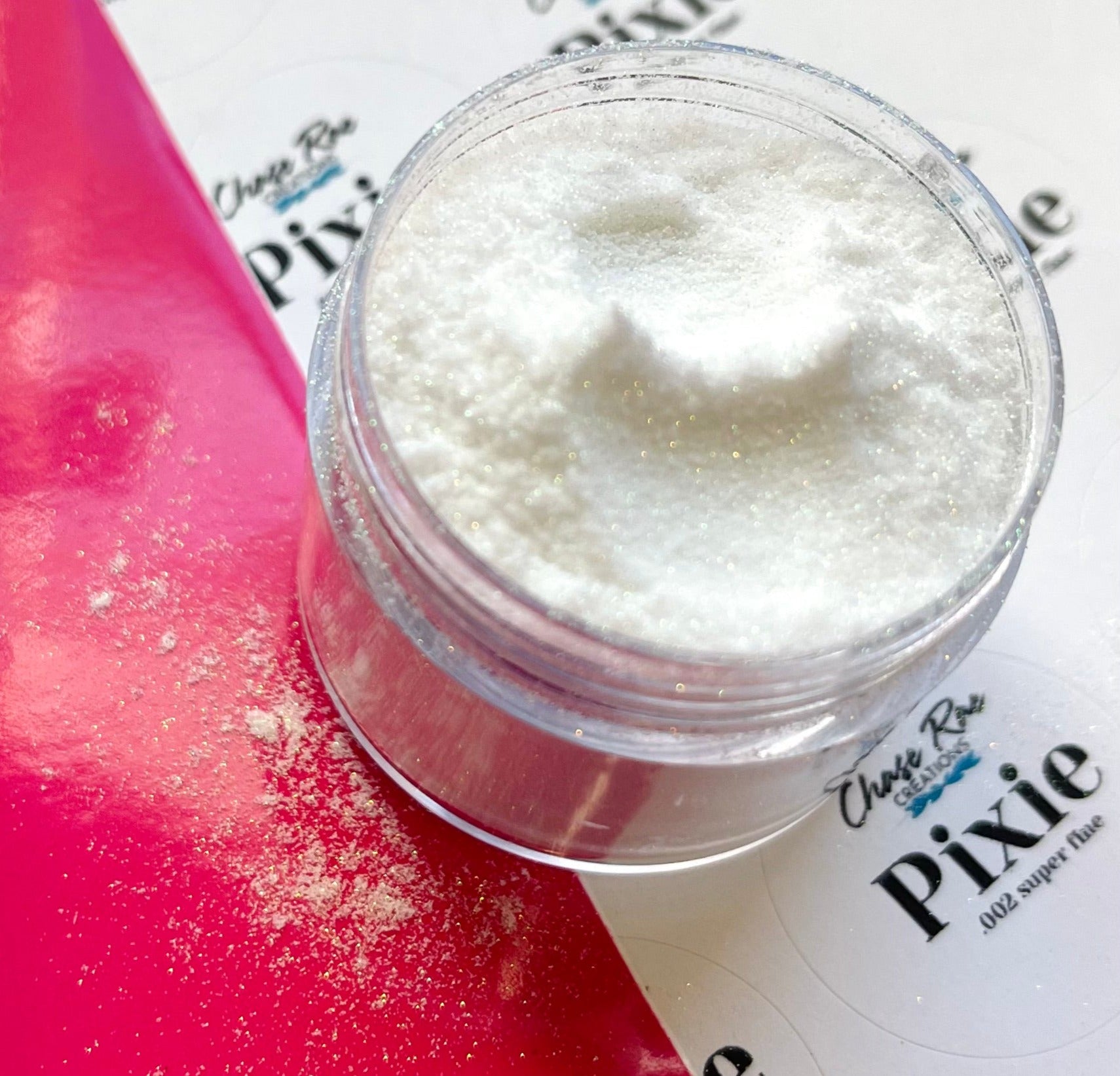 Pixie is an ultra fine white glitter. Super fine like a powder. It has a slight golden undertone. Considered an epoxy additive or perfect for the Tack-It Method!